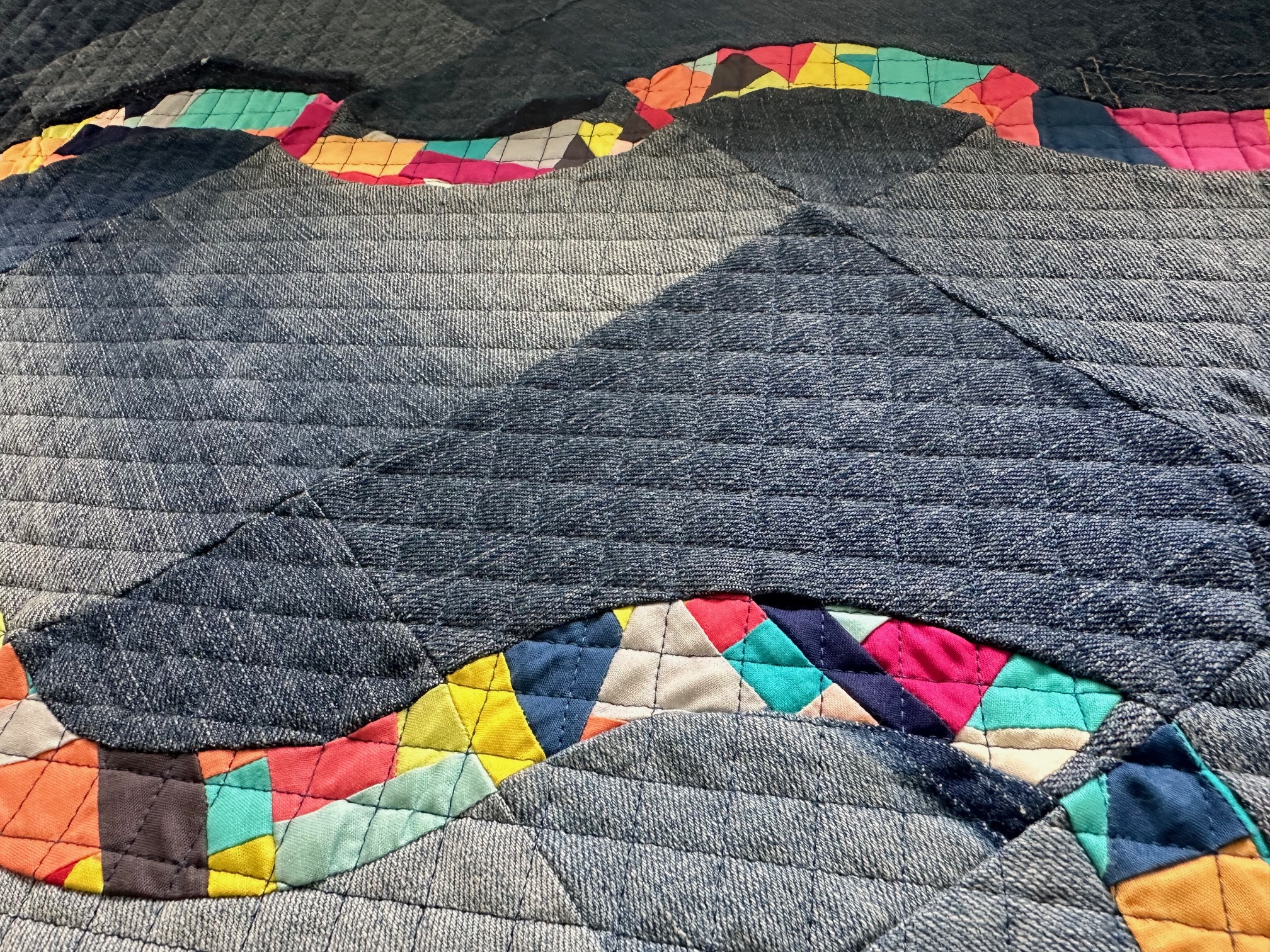 I know, easier said than done, but if you’re freemotion quilting your denim quilt, attempt to avoid quilting over the extremely bulky seams. While a good tip in general, sewing over areas with many denim intersections could result in skipped stitches, a distorted design, or even a broken needle for the thickest of seams. Before you start quilting, it is a good idea to identify which seams might be problematic before you get going, so that you can game plan in advance. It may not be possible to avoid every single bulky seam, but with enough planning, you might just be able to avoid a majority of them. You can see from the below picture where that tiny sliver of aqua is in the center that the seam there is extremely bulky. Given I was quilting an all-over design, sometimes these areas were unavoidable, but I was very glad I didn’t need to sew over that seam. If I were freemotion quilting and not doing an all-over design, I would have very intentionally avoided that area.