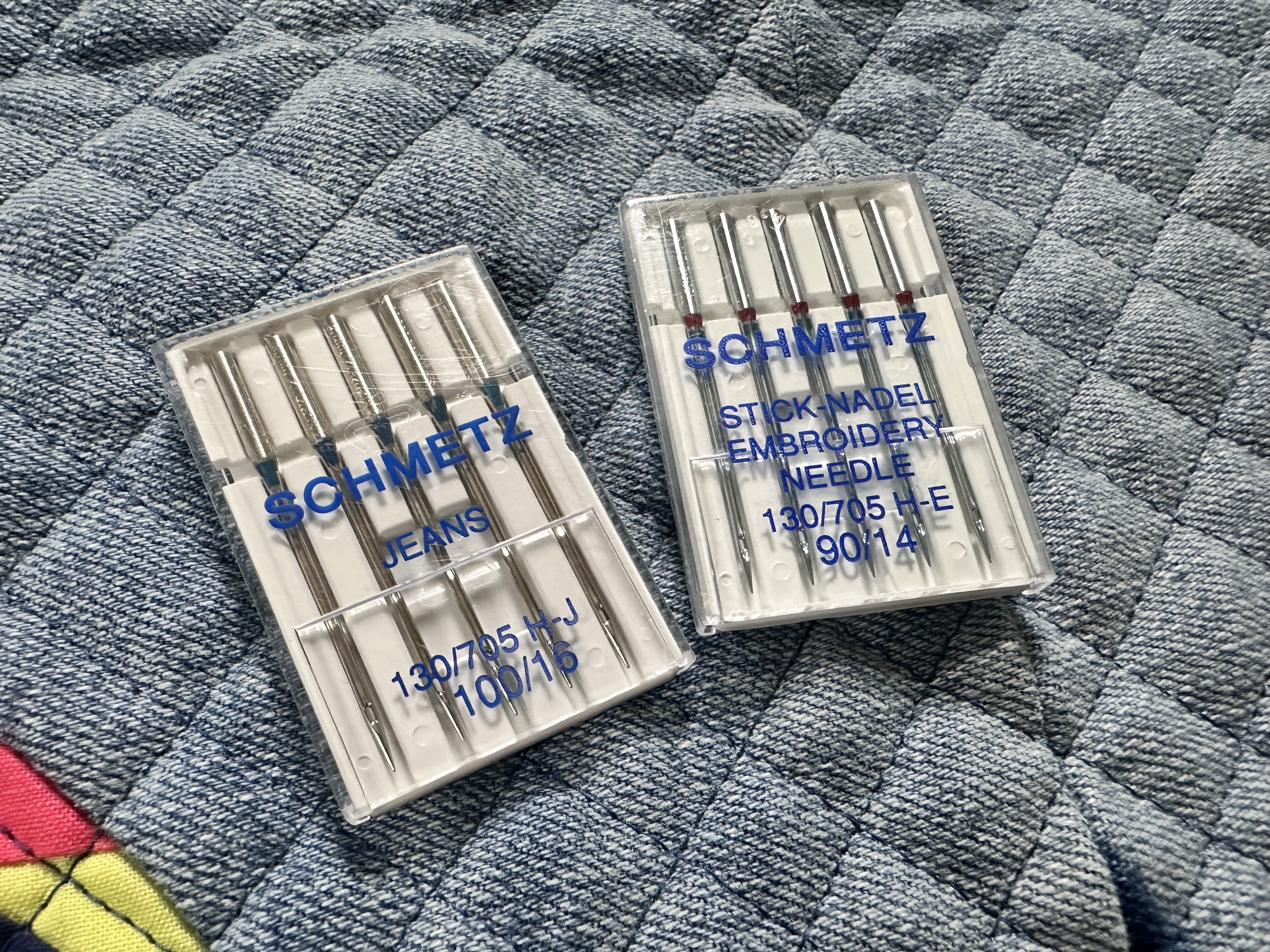 Use the right needle! And make sure you’re using a fresh, brand-new needle. What is the right needle to use? I’m a big fan of using embroidery needles because they have a fine tapered point, but denim needles are also great for quilting denim quilts. Personally, I use a 90/14 needle because I like having a slightly thicker needle to punch through such thick fabric, but an 80/12 or even a larger 100/16 needle would work too.
