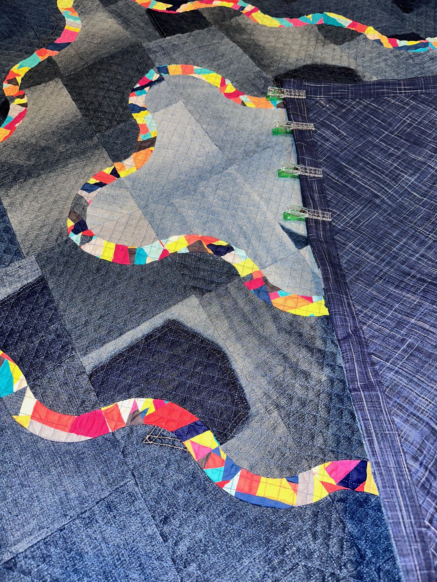 Denim tends to stretch, especially today’s denim, where many of us wear stretchy denim for comfort. To help combat all of this stretching, I recommend basting not only the edges of your quilt but about every 6”-8” of the quilt to avoid distorting the quilt as you go.