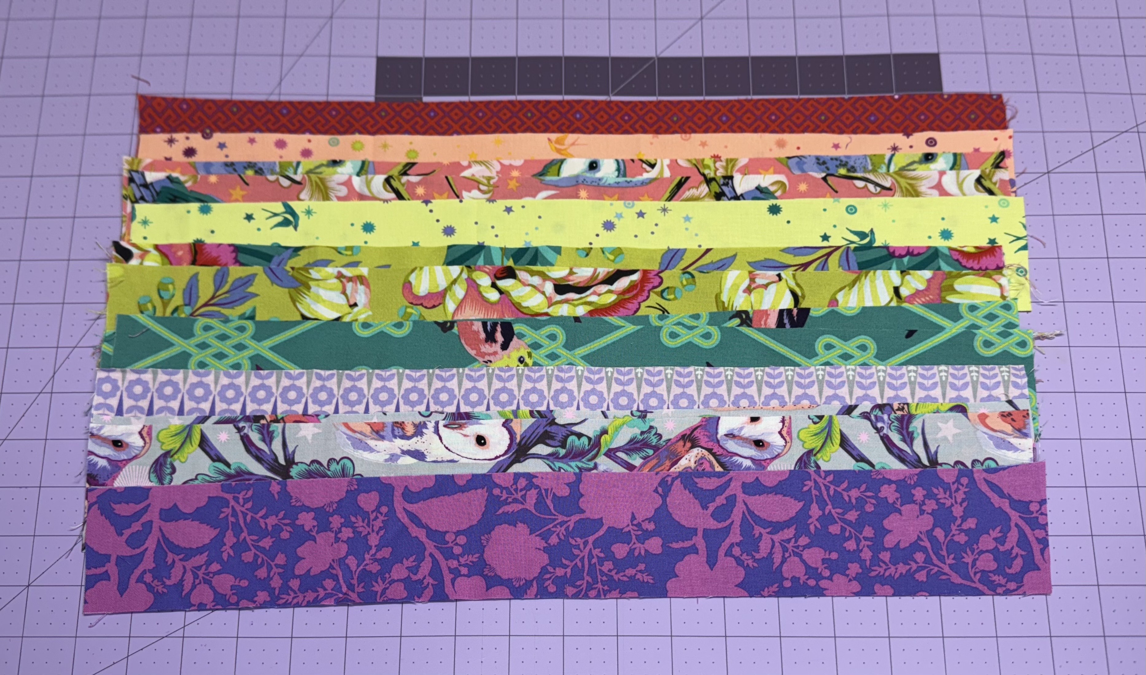 If not using pre-cut strips, cut (2) strips measuring 2½” W x 18” L from each fabric. Alternatively, you can use 18 different fat quarters, cutting (1) strip from each, or use 18 unique Jelly Roll strips.