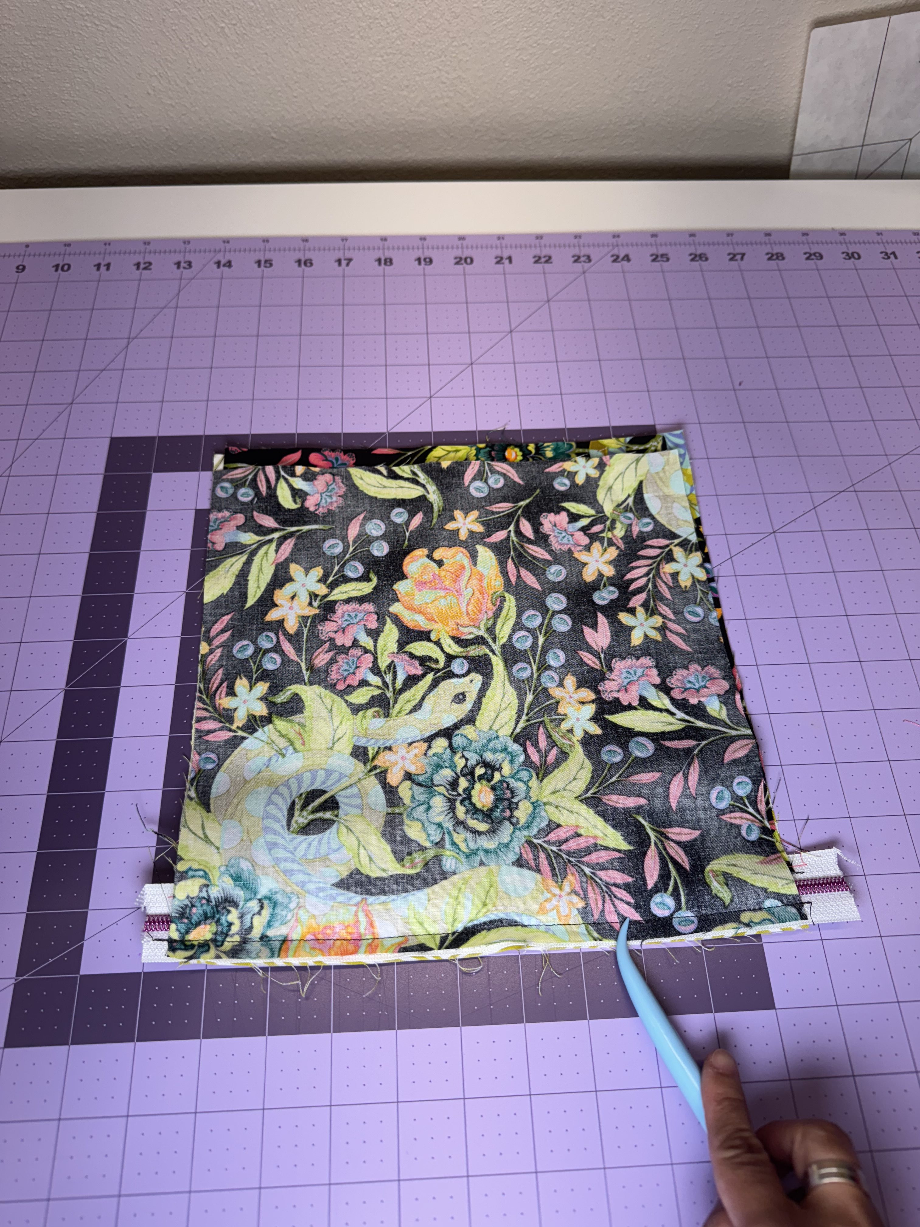 Take two of the 10” squares. Sandwich 2 fabric squares right sides together with the top edge of the zipper tape. Pin or baste in place. Sew using a ⅜” seam allowance.