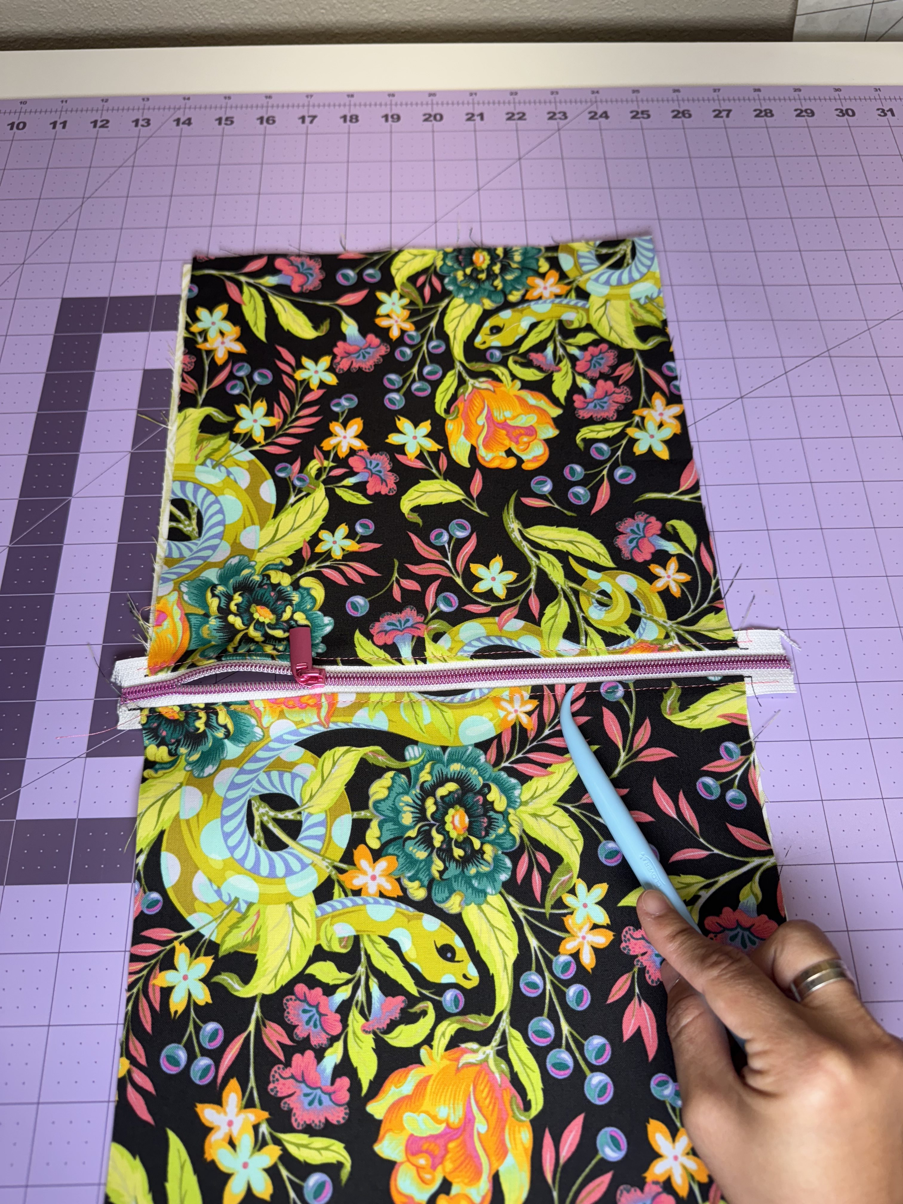 Fold the fabric away from the zipper (wrong sides together) and press. Topstitch along the seam using a ⅛” or ¼” seam allowance.