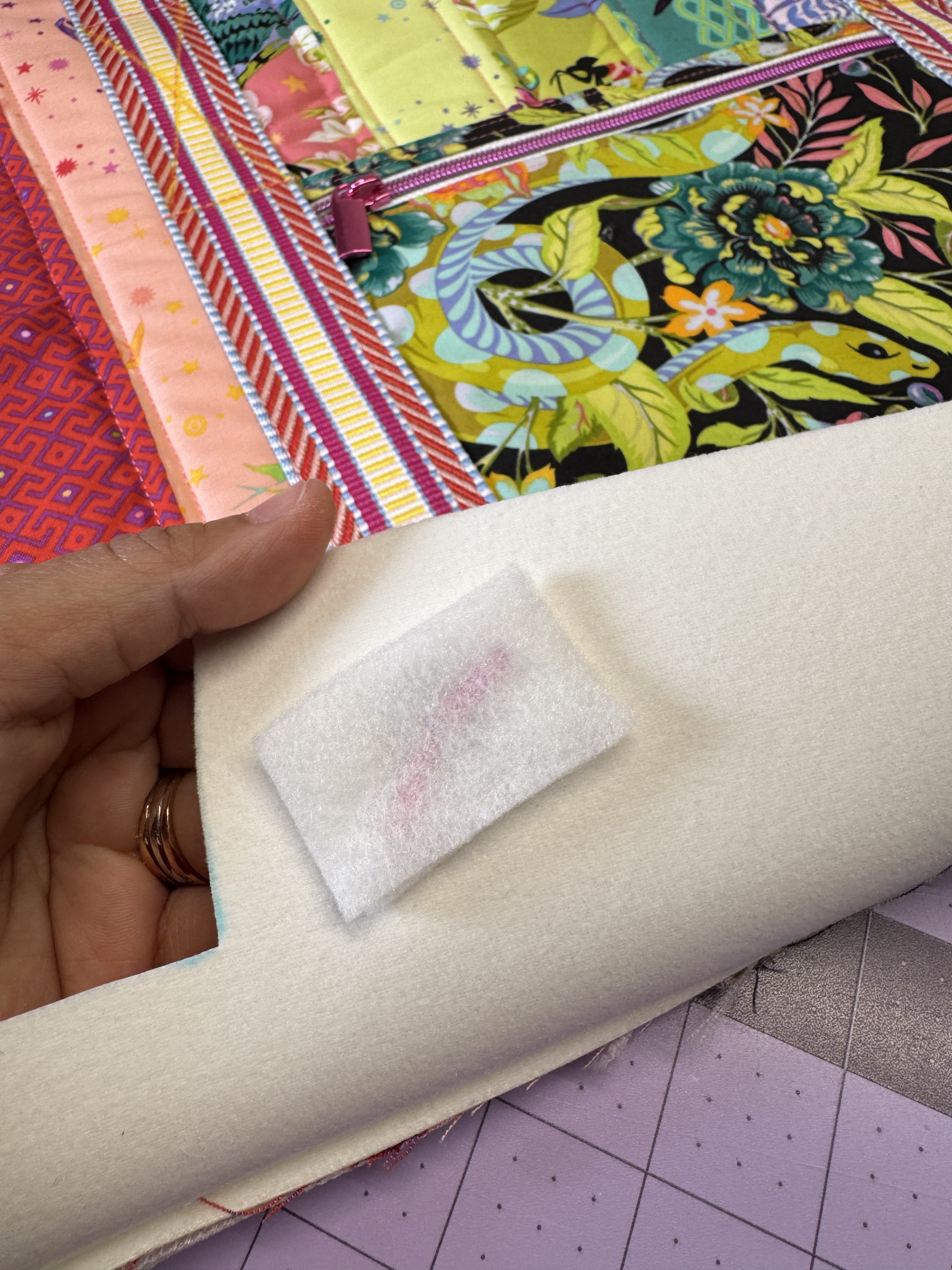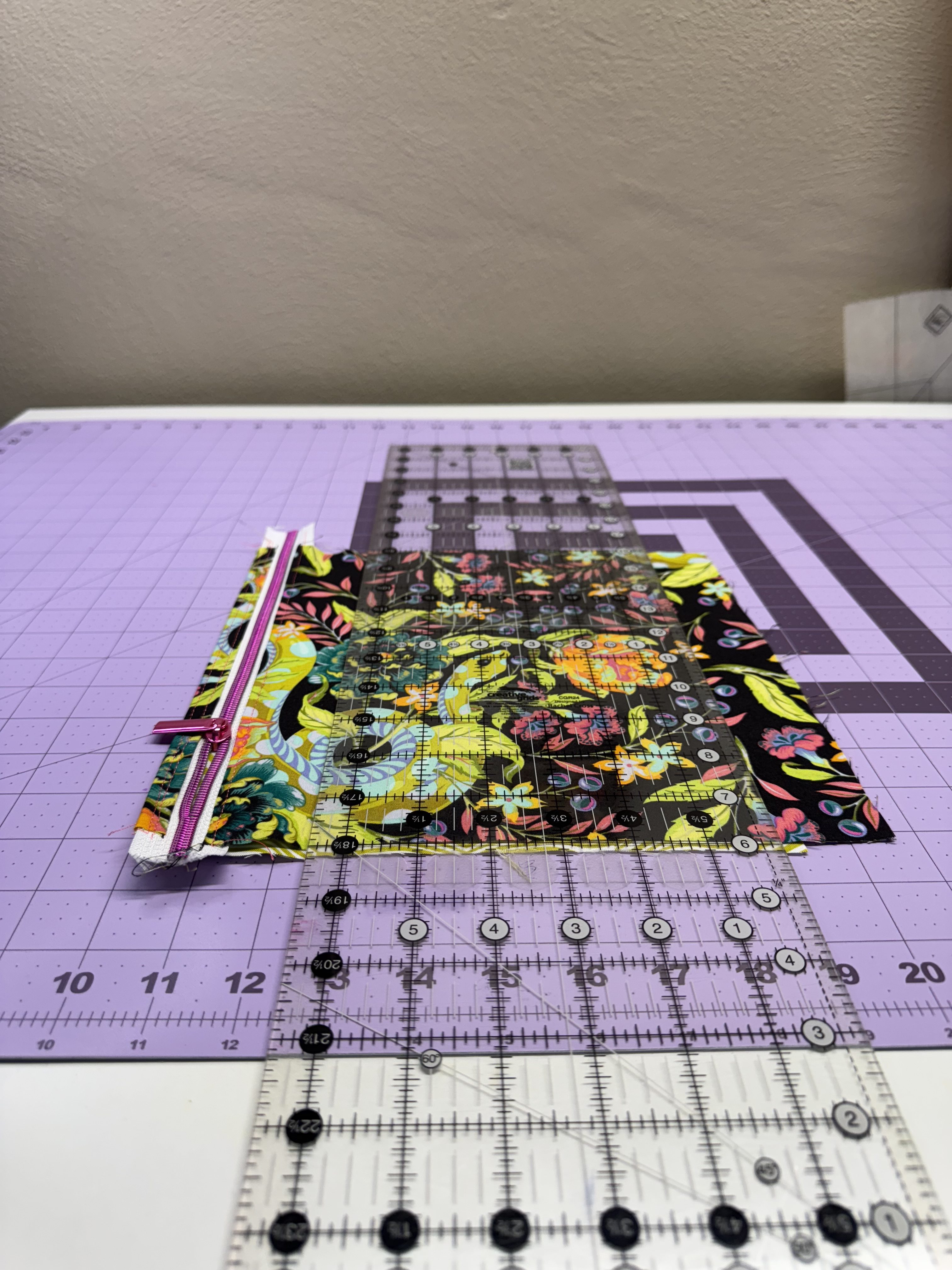 Trim the bottom and side edges of the completed zipper pocket to measure 9” wide by 9” tall, keeping the top edge with the zipper untrimmed. Topstitch along the two sides and bottom edges to secure the pocket layers together. Set aside for later use.