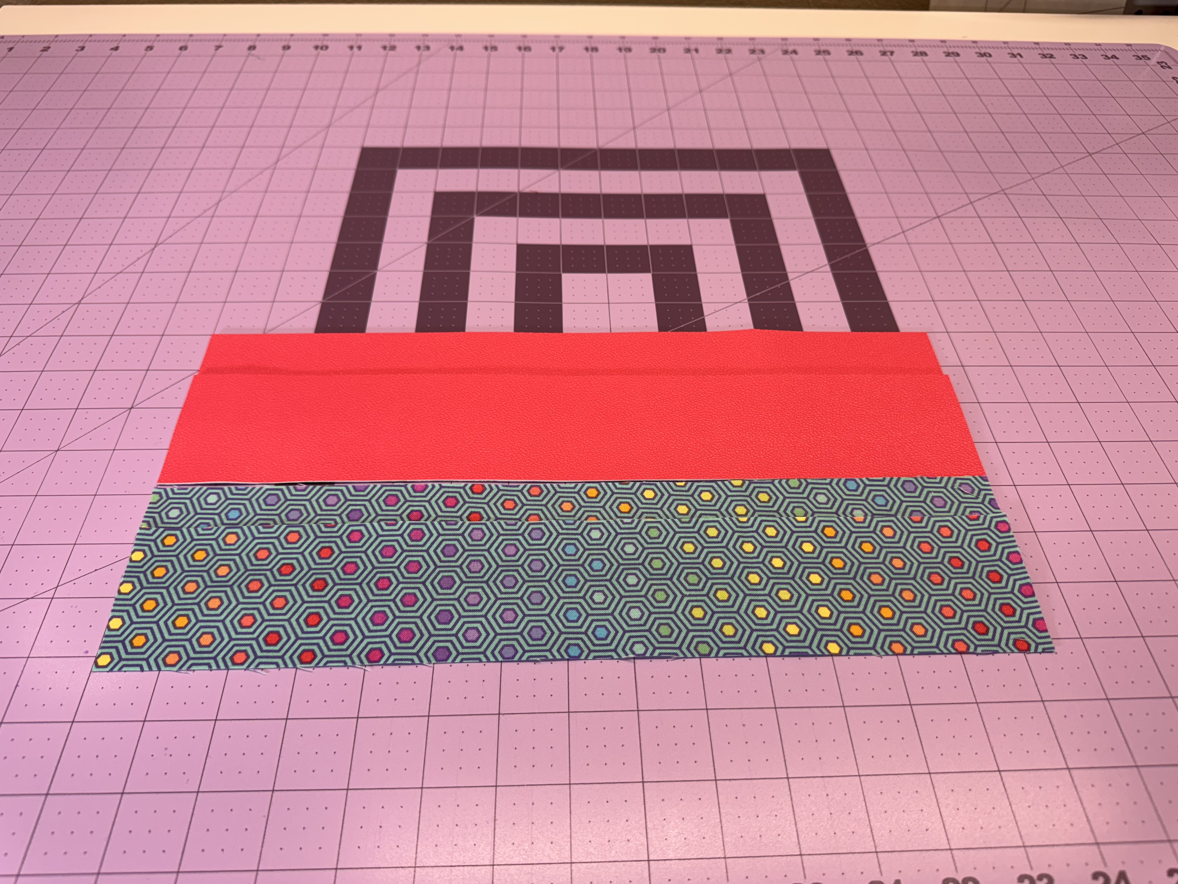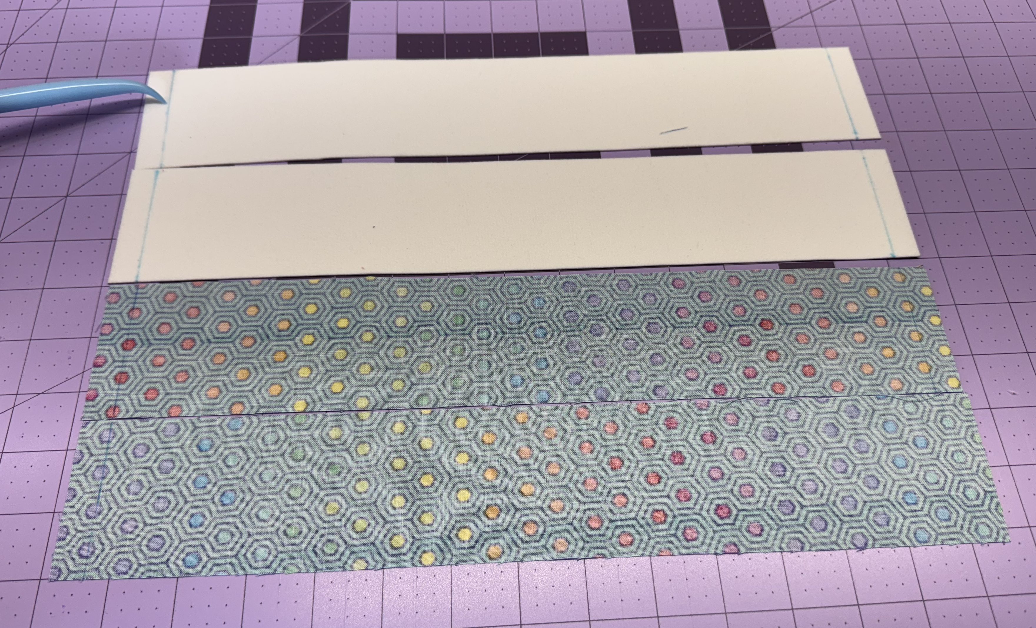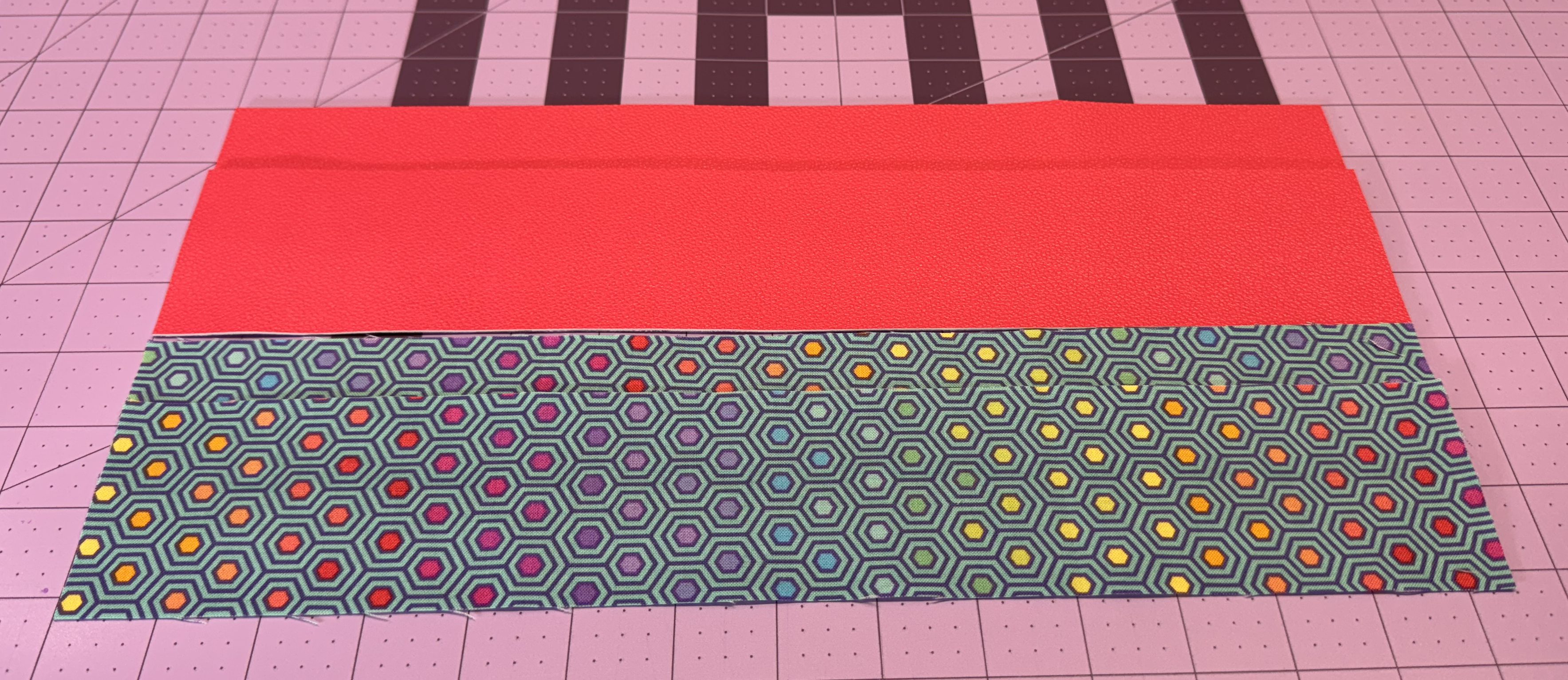 Draw a ½” line along the short edges of both the vinyl and fabric strips. Fold the raw edge in toward the line and press or clip in place.
