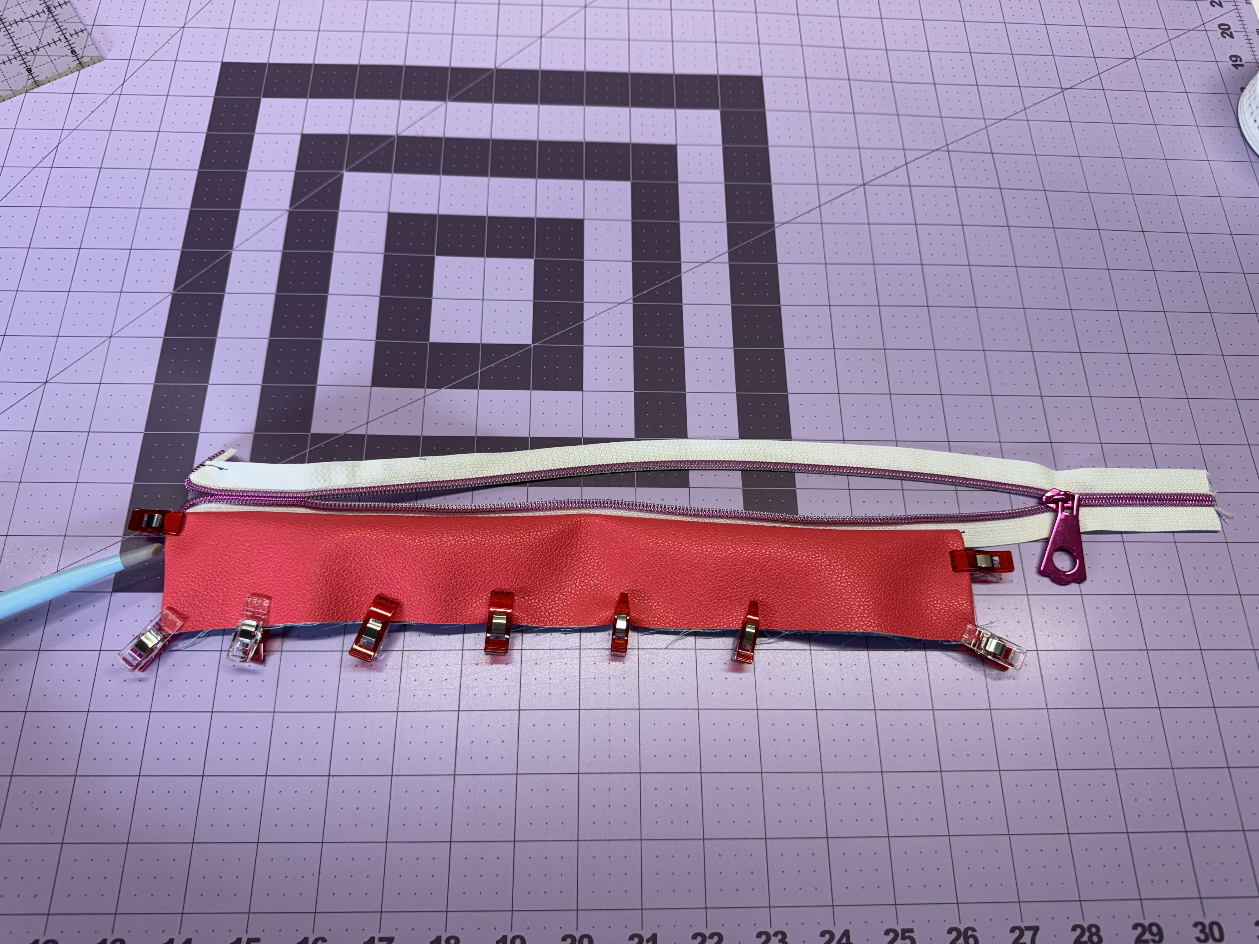 Take the second main vinyl strip and place it right side up.Lay the zipper panel you just assembled on top, with the zipper right side down (so it sandwiches between fabrics again).