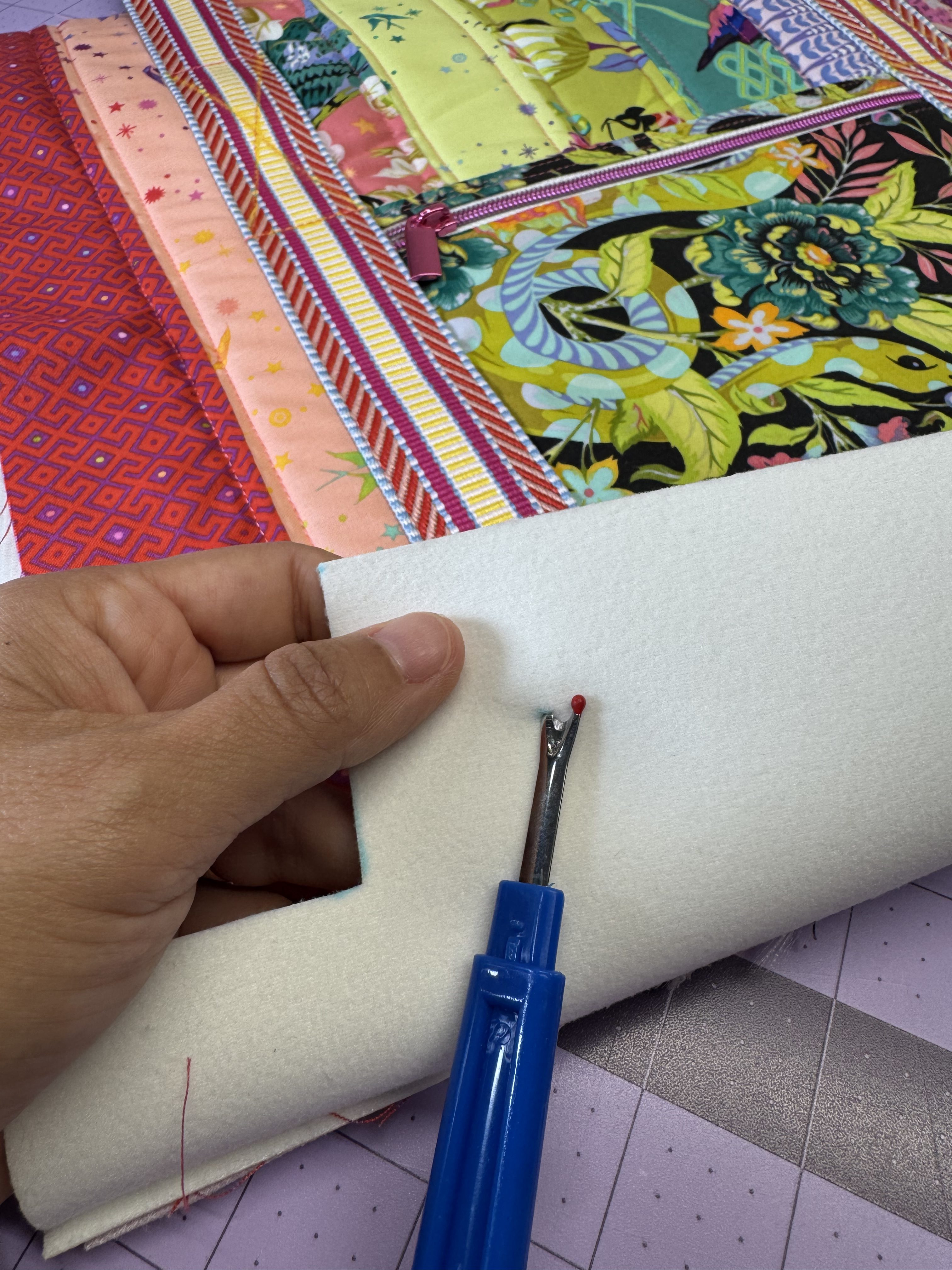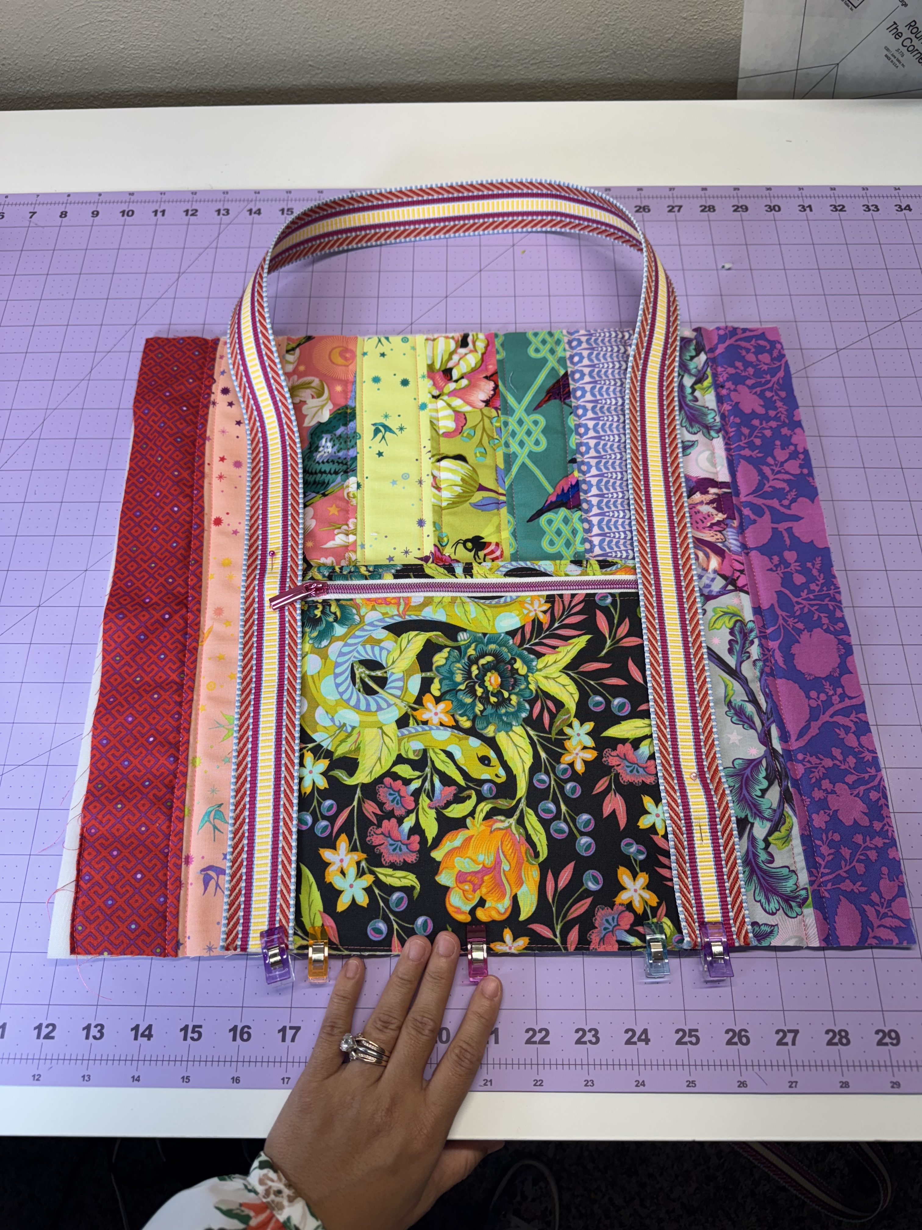 At the top of the zipper pocket (beginning at the pocket’s top edge), topstitch an X-box (a box with an X inside) up to the 4” mark to reinforce the handle area.