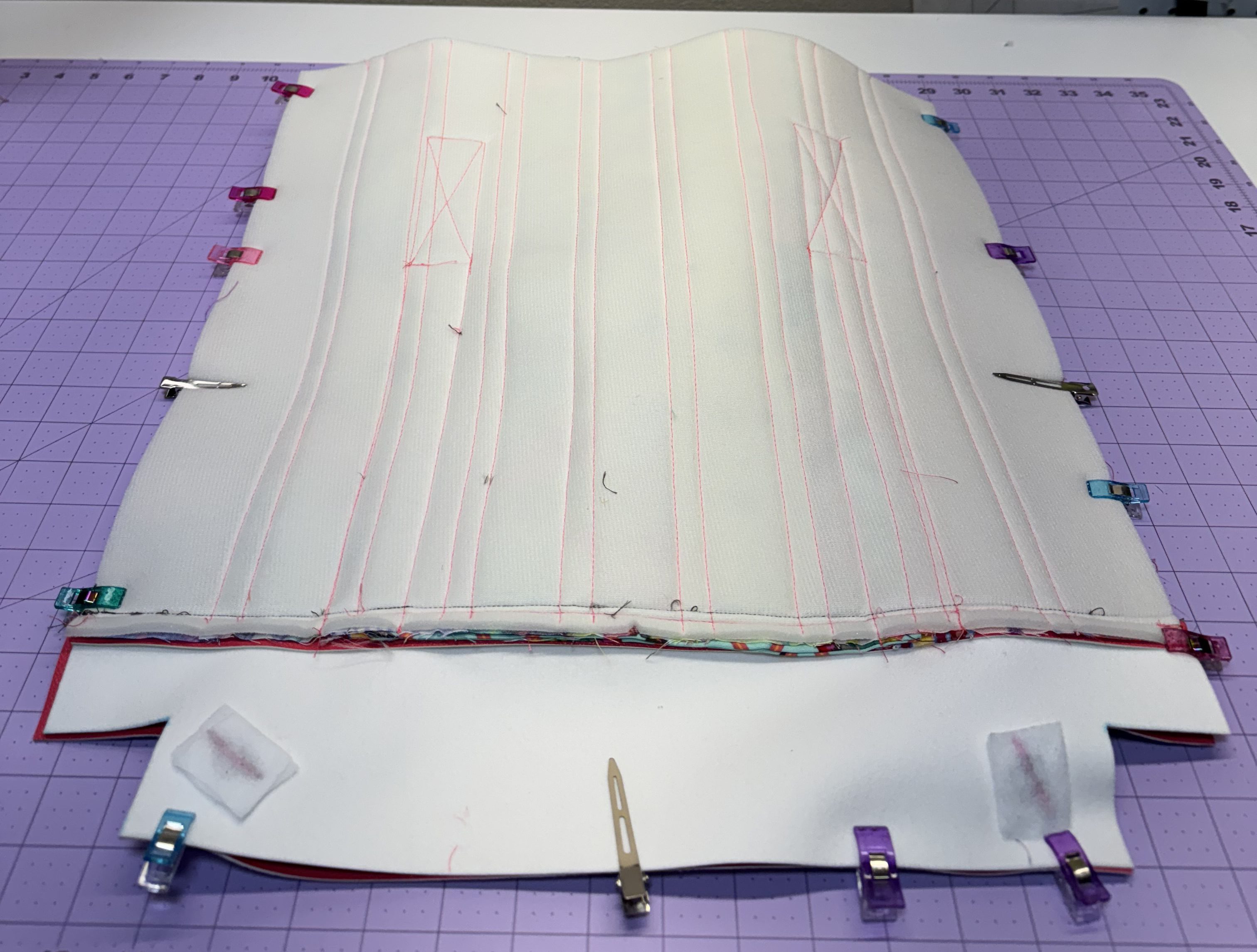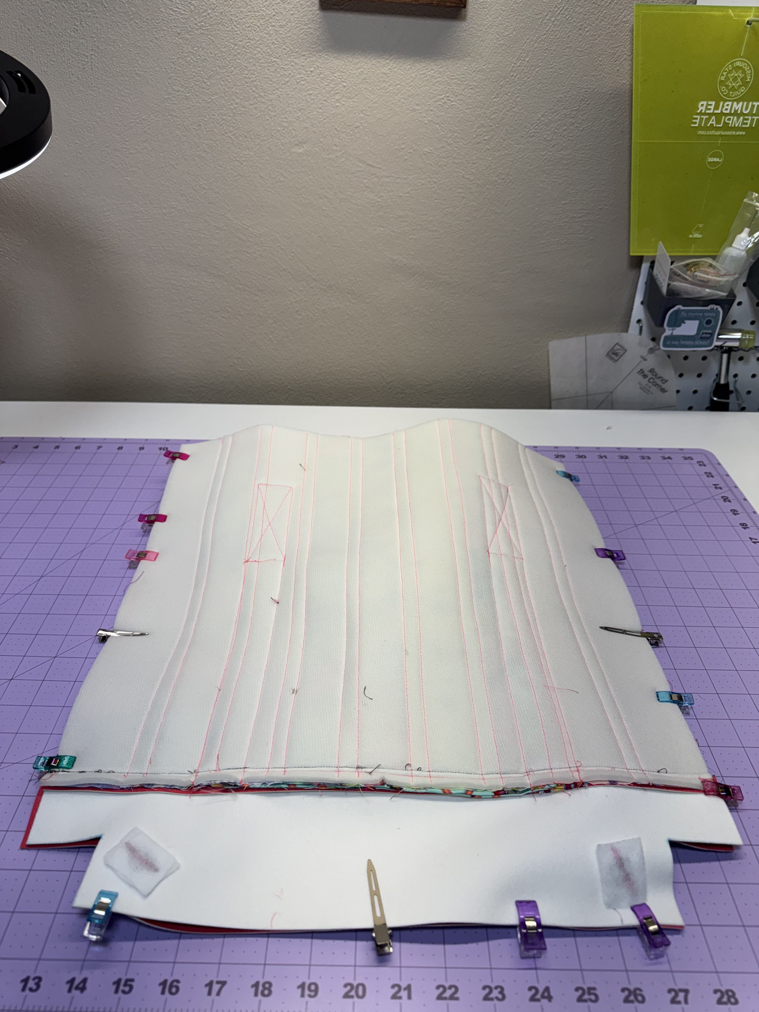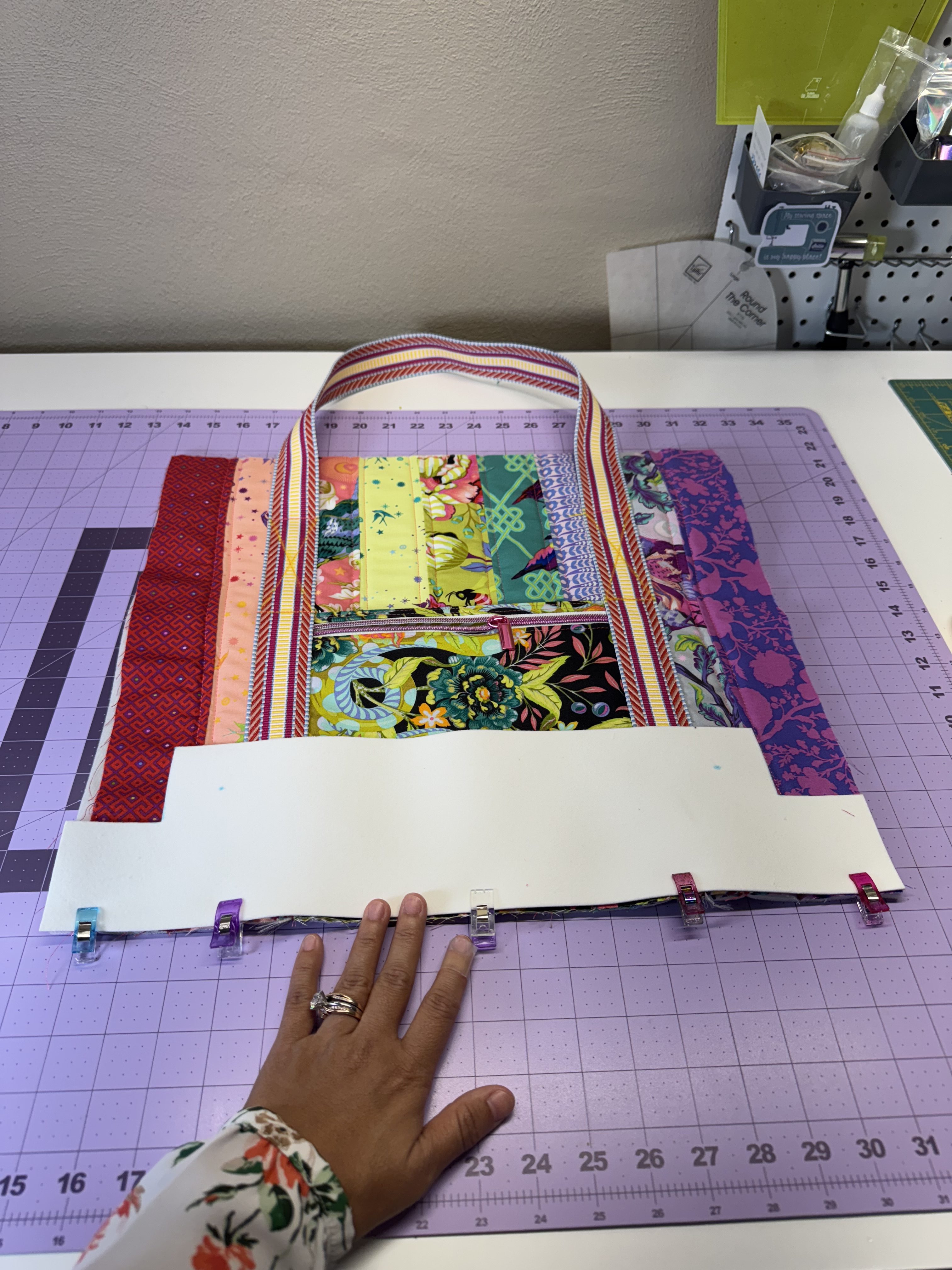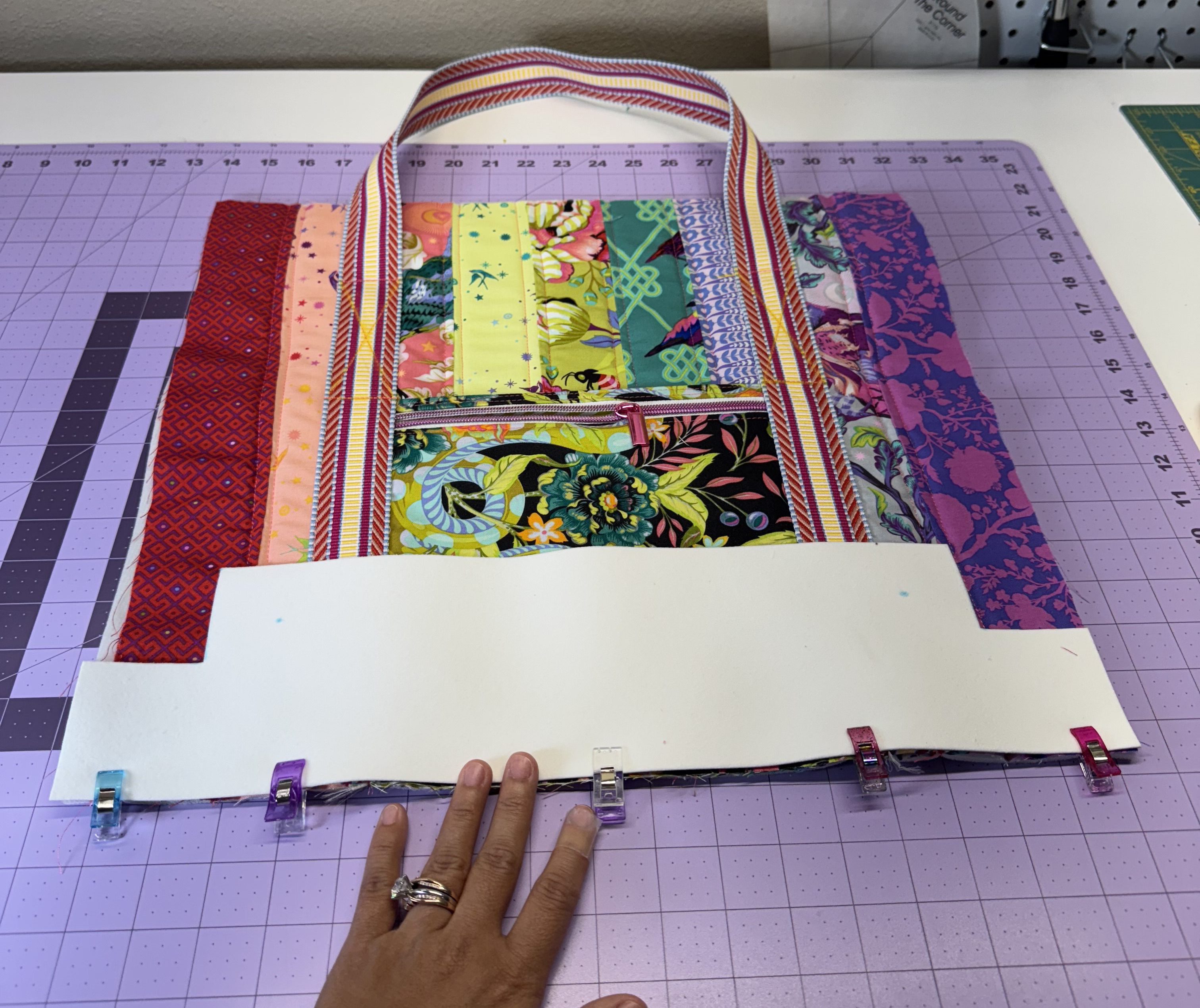 Center the zipper pocket on the bottom of the panel, aligning the bottom edges, and clip in place.