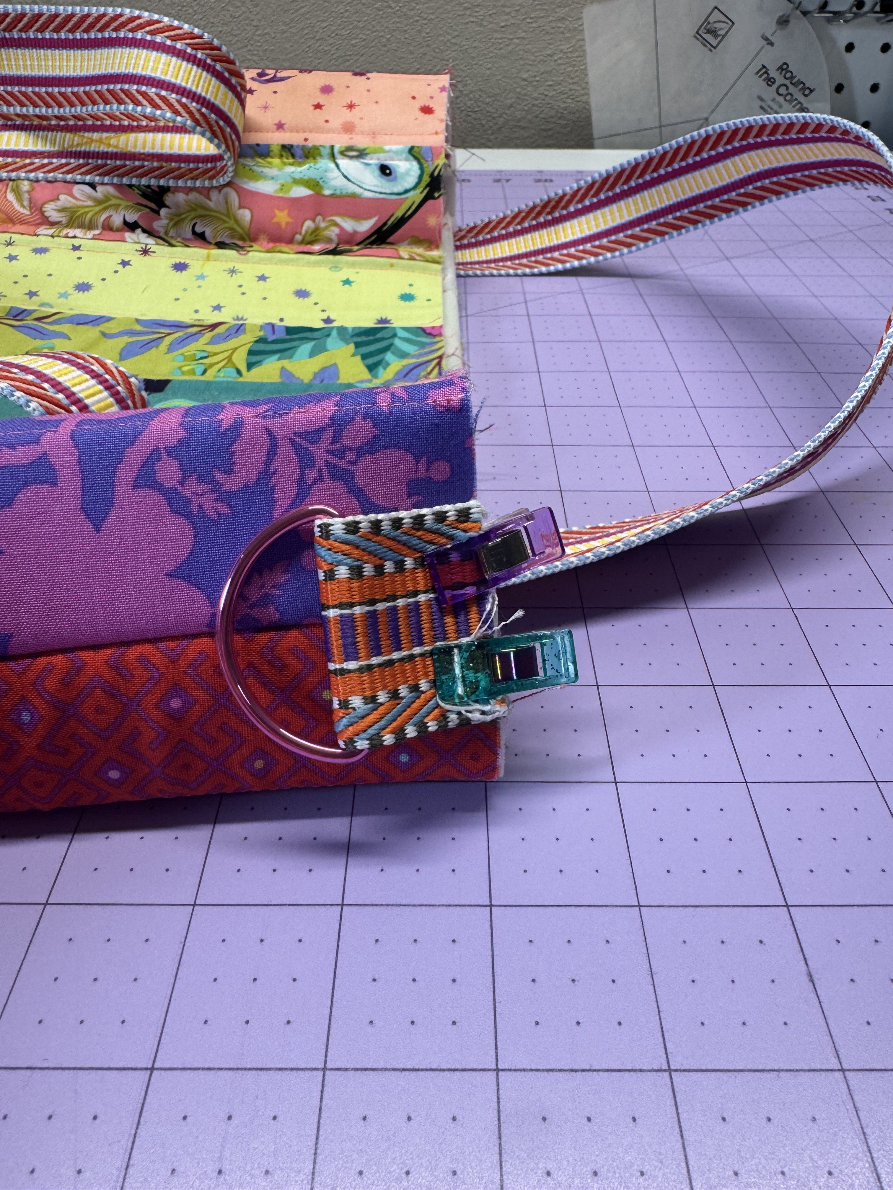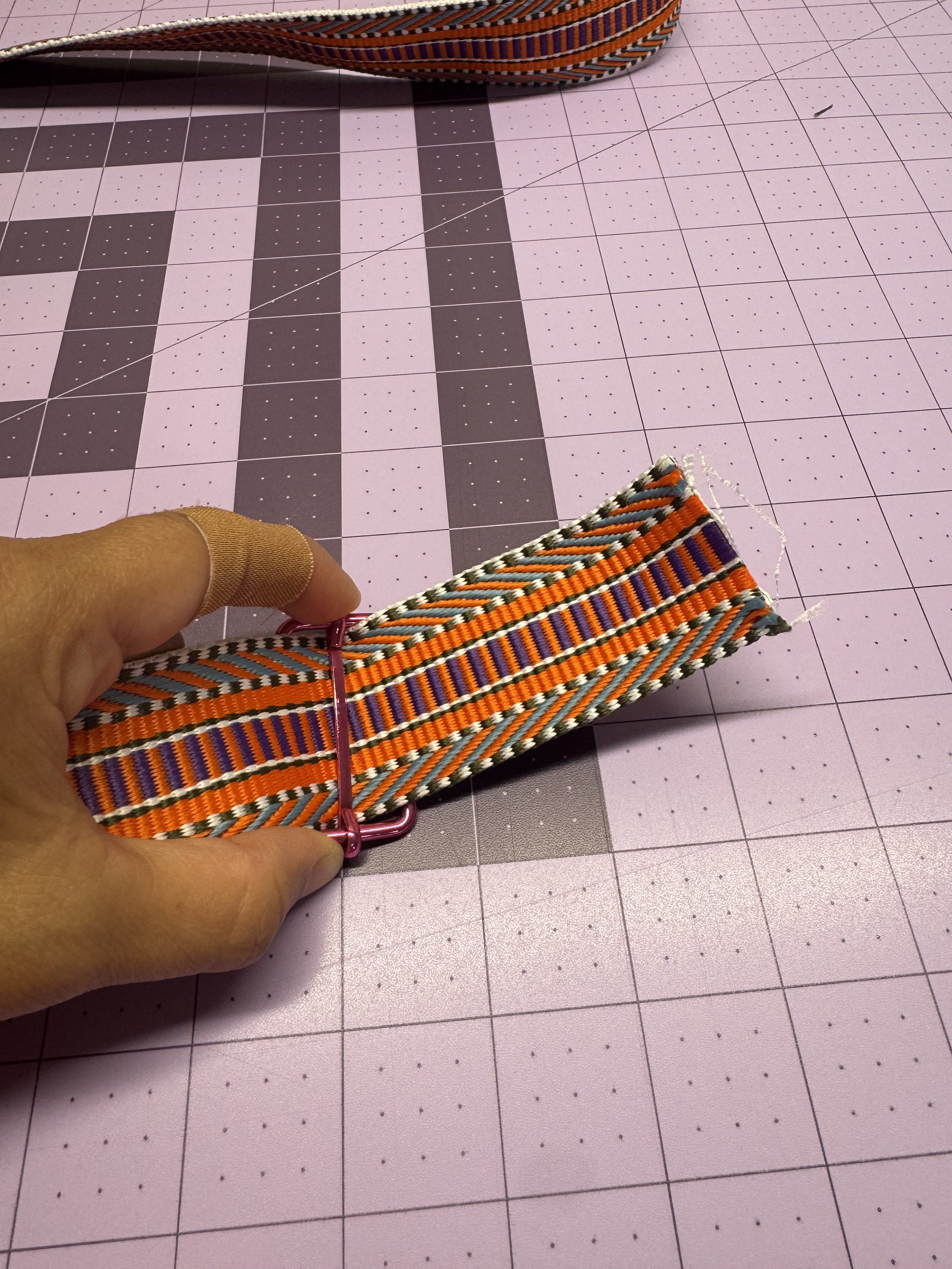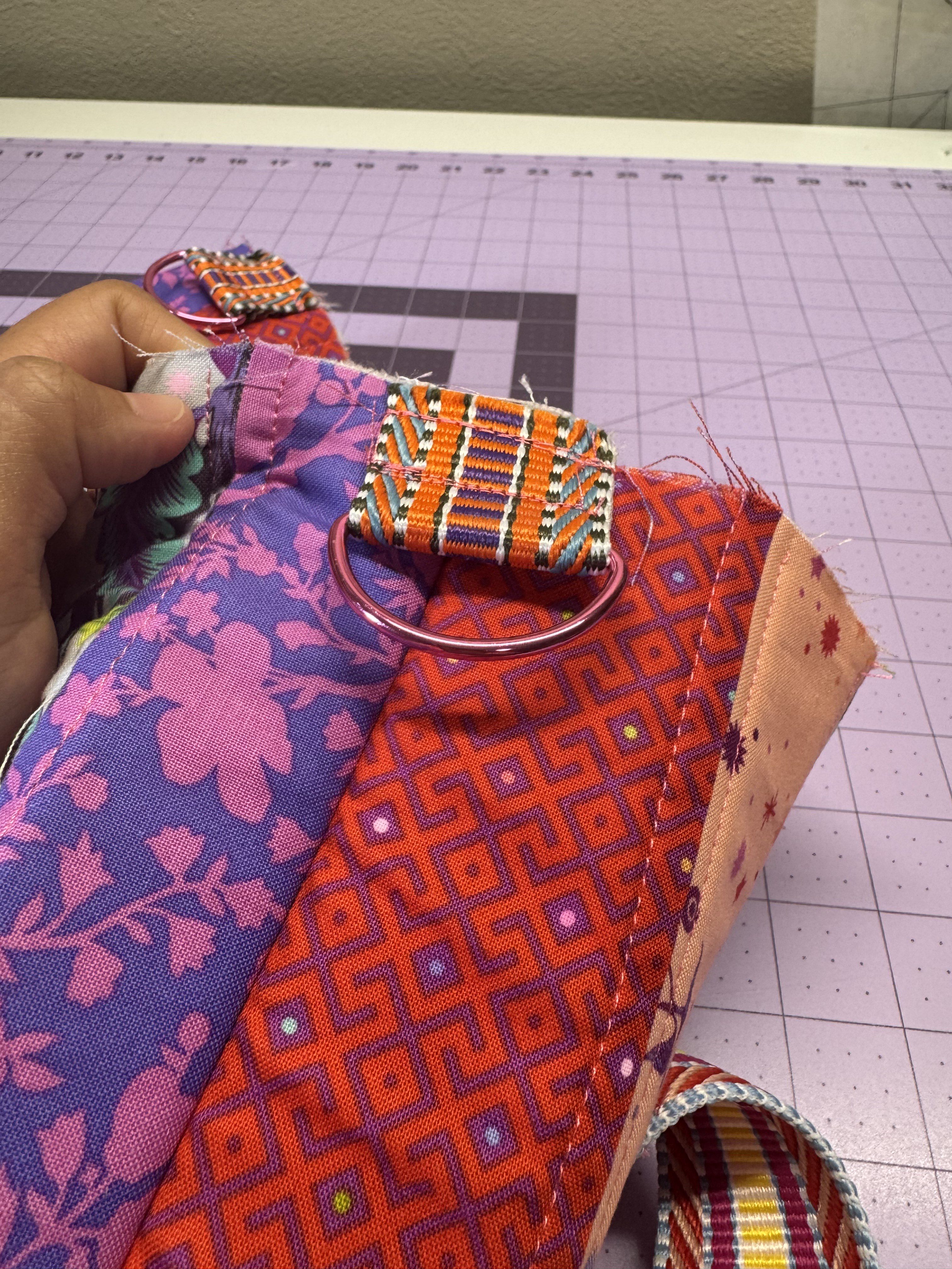 Insert one strip through a D-ring, folding it in half so the raw ends align. Topstitch across the webbing as close to the D-ring as possible to secure it in place.