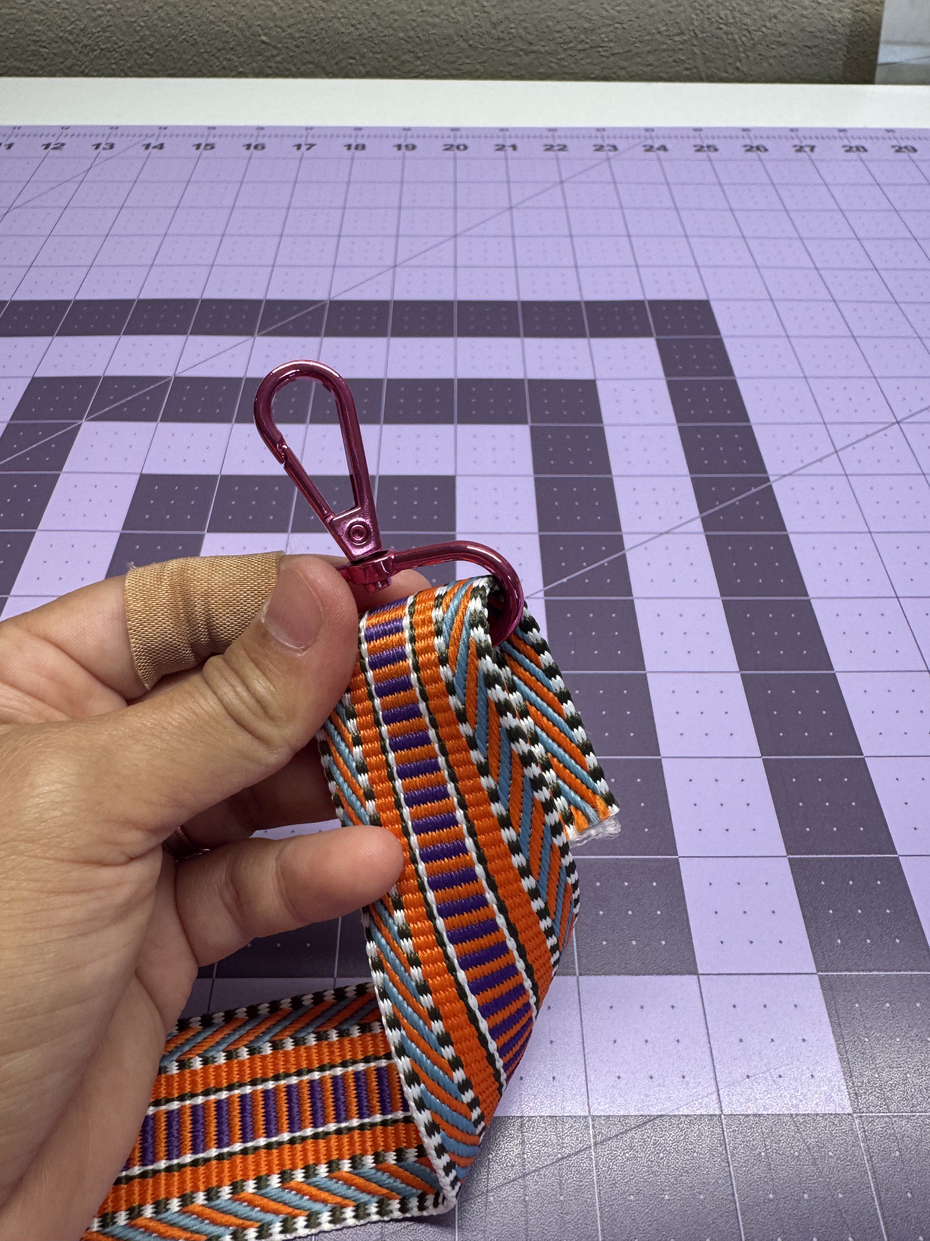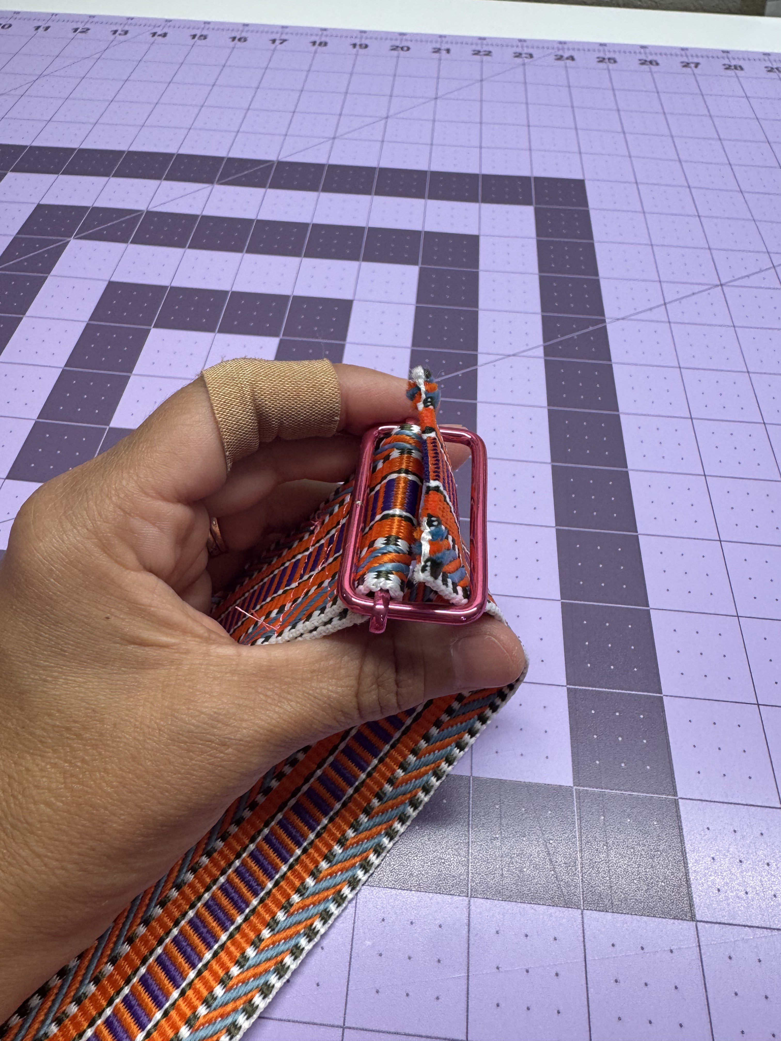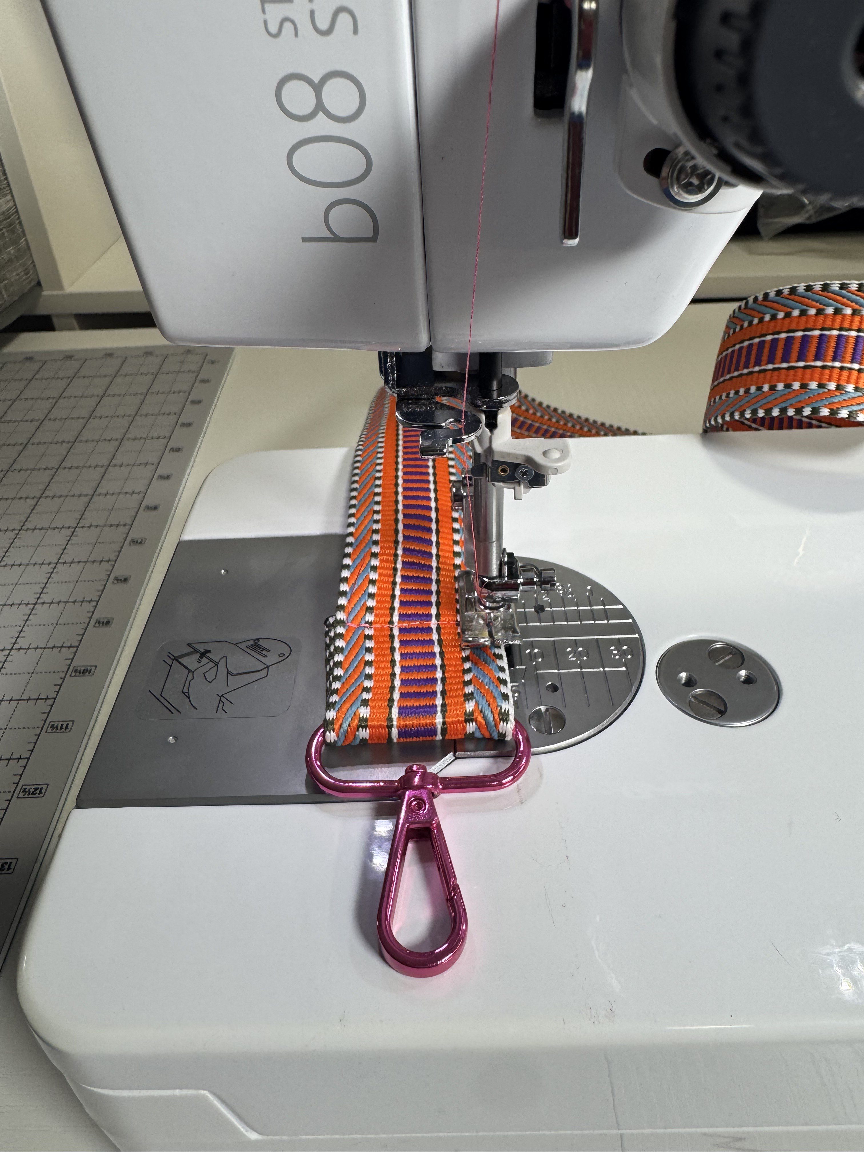 Insert one strip through a D-ring, folding it in half so the raw ends align. Topstitch across the webbing as close to the D-ring as possible to secure it in place.