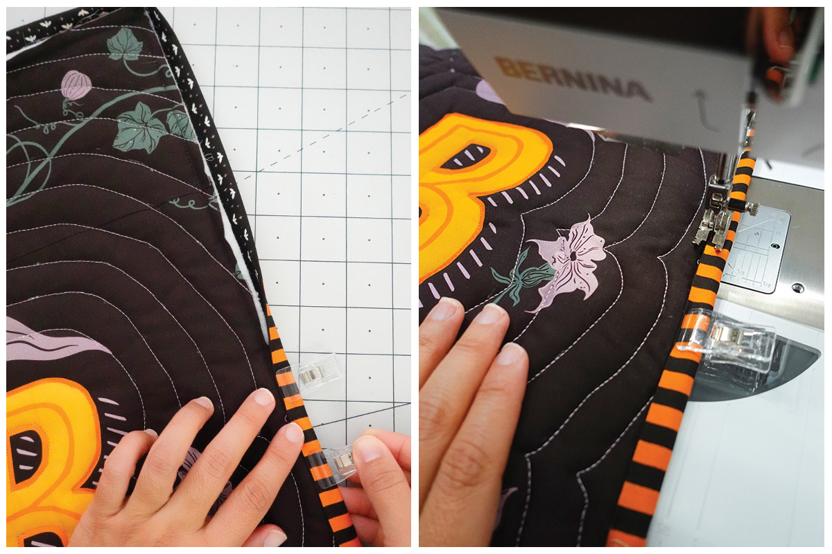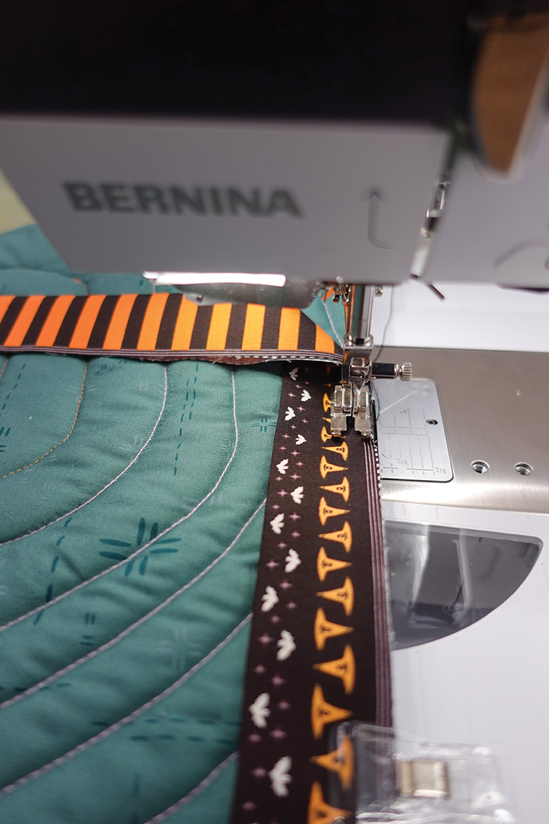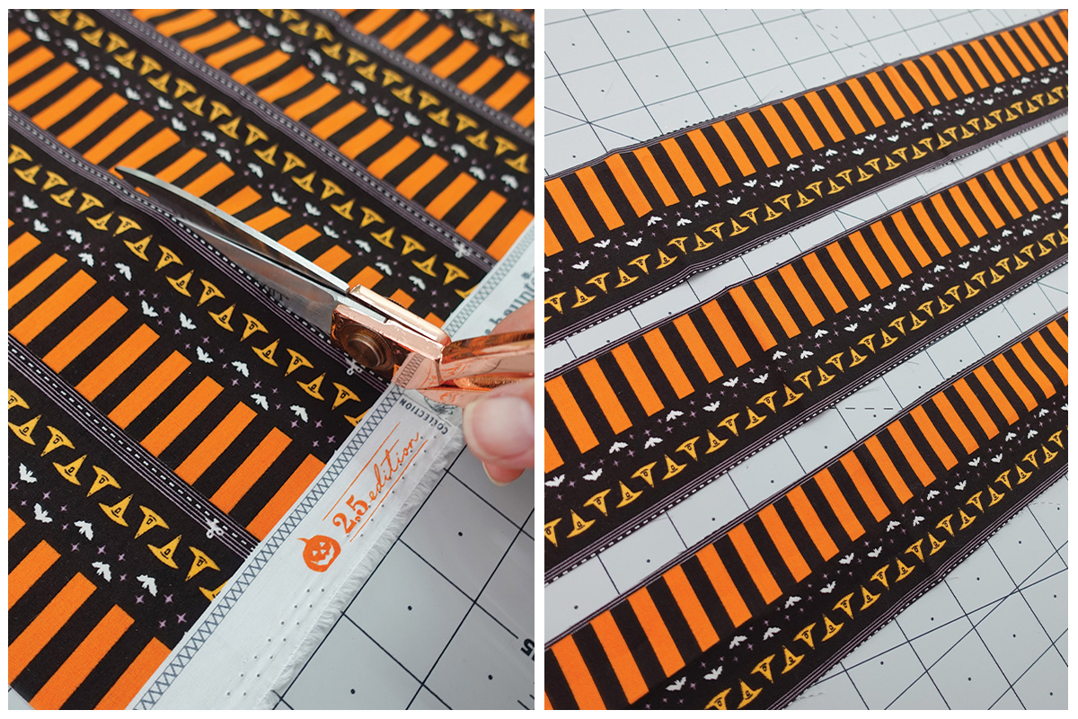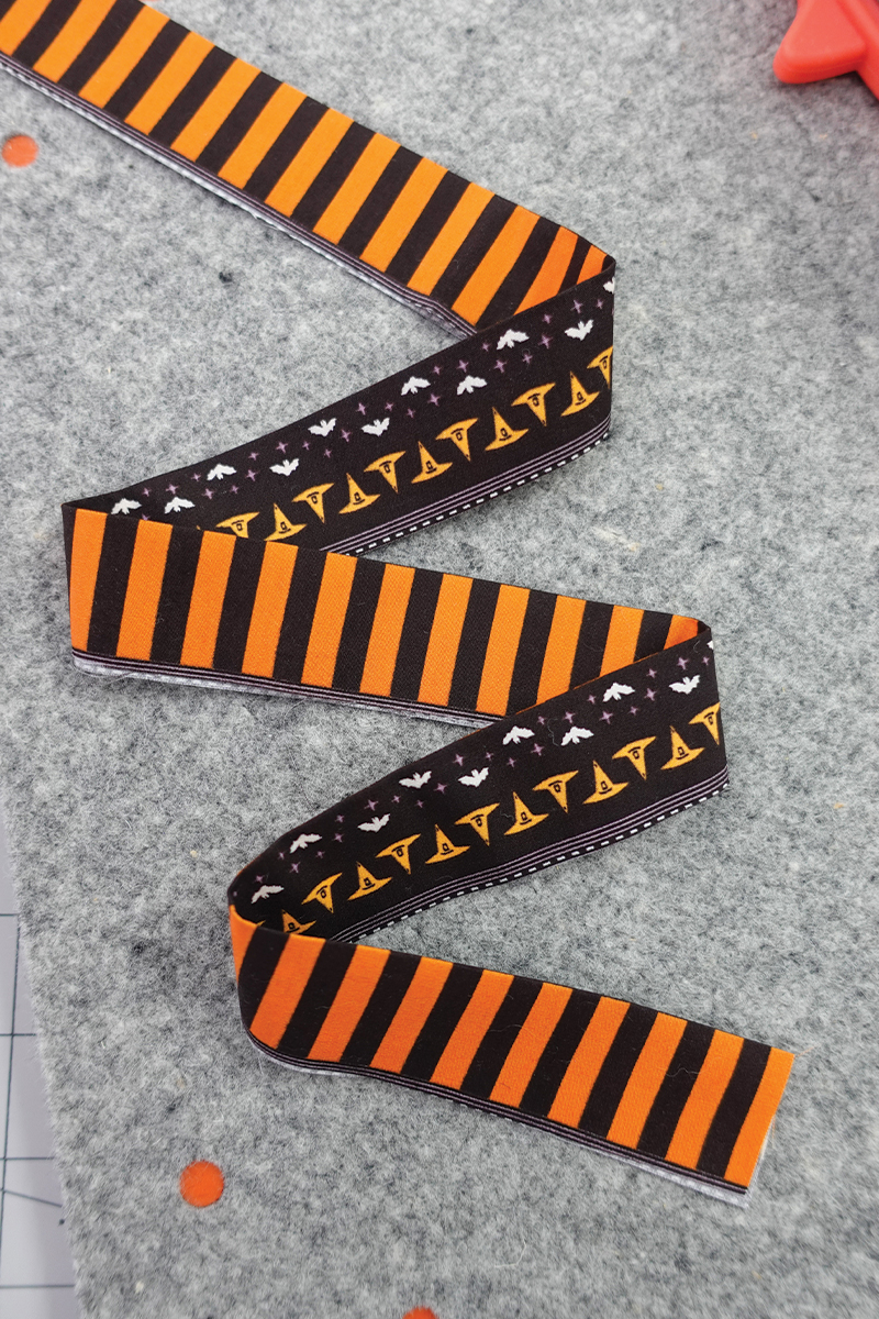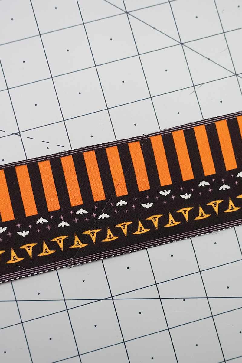 Vamos a usar las franjas naranjas y negras para enmarcar este proyecto. Con el revés del proyecto hacia arriba, coloca la tira con el diseño de murciélagos/sombreros hacia arriba y cose la tira de encuadre como un quilt regular con un margen de costura de un cuarto de pulgada (¼”), haz inglete en las esquinas y une los extremos con tu método favorito.
