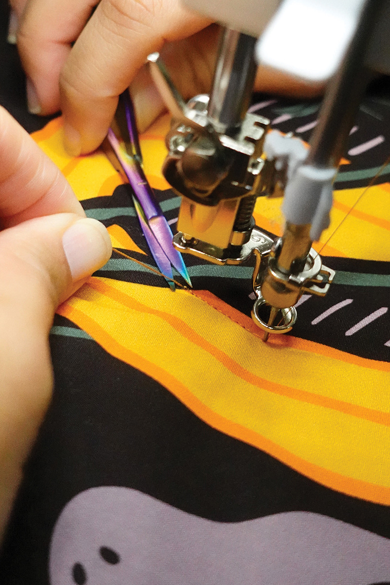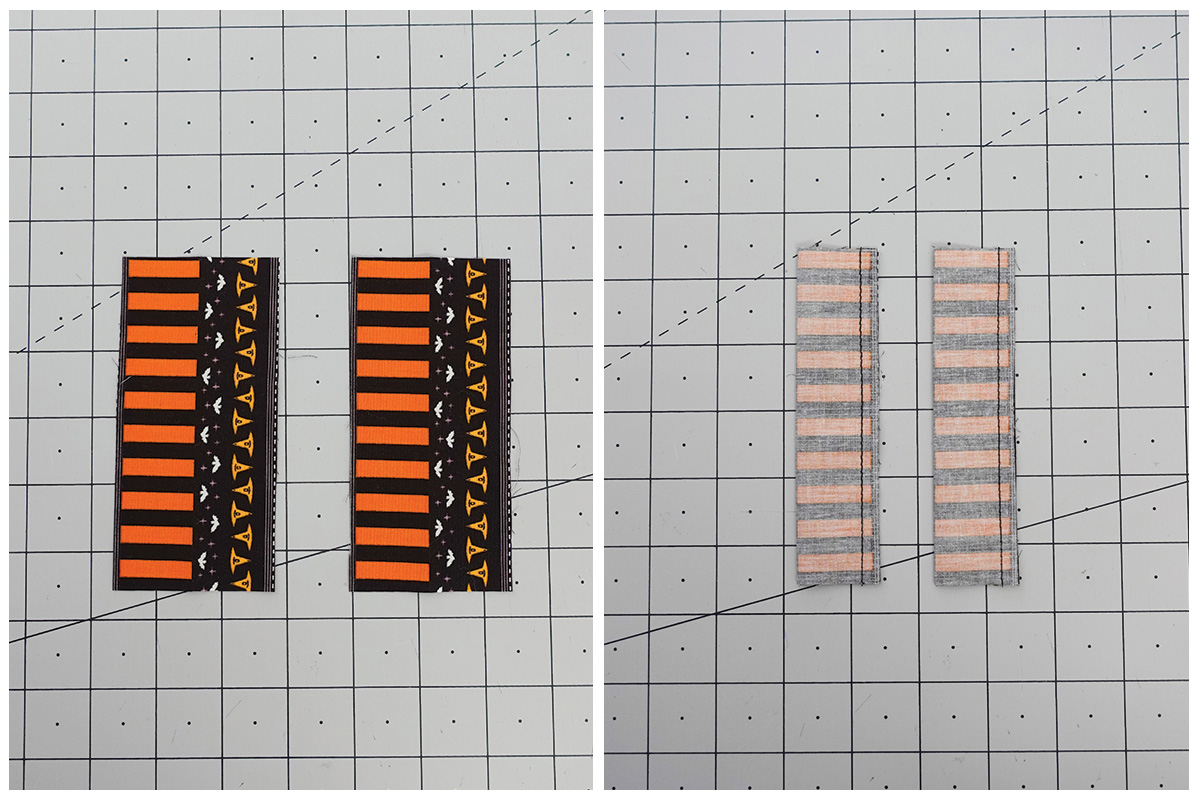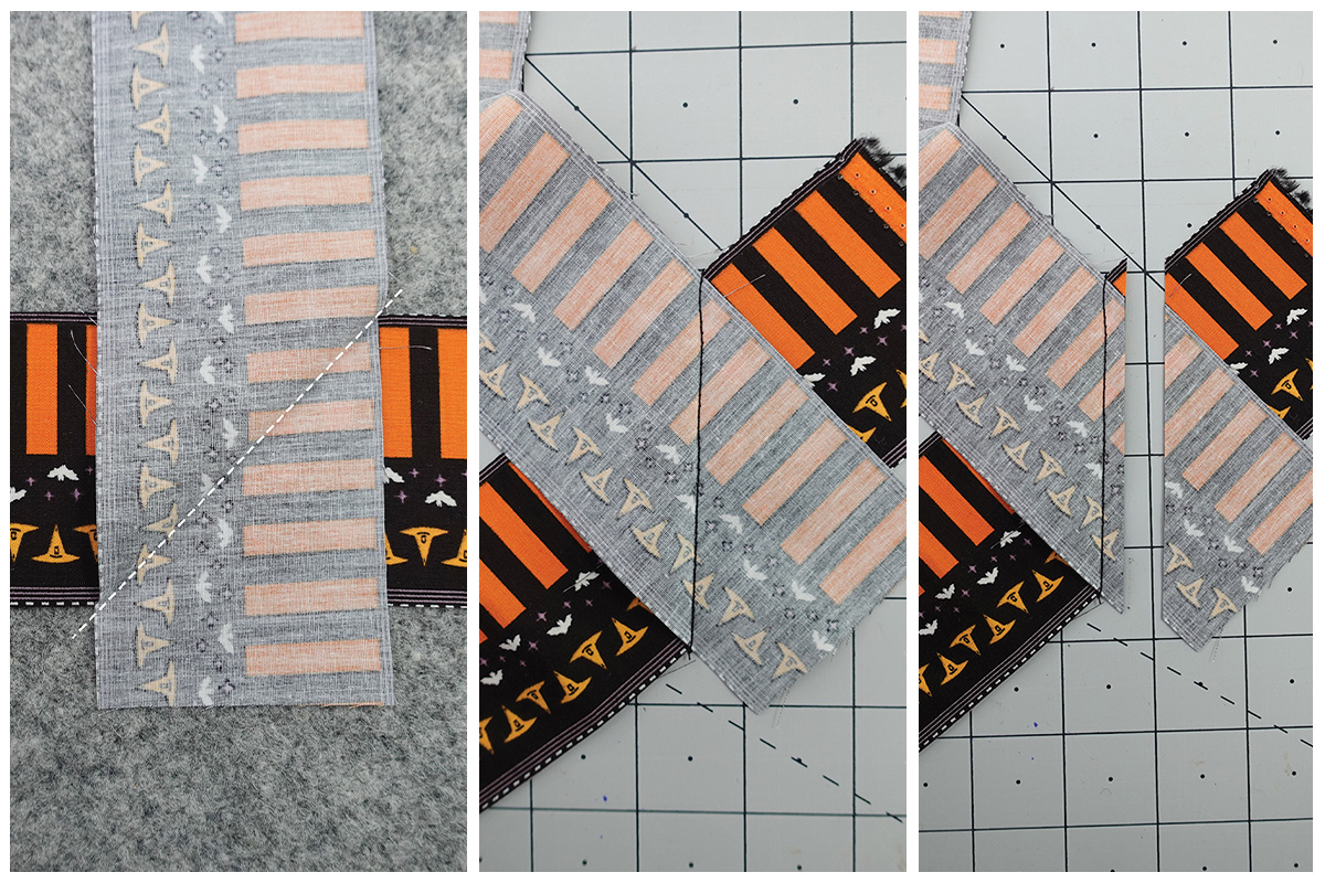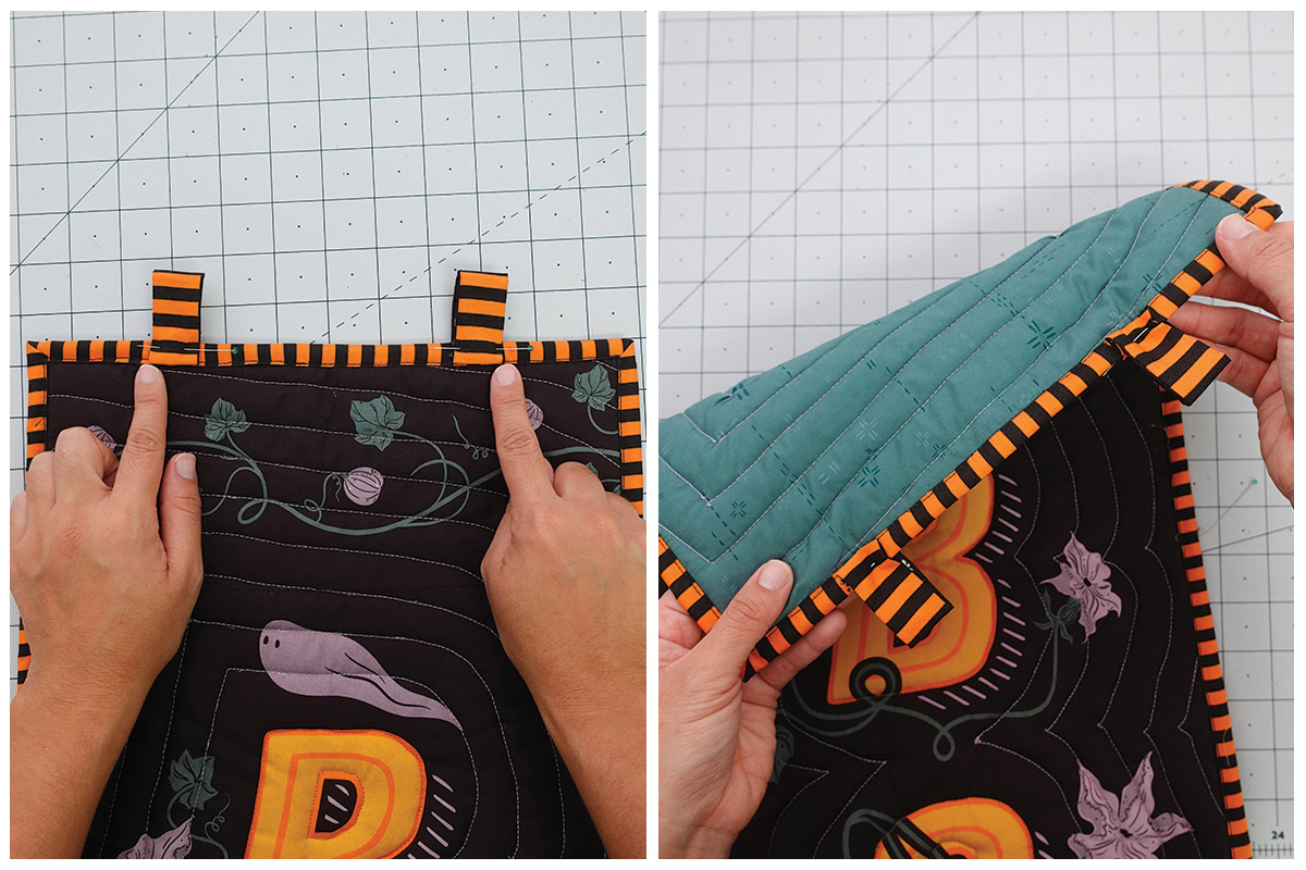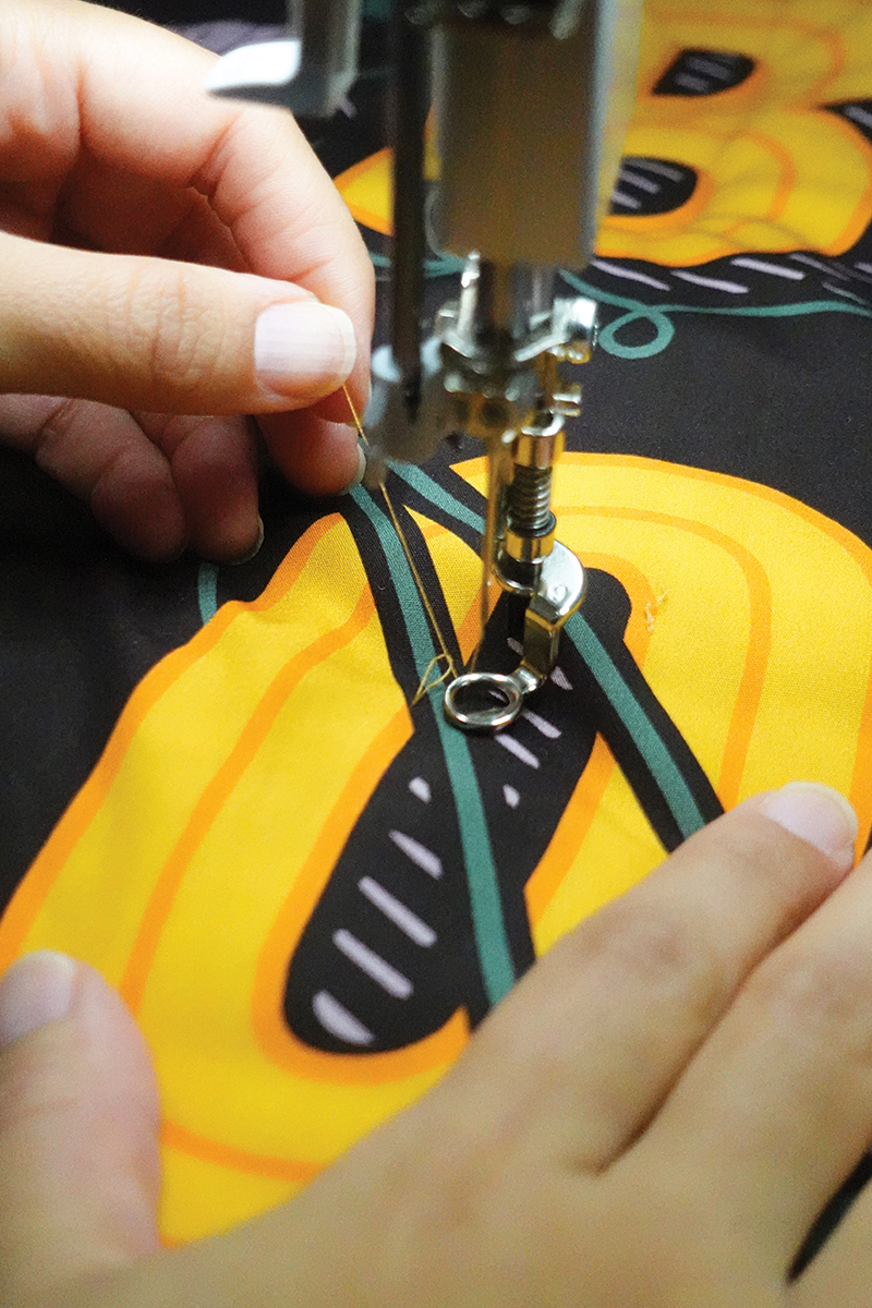Vamos a usar las franjas naranjas y negras para enmarcar este proyecto. Con el revés del proyecto hacia arriba, coloca la tira con el diseño de murciélagos/sombreros hacia arriba y cose la tira de encuadre como un quilt regular con un margen de costura de un cuarto de pulgada (¼”), haz inglete en las esquinas y une los extremos con tu método favorito.
