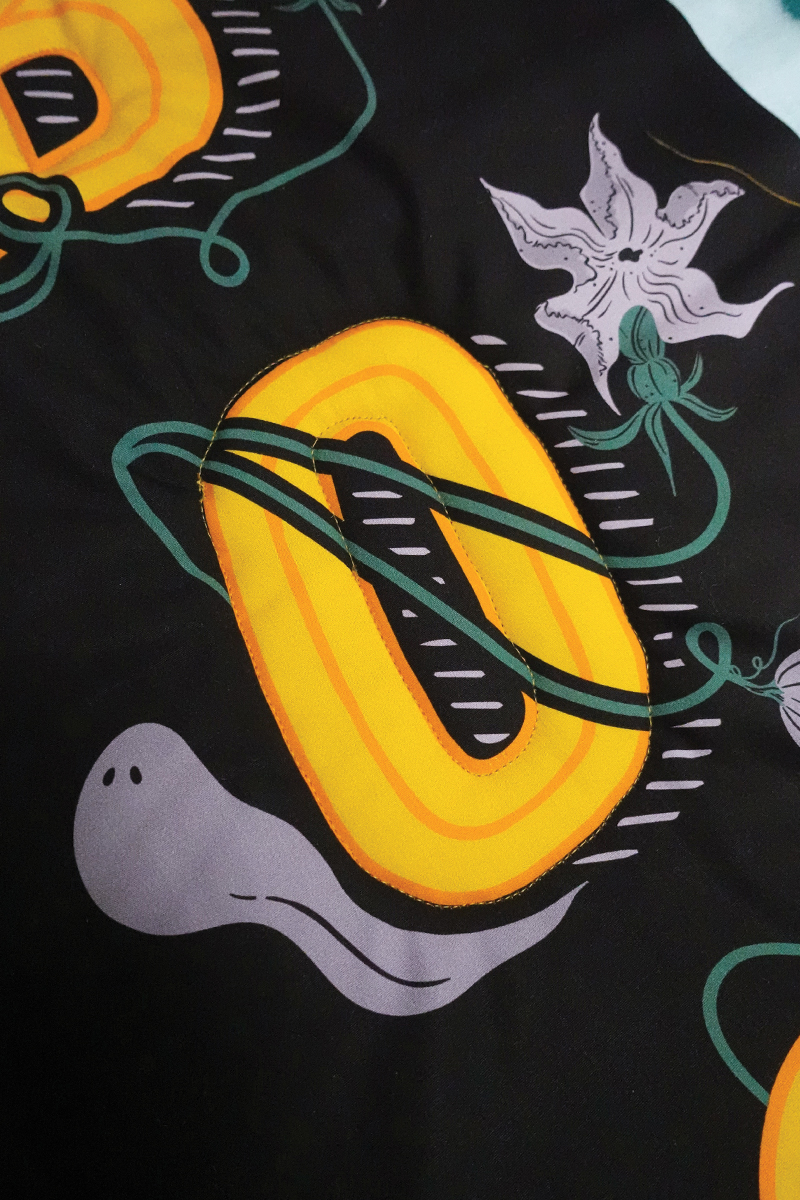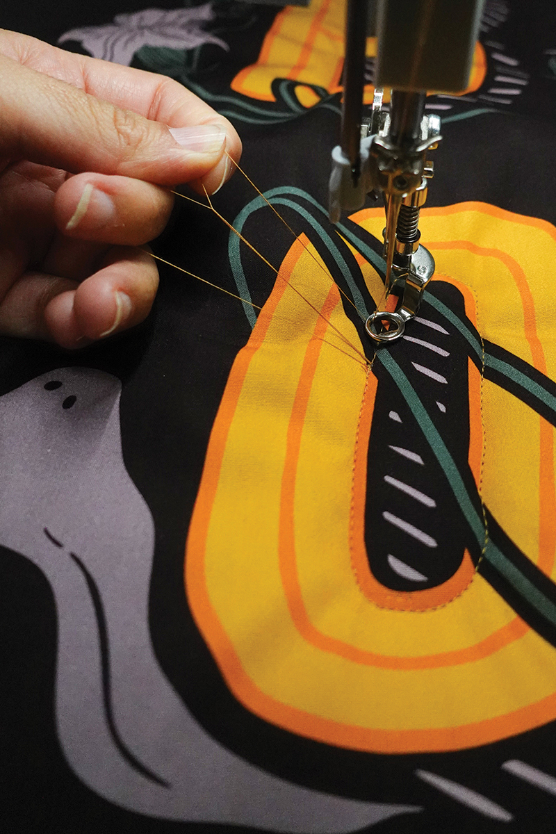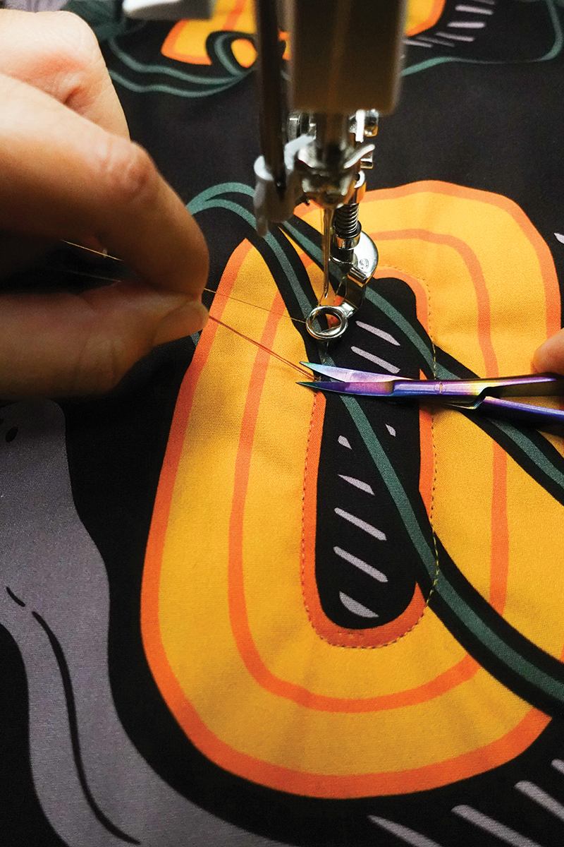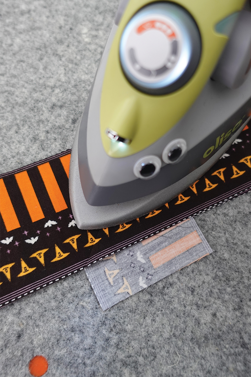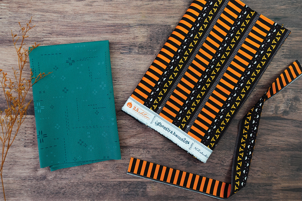 Para el revés, usamos la tela Decostitch Elements en el tono Winter Spruce, que le da un equilibrio muy bonito a la parte frontal de su temática de Halloween alegre. Y, por supuesto, ningún proyecto está completo sin un borde divertido. Estamos usando la tela de encuadre 2.5 Edition Binding Fabric, que enmarca el colgante a la perfección con alegres rayas naranjas y negras. ¿Quieres otro diseño? Puedes elegir el lado opuesto en la misma tira y cambiarlo! Esa es la belleza de la tela de encuadre 2.5!