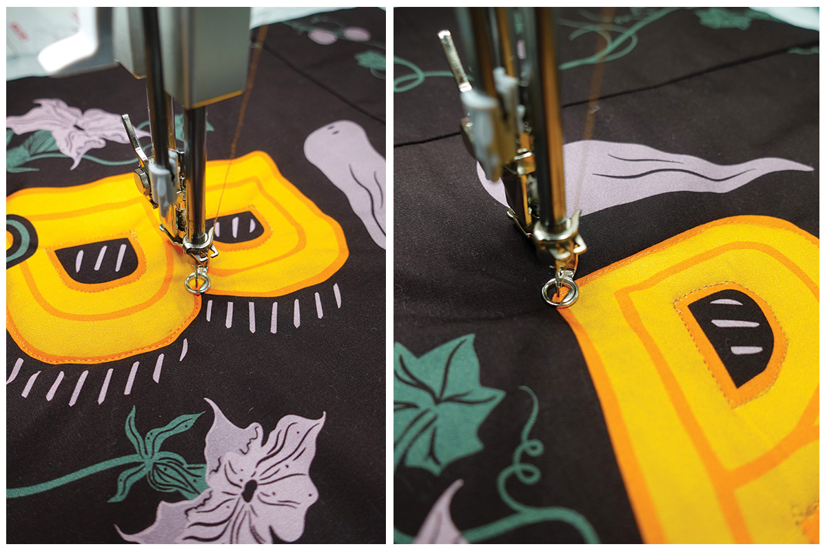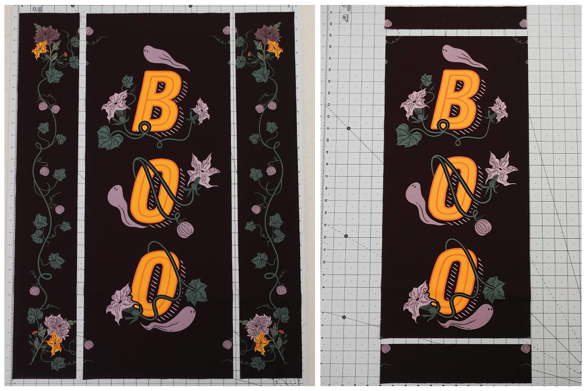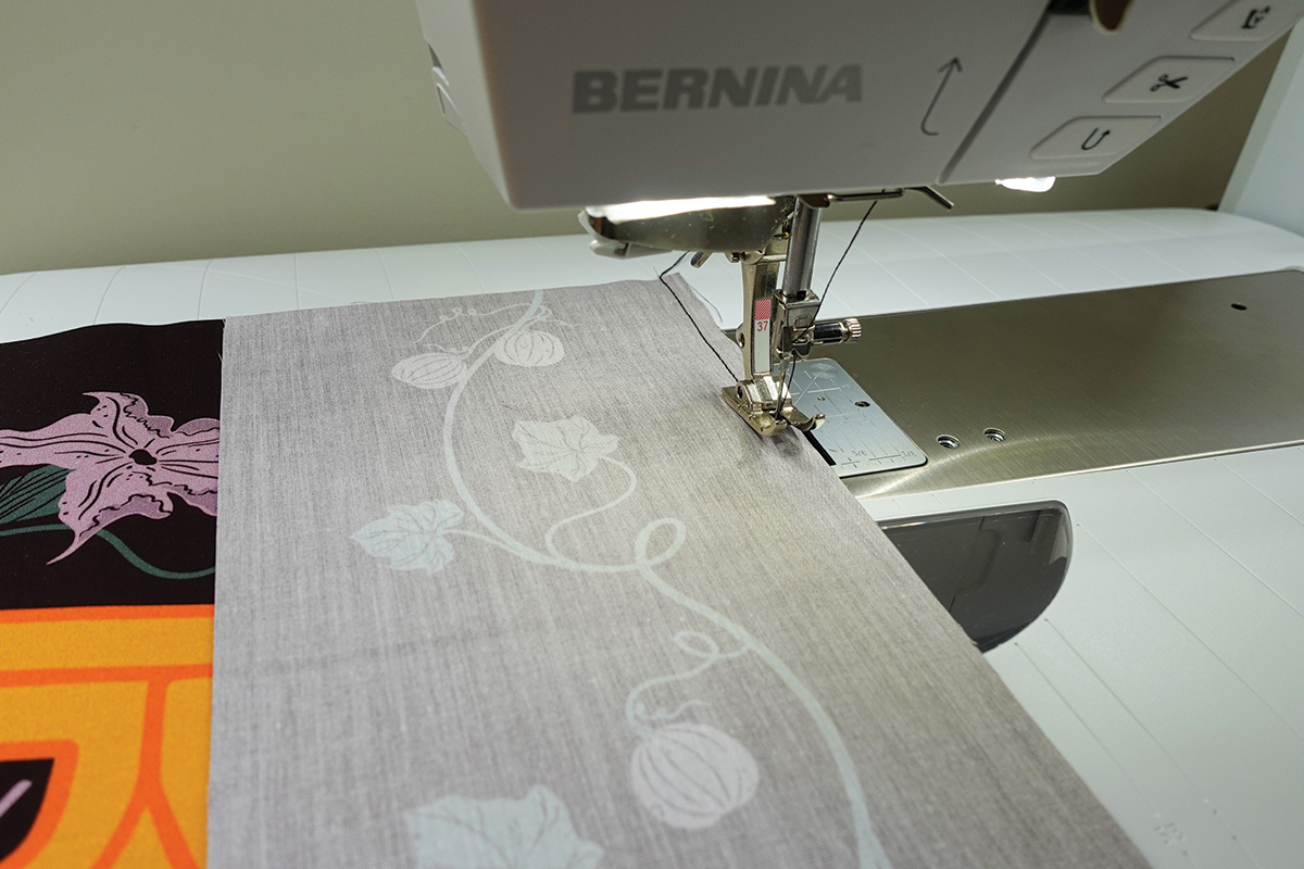 Con el pie Patchwork Foot #37, cose las piezas con los diseños de enredadera a los bordes superior e inferior del rectángulo del Boo con un margen de costura de ¼” (un cuarto de pulgada). Plancha las costuras hacia un lado.