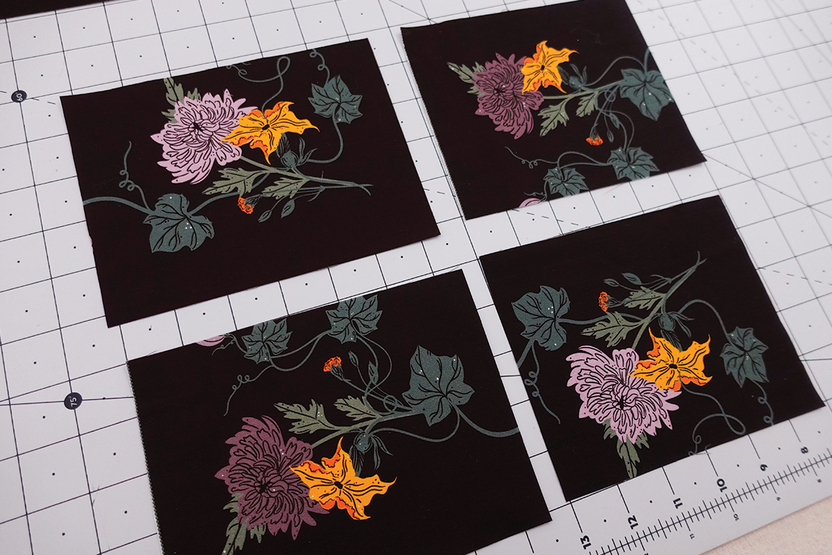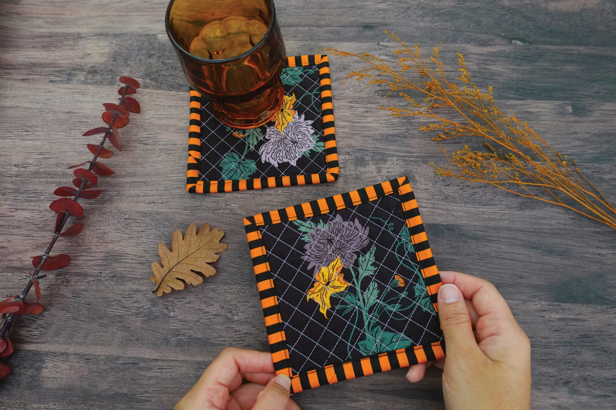 Ah, ¿y recuerdas esas esquinas de flores del panel? Las convertimos en adorables posavasos usando los retazos de 2.5 Edition Binding ¡así nada se desperdicia y cada pedacito se convierte en parte de un hermoso proyecto!