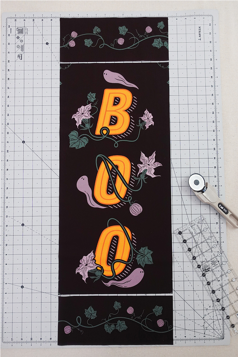 Corta el rectángulo “Boo” del panel 13 Days of Halloween. Mide y corta 5” (pulgadas) a partir de los bordes largos. Mide y corta 2” desde el borde superior y 3” desde el borde inferior.