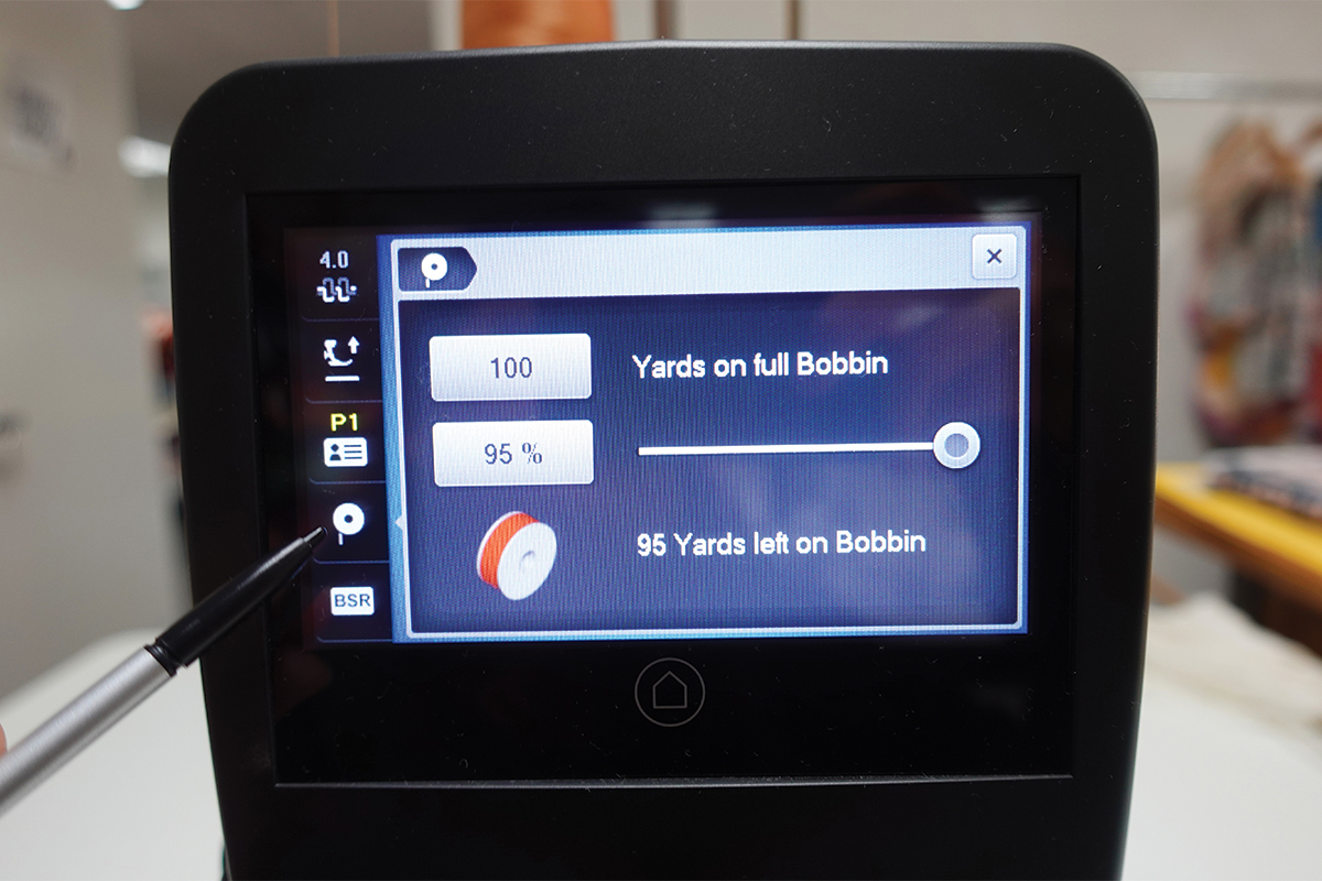 Enhebra la máquina con hilo Aurifil #2930 siguiendo el manual de usuario y llena tus bobinas. Luego, presiona el ícono de bobina y selecciona el porcentaje en 95 % para que la máquina reconozca la cantidad de hilo que se está usando en la bobina.