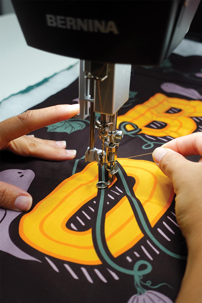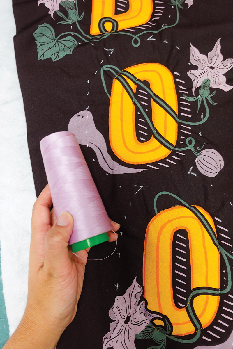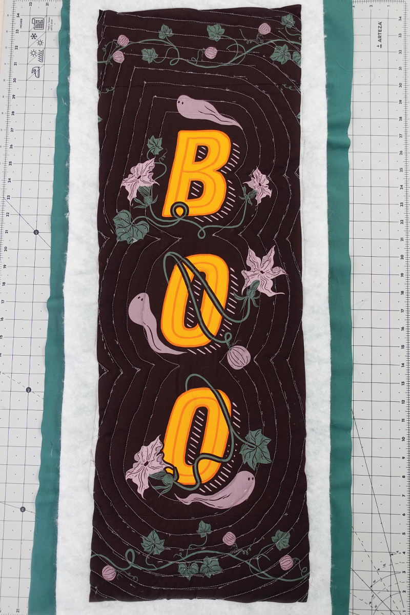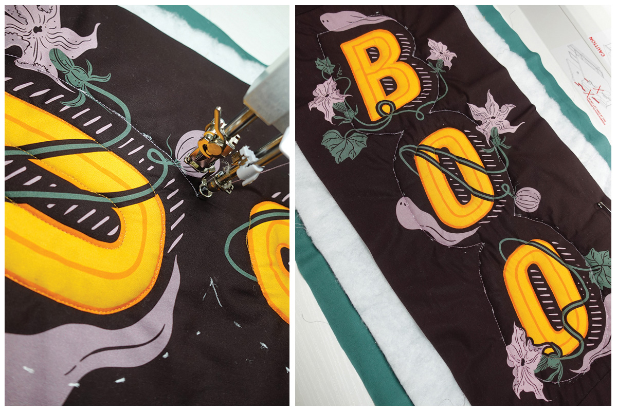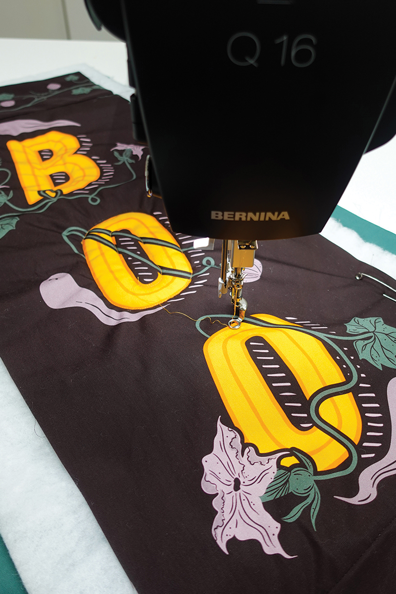 Es un colgante de puerta rápido, divertido y fácil de hacer – lo puedes completar en una tarde de manualidades! Además, nos divertimos muchísimo acolchándolo (quilting) en la BERNINA Q 16! Es un proyecto muy entretenido para esta máquina. El panel AGF 13 Days of Halloween tiene dos diseños perfectos para proyectos divertidos, y estamos usando el lado derecho – Boo – para hacer nuestro colgante de puerta.
