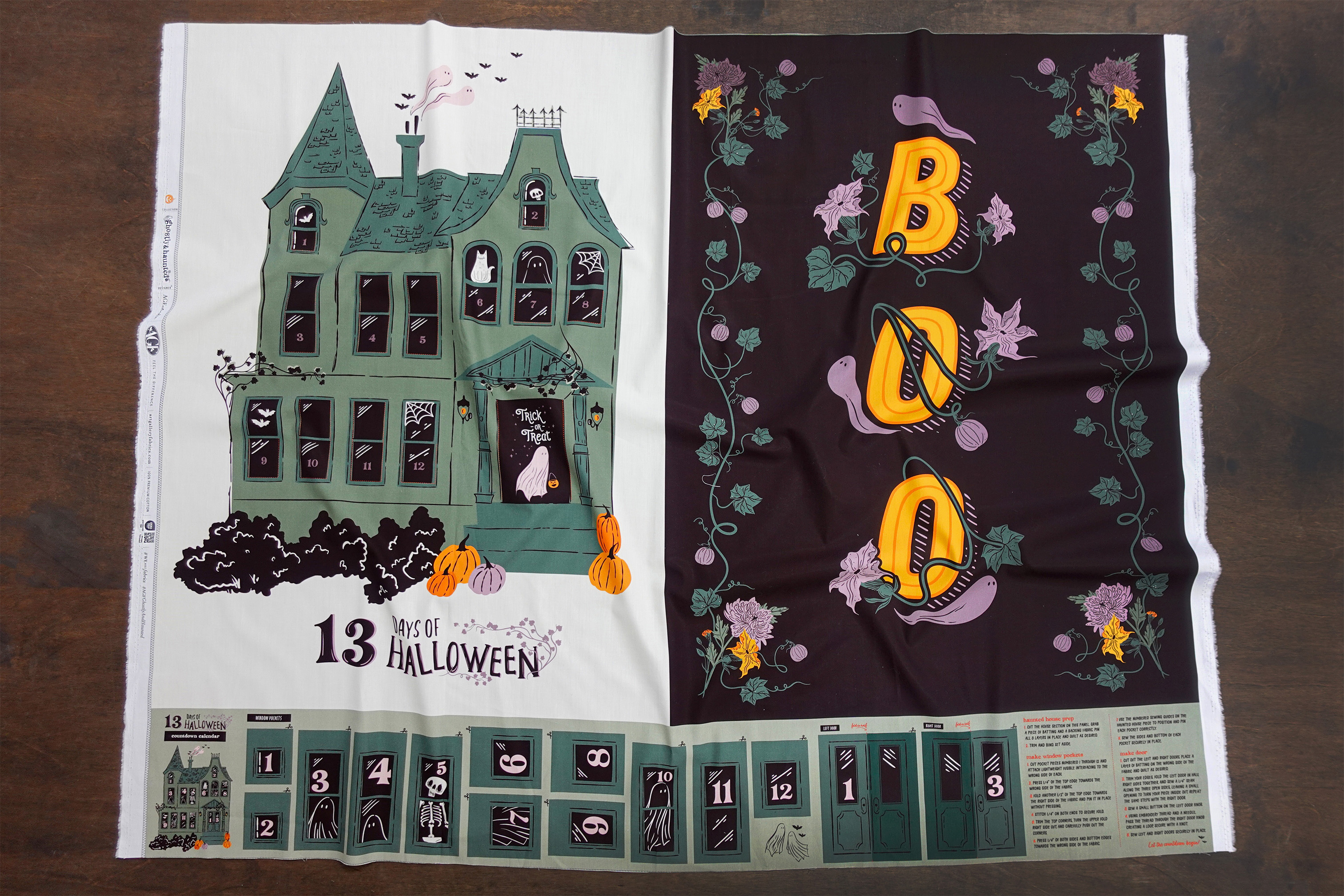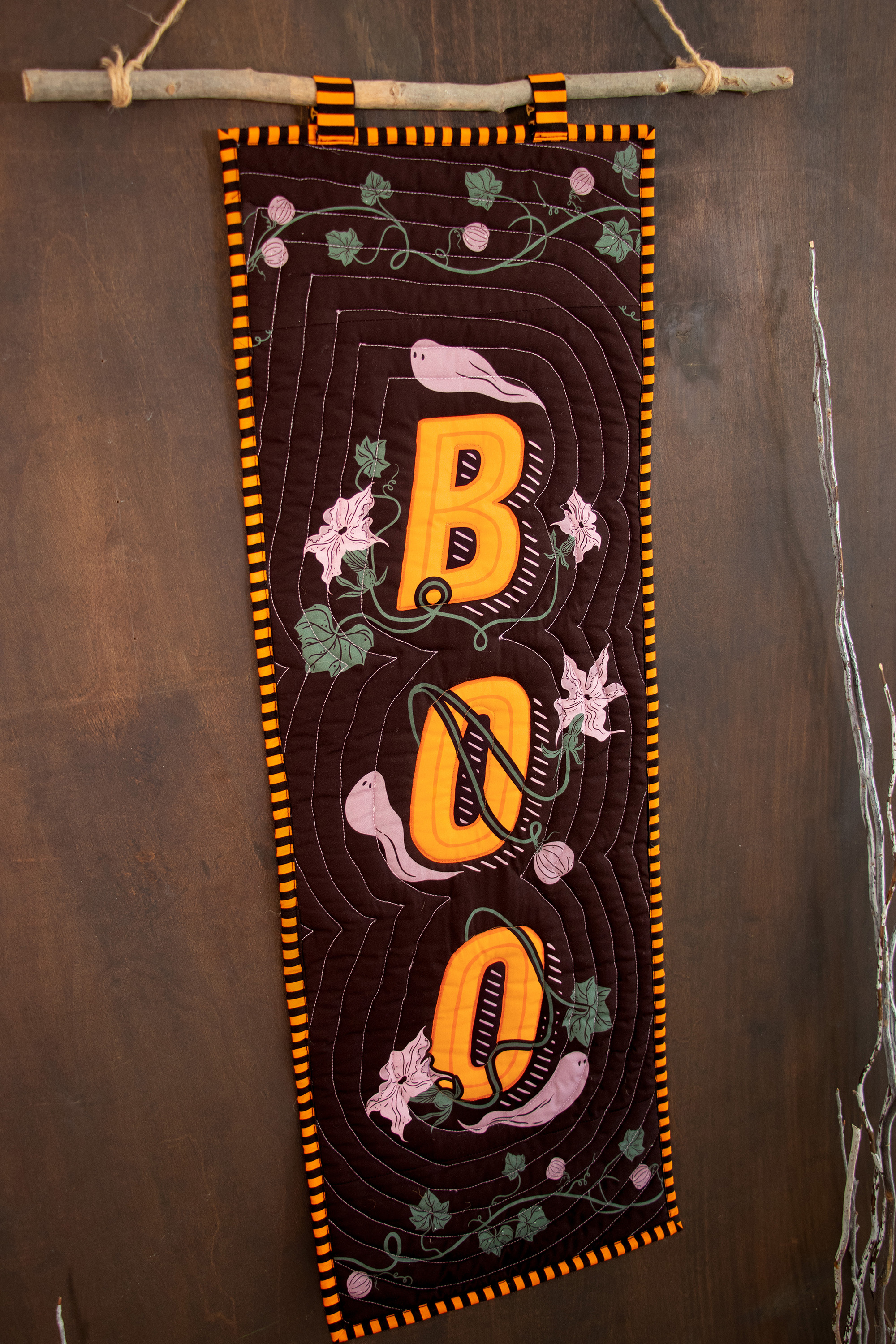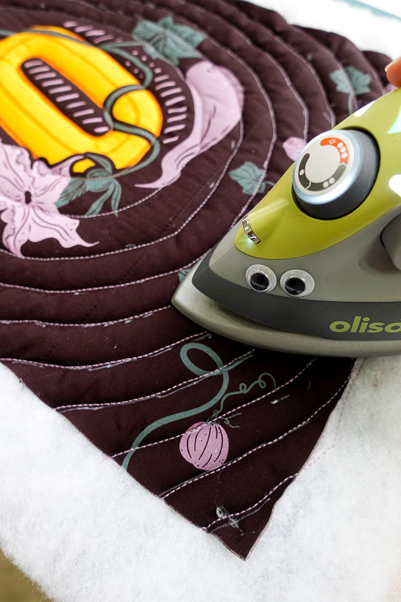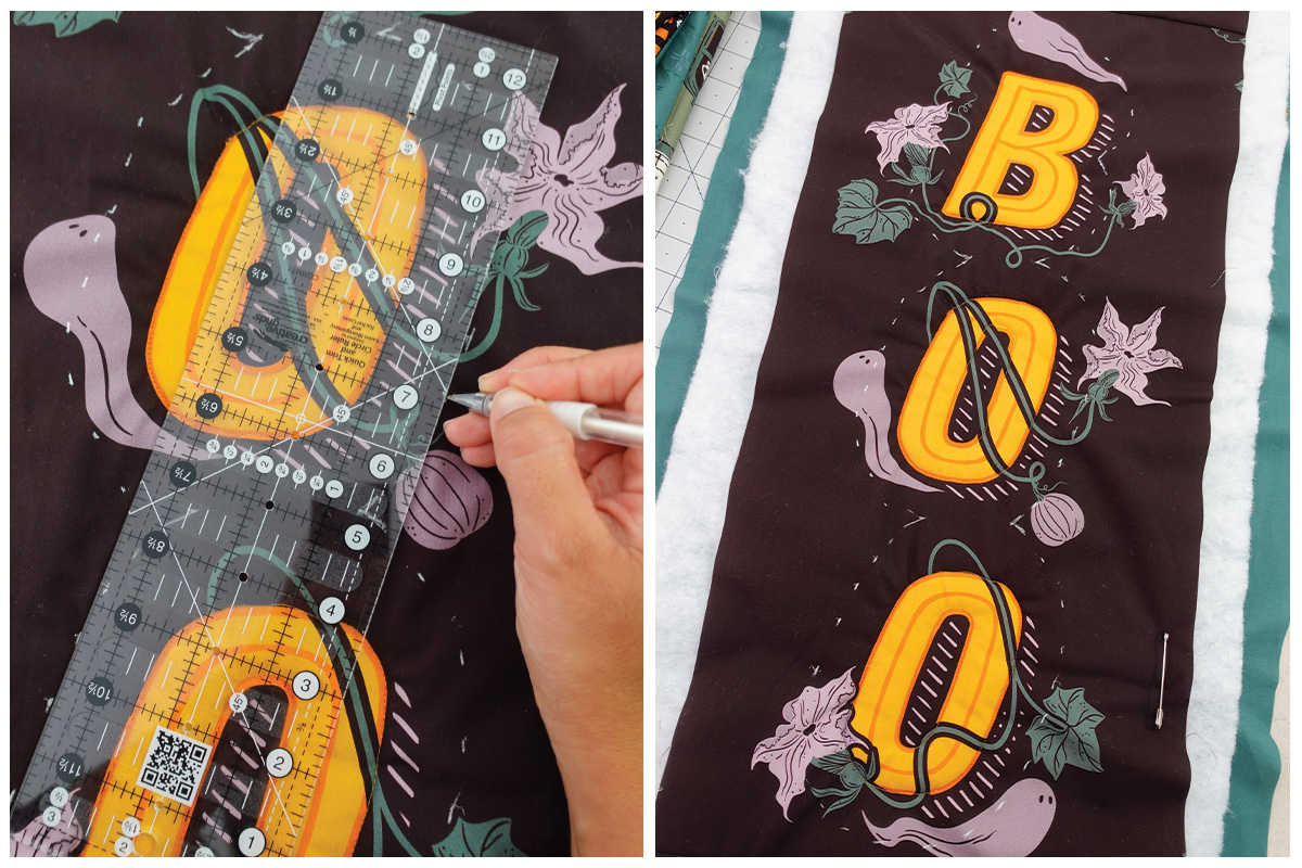 Es un colgante de puerta rápido, divertido y fácil de hacer – lo puedes completar en una tarde de manualidades! Además, nos divertimos muchísimo acolchándolo (quilting) en la BERNINA Q 16! Es un proyecto muy entretenido para esta máquina. El panel AGF 13 Days of Halloween tiene dos diseños perfectos para proyectos divertidos, y estamos usando el lado derecho – Boo – para hacer nuestro colgante de puerta.
