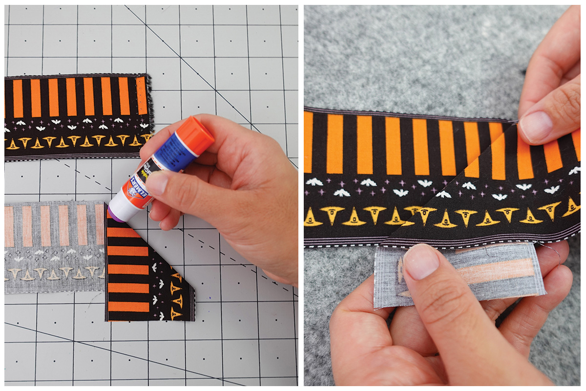 Para crear una tira continua, haz un pliegue de 45 grados en un extremo y aplica una línea de pegamento en el borde plegado. Colócalo sobre otra tira con el lado del pegamento hacia abajo, haciendo coincidir los diseños, y presiona con una plancha.
