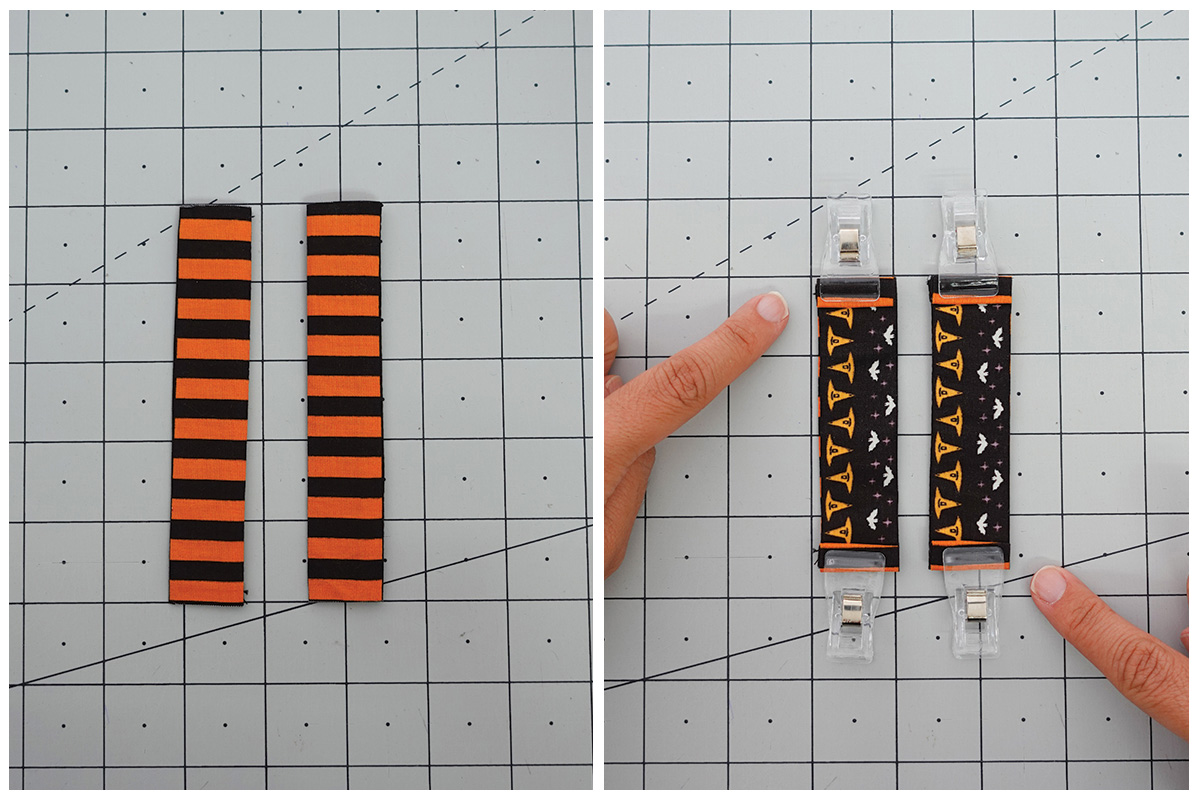 Vamos a usar las franjas naranjas y negras para enmarcar este proyecto. Con el revés del proyecto hacia arriba, coloca la tira con el diseño de murciélagos/sombreros hacia arriba y cose la tira de encuadre como un quilt regular con un margen de costura de un cuarto de pulgada (¼”), haz inglete en las esquinas y une los extremos con tu método favorito.