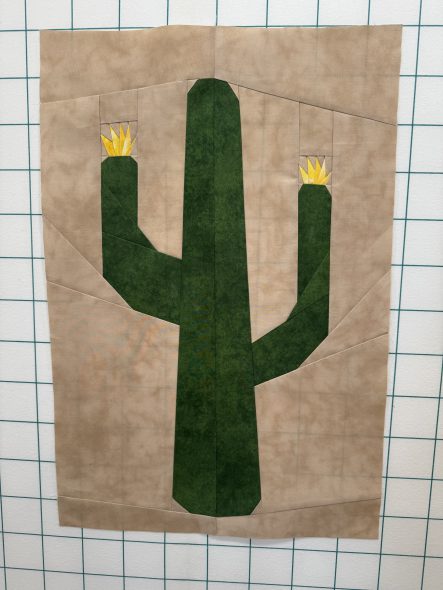 I’m probably not going to finish this quilt by the deadline, but I got a VERY late start. My large cactus is finished and I’m very happy with it! I love foundation paper piecing!