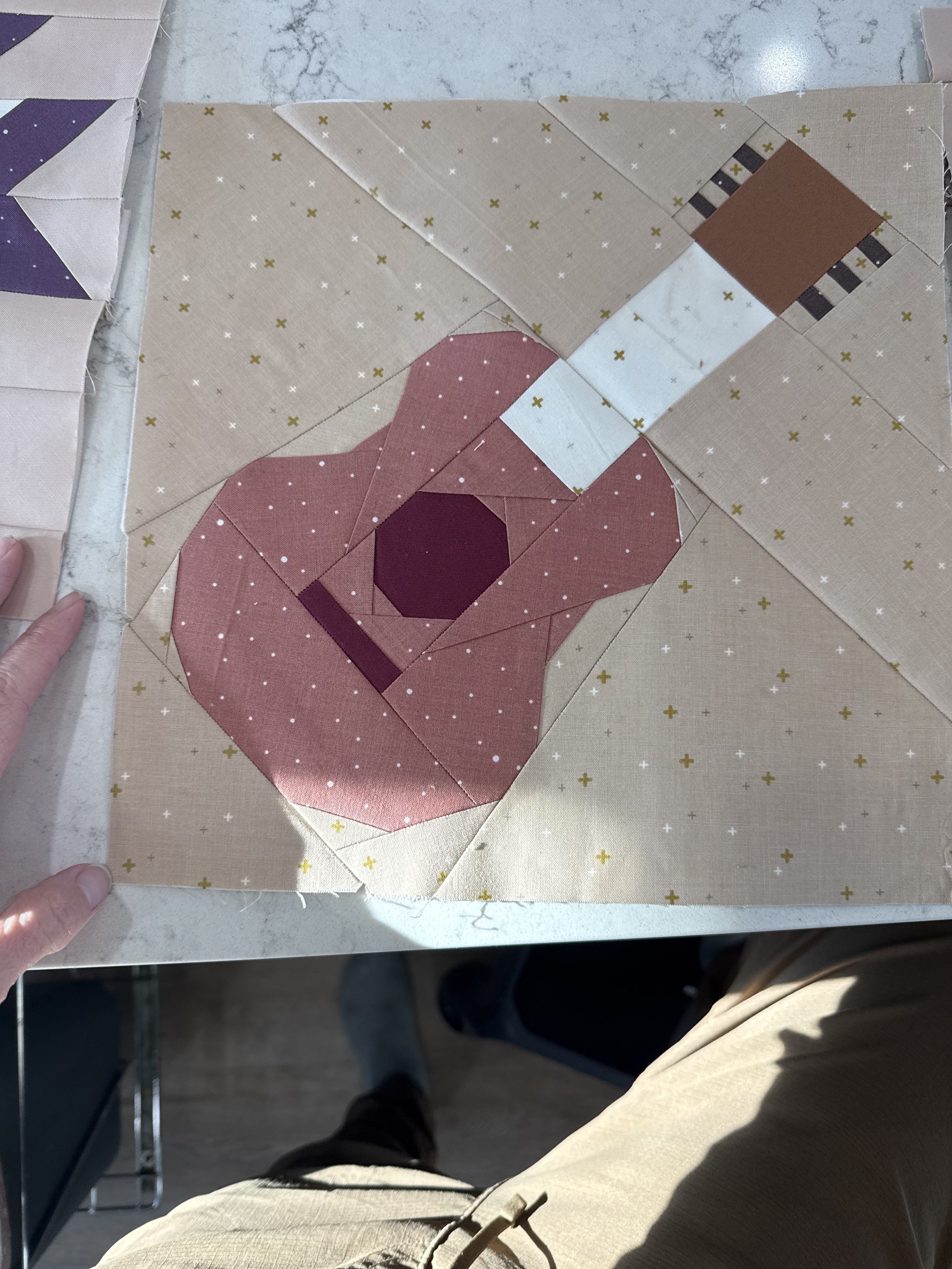 First foundation paper piecing quilt for me. There is definitely a learning curve. My guitar block came out 11.5×11.5 not 12×12! I have no idea what I did wrong. I printed the pattern from two different downloads. On then top of piece D was cut off so I re-downloaded the pattern. My inch test square matched up but I ended up 1/2” small 🤦🏻♀️