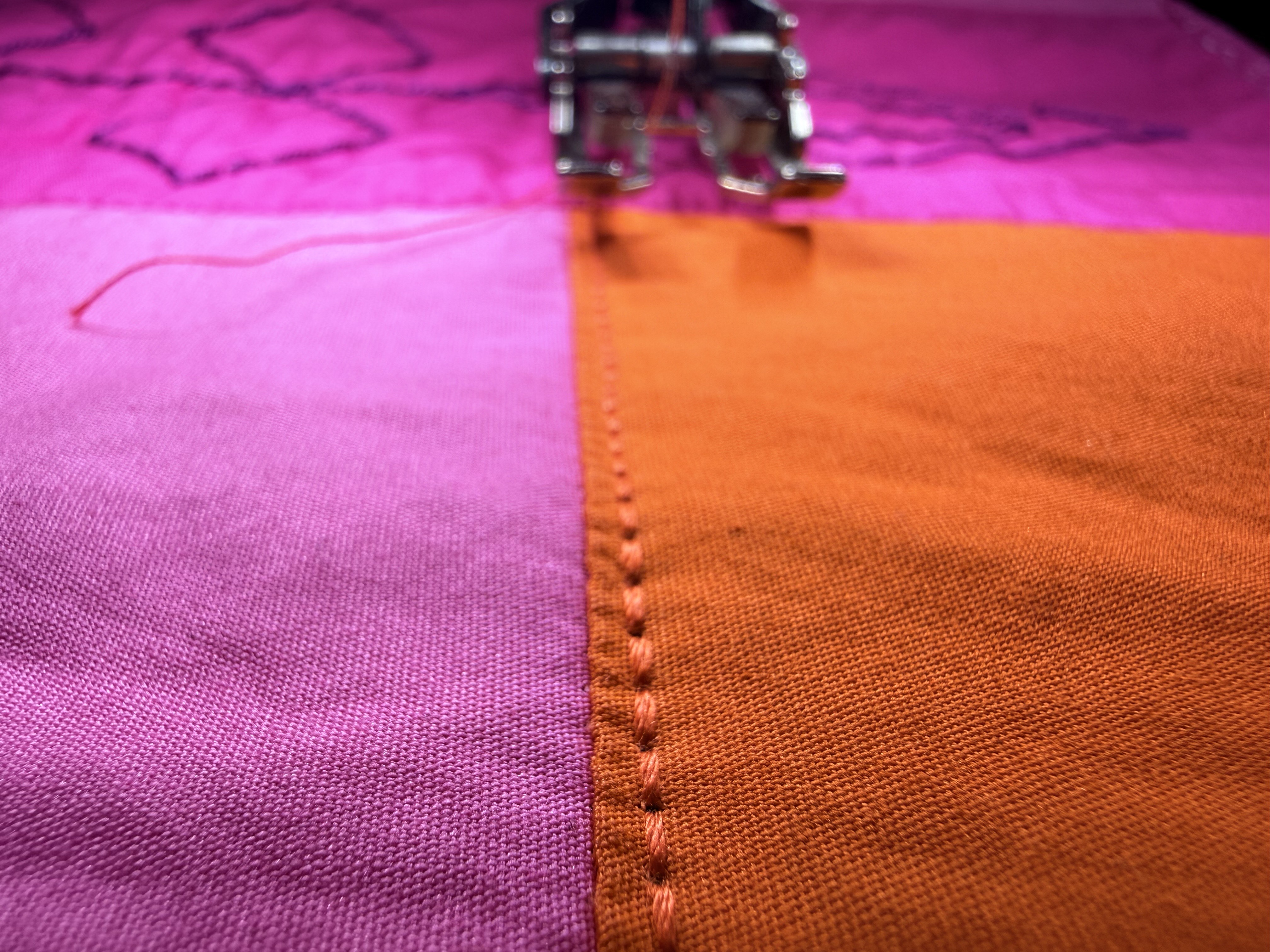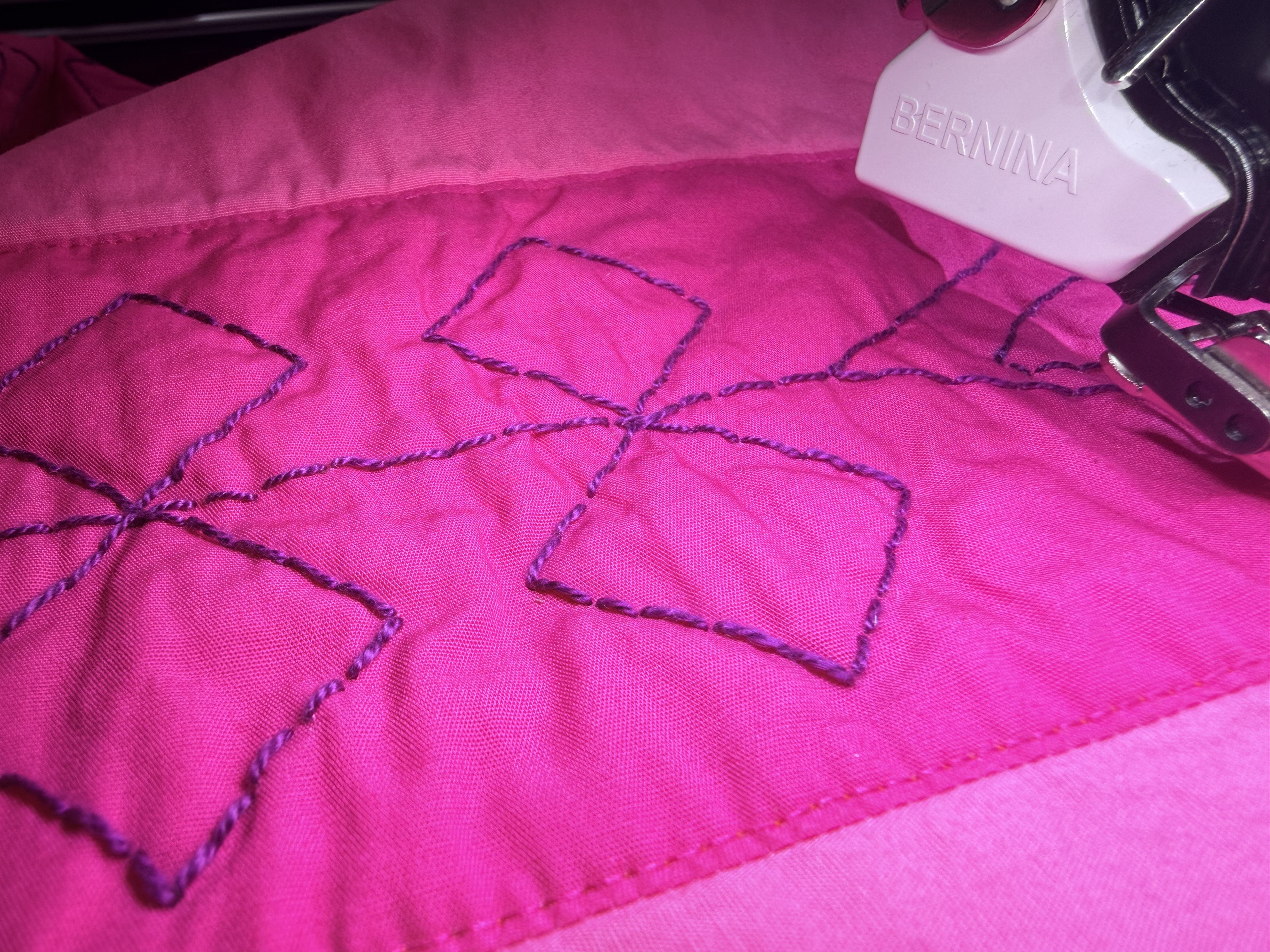 Con mi BERNINA 590, puedo transformar inspiraciones de textura en acolchado moderno y limpio, combinando puntadas decorativas, textura y color. En este quilt utilicé tres puntadas diferentes, incluyendo la puntada triple, que ofrece un efecto de costura hecha a mano mientras mantiene fuerza y precisión. La puntada triple repite cada puntada tres veces en el mismo lugar, creando una textura que imita el acolchado manual y se ve hermosa en diseños decorativos.