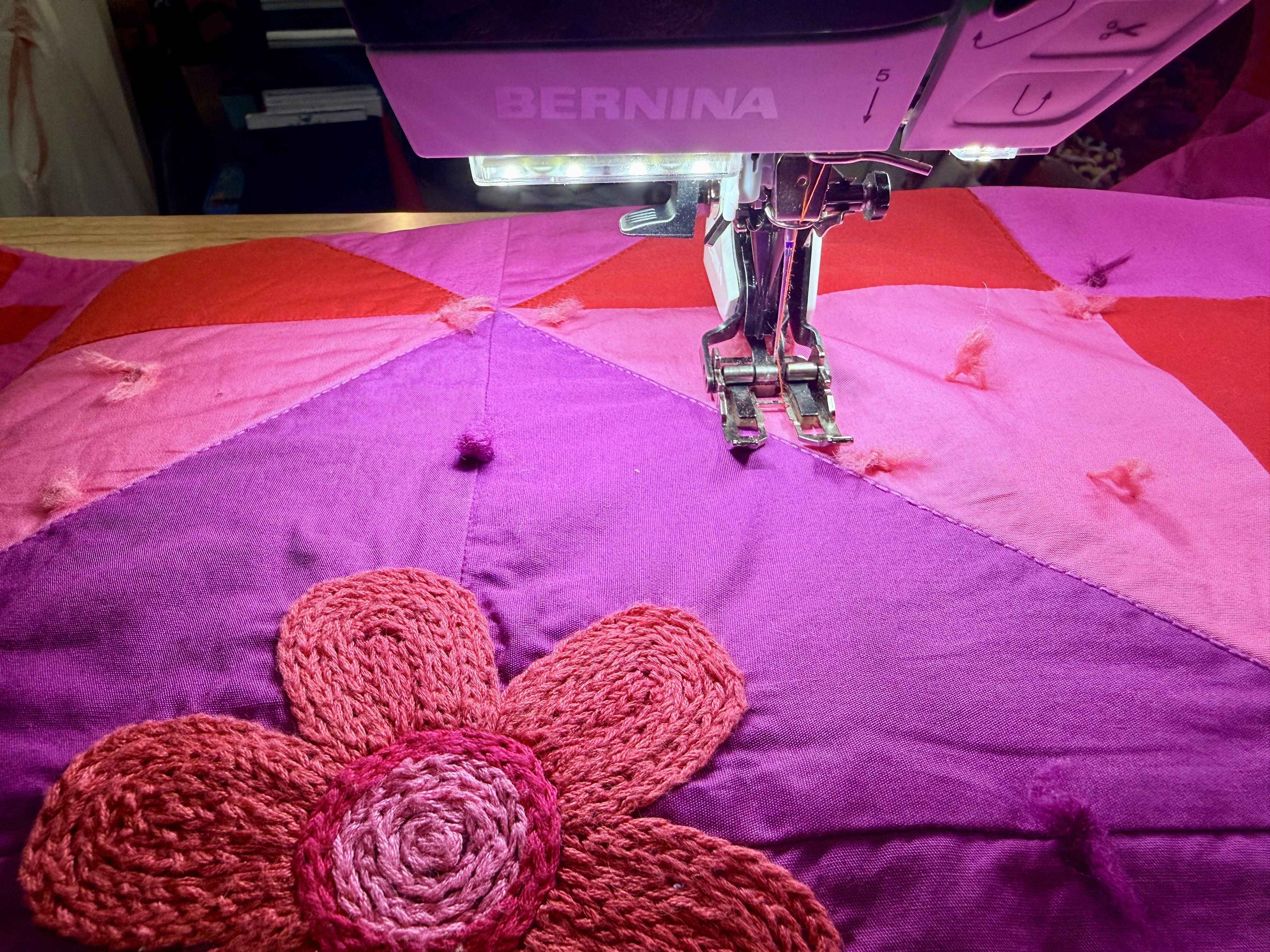 Para añadir aún más dimensión, también incorporo bordado sencillo a mano y nudos de lana hechos a mano. Estos detalles aportan calidez, personalidad y textura al quilt, complementando el acolchado a máquina.