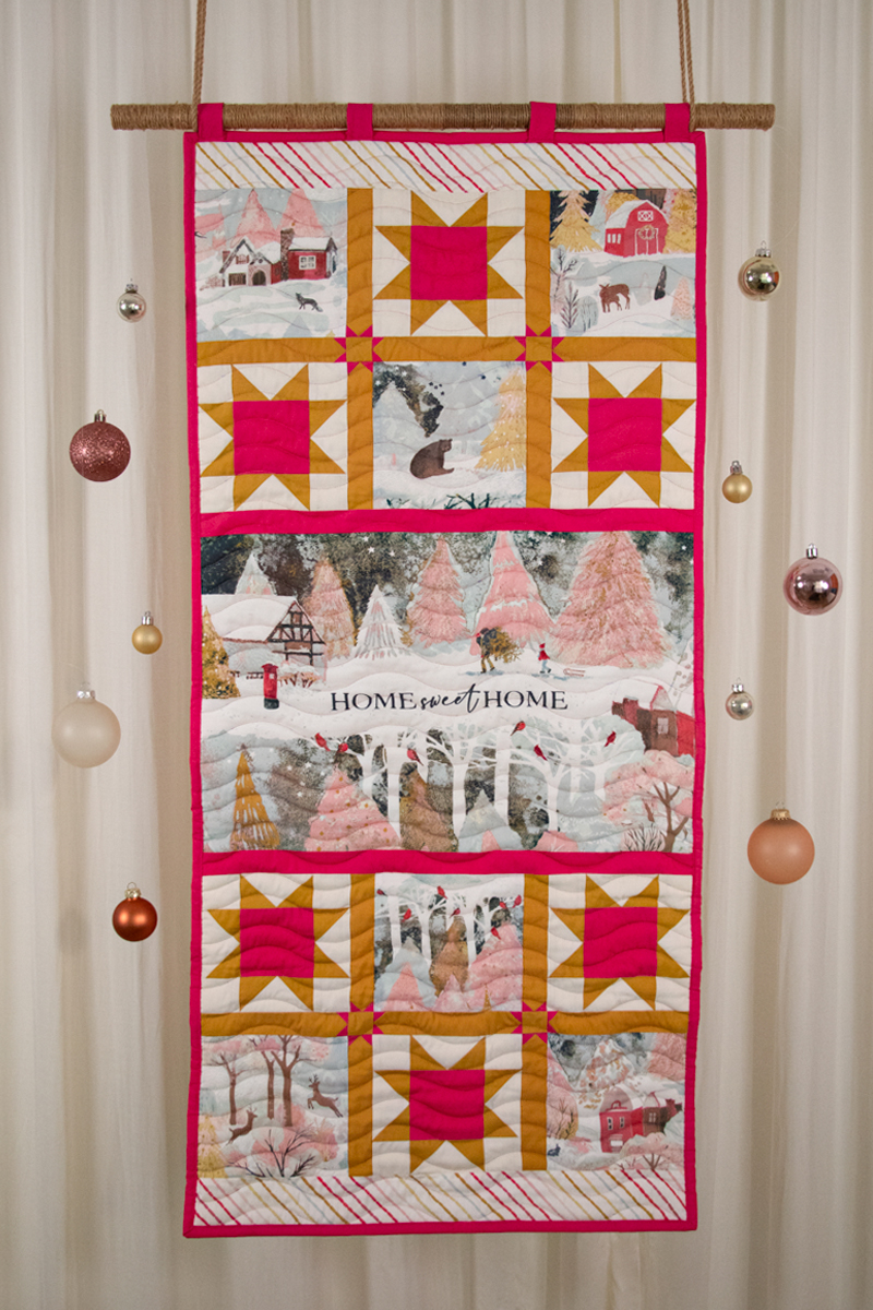 Estamos utilizando el panel Welcome Home de AGF y añadiendo franjas con encantadores detalles de estrellas y bloques llamativos para que este Colgante para Navidad realmente brille. Mezcla y combina tus piezas favoritas del panel o síguenos con nuestro diseño. Tienes curiosidad por acolchar con reglas pero no sabes por dónde empezar? Te enseñaremos consejos para trabajar con reglas aptos para principiantes y lograr esa textura bonita y esponjosa en tu acolchado con la BERNINA Q 16.