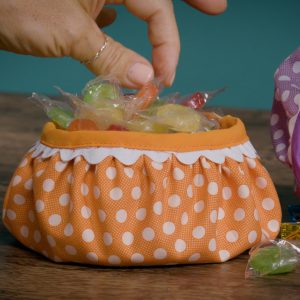 orange polka dot fabric bowl, filled with candy, on a wooden table