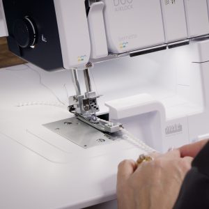 white beads being fed through the beading foot on a b68 AIRLOCK