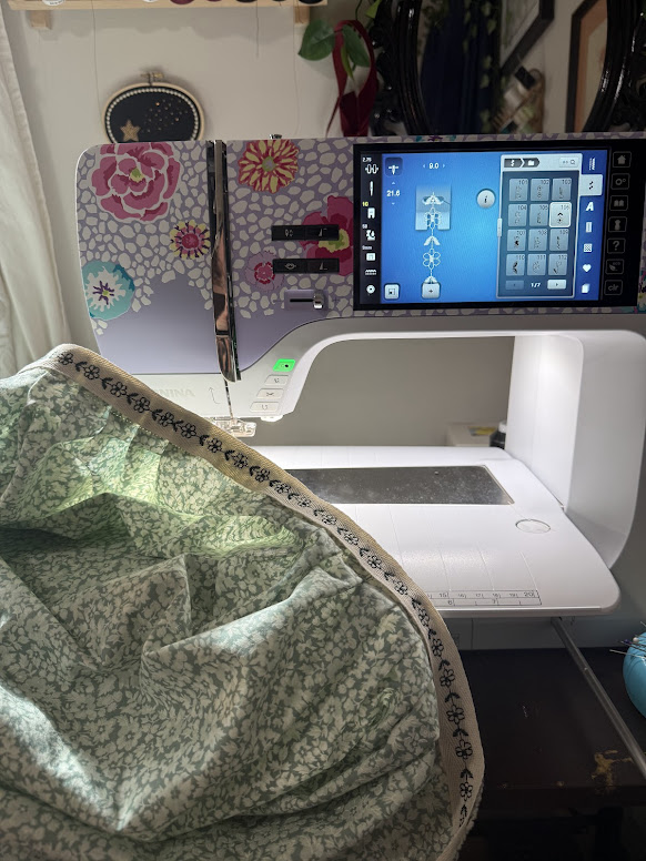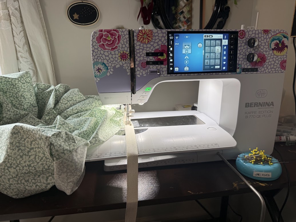 I even went ahead and added in some more decorative stitching on the cotton twill ribbon–I can’t help myself, it’s one of my favorite features on my B 770 QE PLUS! I used stitch #106 to achieve this, and I think the decorative stitch looked very nice paired with the floral print of the fabric.