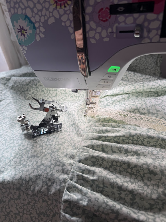 I will not tell you how many times I have gone ahead and hand-set my own ruffles. I once made a late Victorian gown that had over 9 yards of hand pleated ruffles…….so it goes without saying I may have shed a tear of joy using the ruffler foot! In literally the blink of an eye, the ruffler foot created beautiful, even ruffles, and it was so fun to sew with. For this project, I had mine set on the 6, so every 6 stitches, it did a kick back and made a ruffle. Perfect ruffles! I had to take a minute, haha. I’ll never ruffle again without the Ruffler Foot #86. It was very easy to set up and had minimal trial and error to understand how to use it. I also recommend that if you don’t have it, buy the BIG Book of Presser Feet, which gives excellent demos on how to use the different machine feet for your projects!