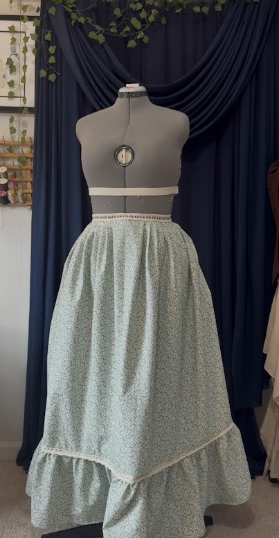 I never like to say a project is easy because what is “easy” for one person may be very confusing for another, but making skirts like this is truly delightful once you get the hang of it, and I love that it literally yields minimal to no waste. I think at the end I had about 8″ of ruffle I didn’t need. If you’re savvy enough, this extra fabric could be made into a proper pocket to add to the skirt! I went ahead and added some cute vintage cotton lace to the top of the ruffle for an extra detail, and I was done! We have a beautiful set of 18th-Century stays and a no-waste skirt–all made using my B 770 QE PLUS Kaffe Edition machine, the BERNINA Ruffler Foot #86, and Benartex Fabric!