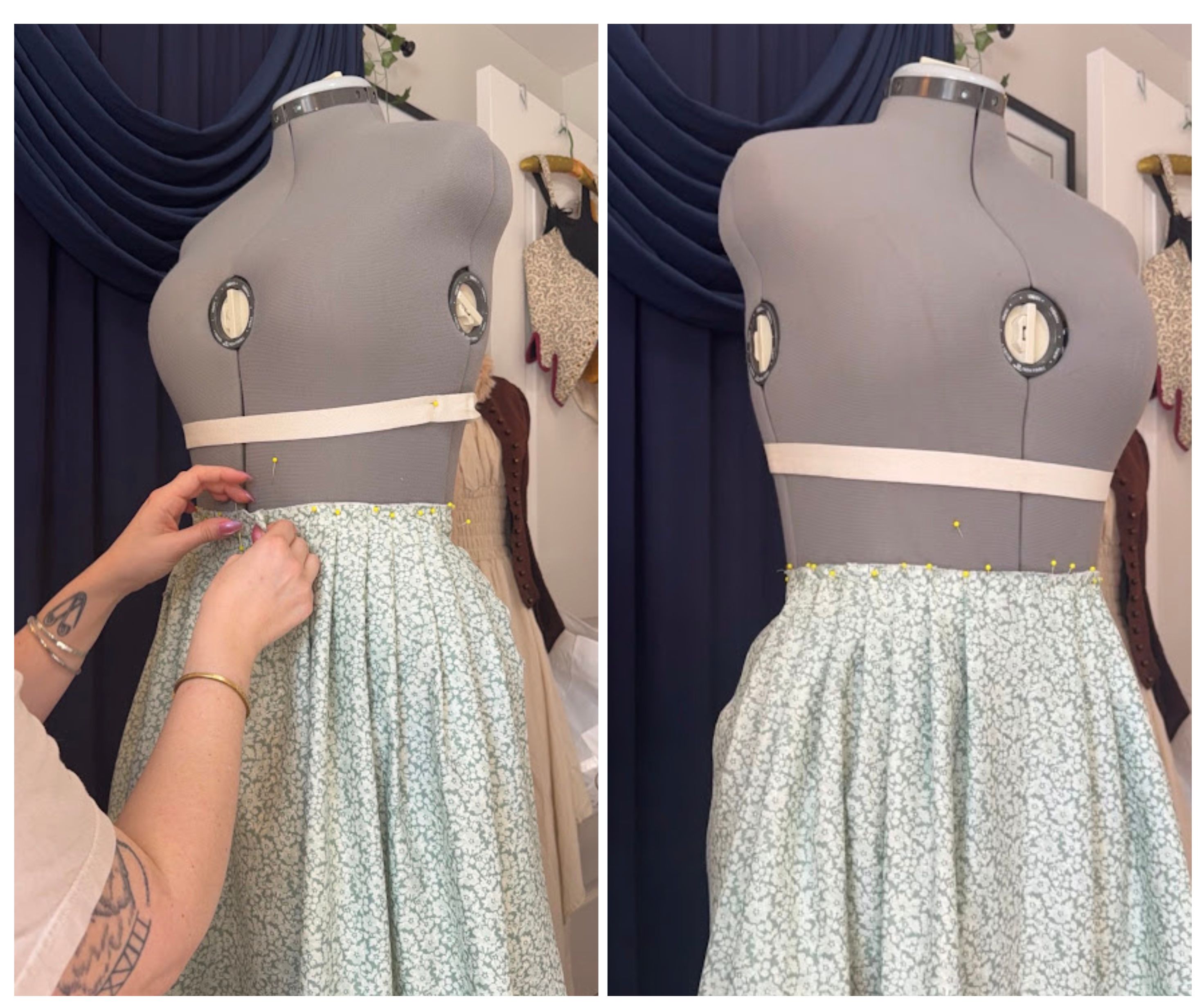 I find this easiest to do on a mannequin that is around my size, but all you need to do is make sure the length of the skirt is pleated down to your waist measurement. Start with a 3-4″ box pleat center front and then do knife pleats moving from the center back to the side seams. On the back of the skirt, I just did knife pleats going in one direction. Once I was satisfied with the pleating and it looked even, and it all went into the waistband I sewed a stay stitch to keep them together, and then I sewed that to my Cotton Twill Ribbon Tape, which serves as the waistband. I cut this to be about 36″ for the front tie and 36″ for the back tie, so I can wrap it around my waist front and back to secure the skirt to my body with ease.