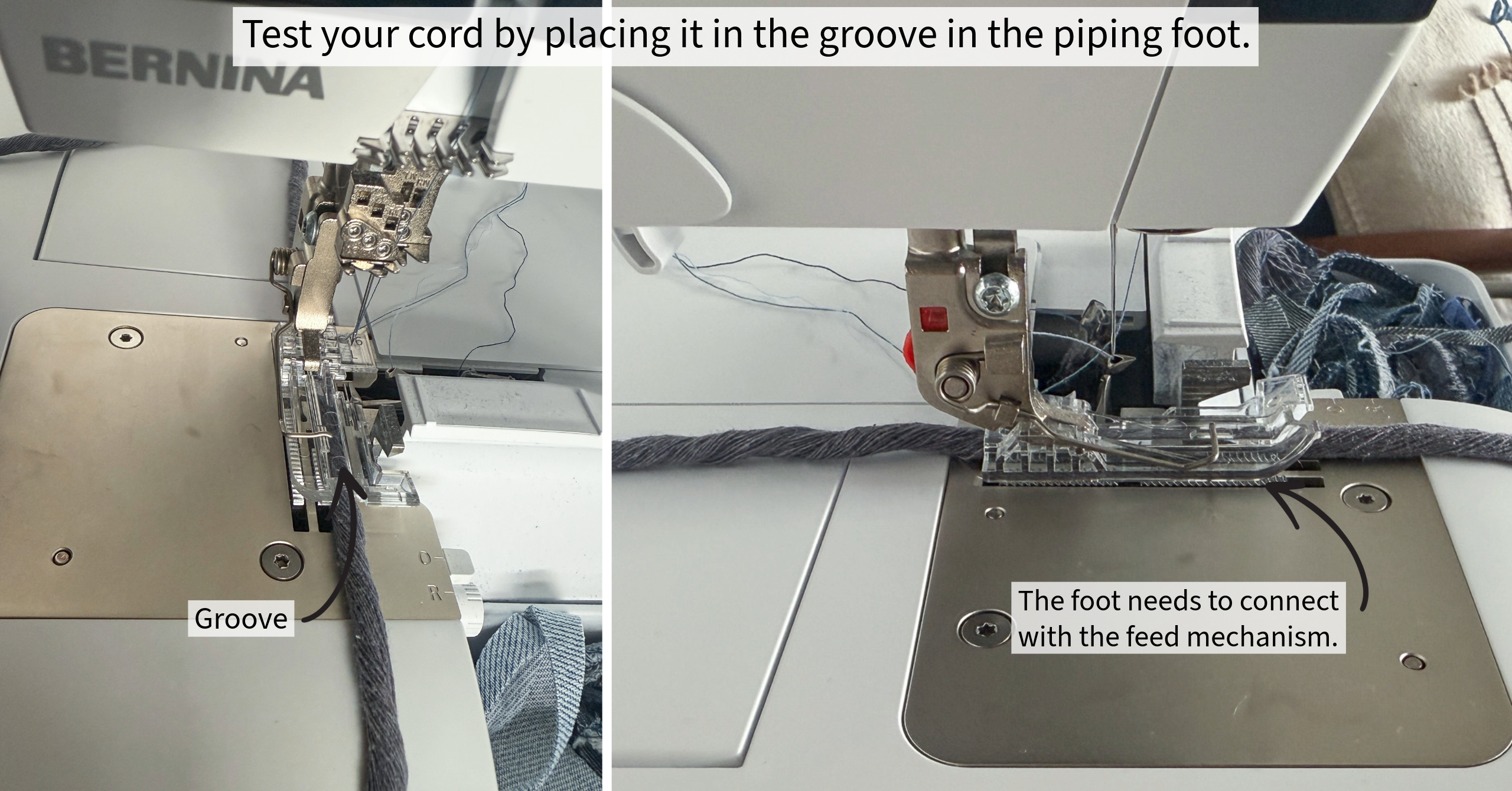 Before you start, test your cord with the foot to make sure it fits properly. If the cord is too thick, the presser foot won’t connect with the feed mechanism, and your piping will be wonky.