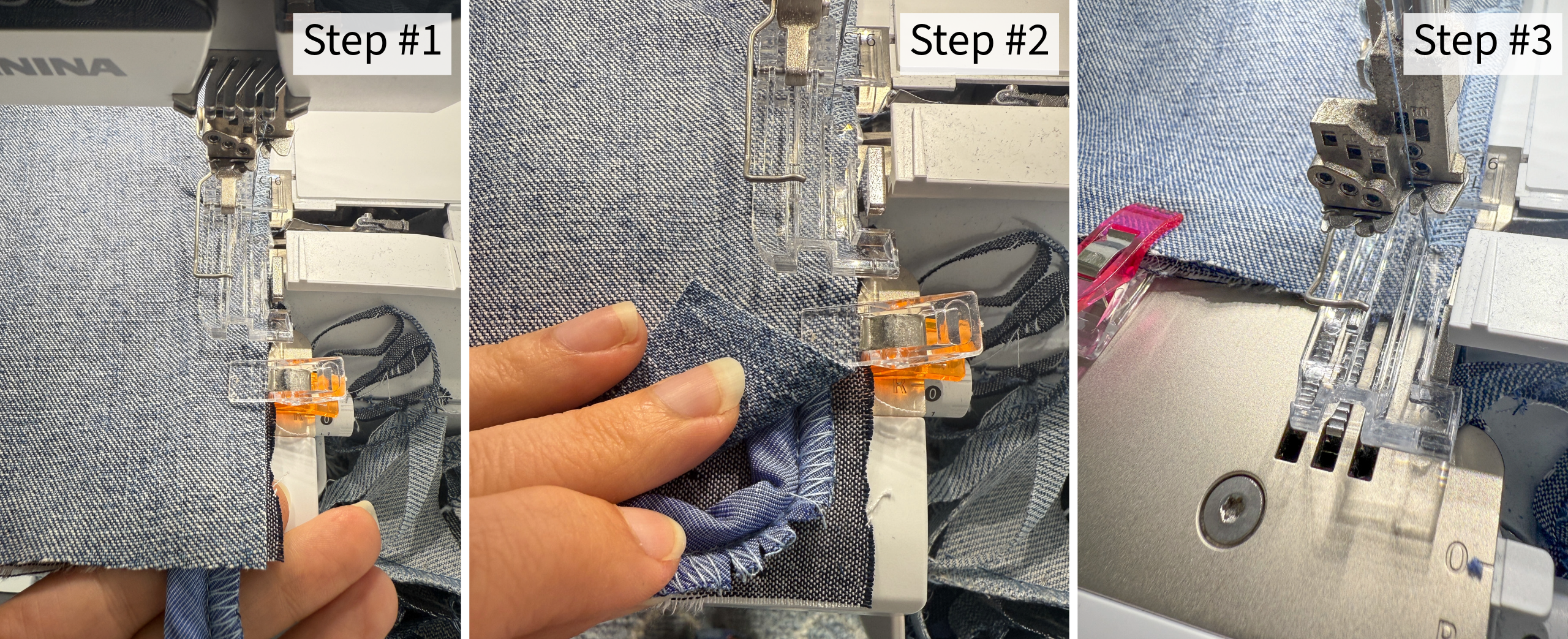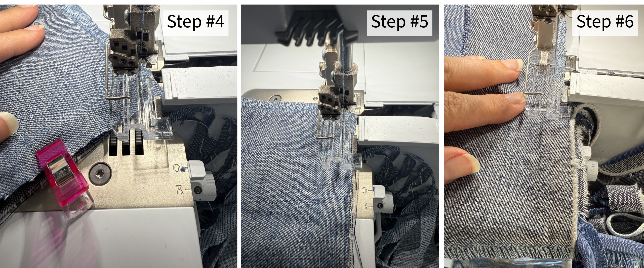 - After you have sewn a couple inches, check where you have sewn to make sure all the layers are catching in the overlock.