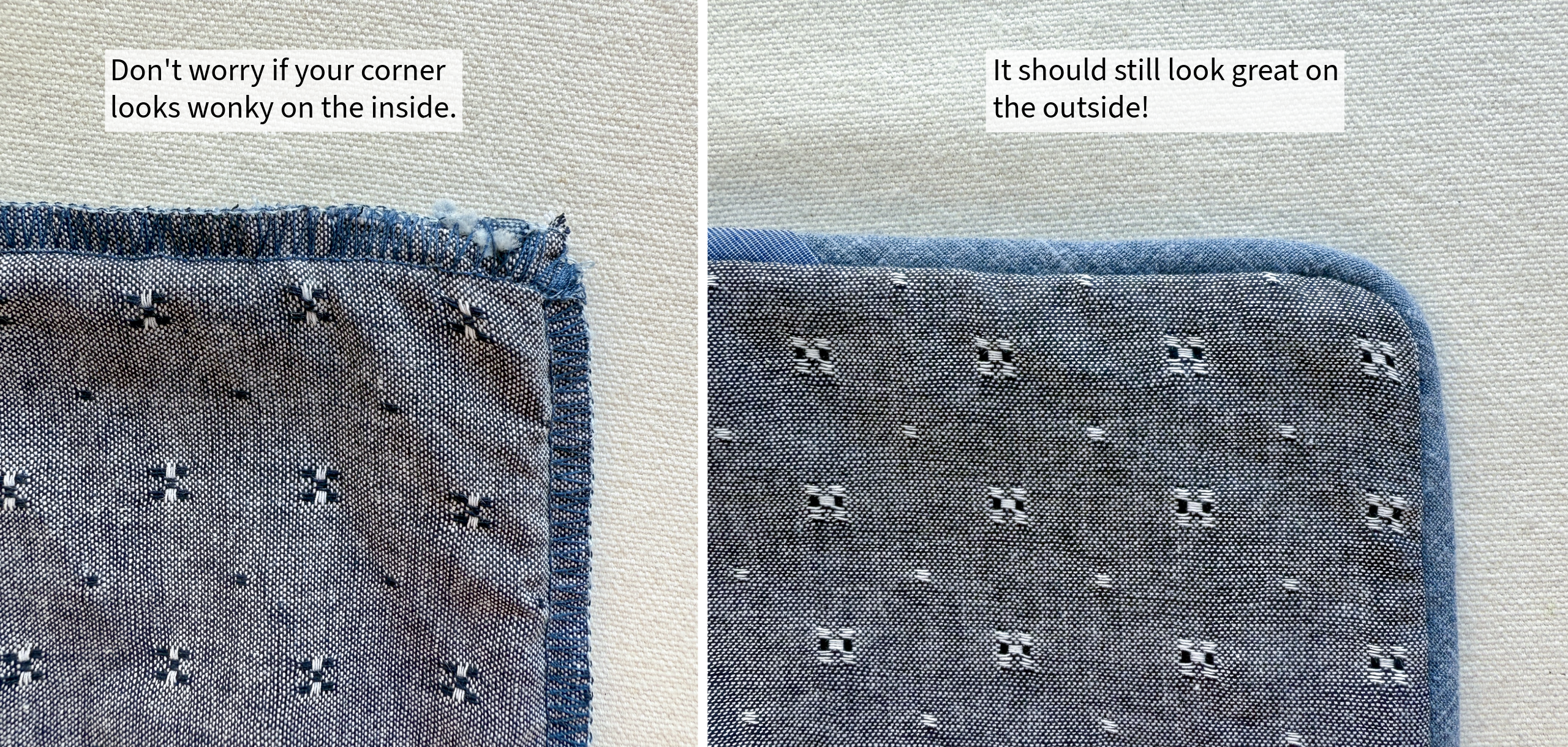 I try to give myself some grace when working with these materials, and you should also. And speaking of grace, if your corners end up looking as wonky as my corners, don’t worry! They might look messy on the inside, but once you turn them right side out, they almost always look great.