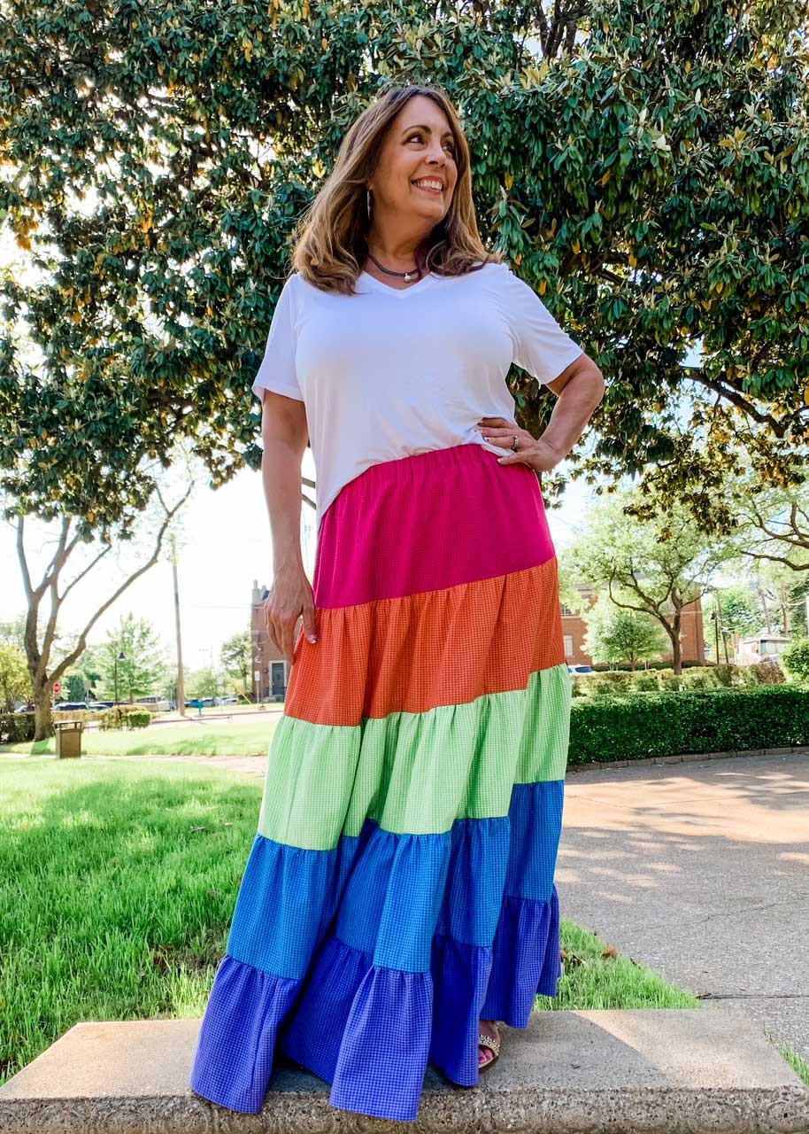 Multi-tiered rainbow maxi skirt worn by sharon sews