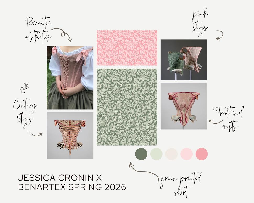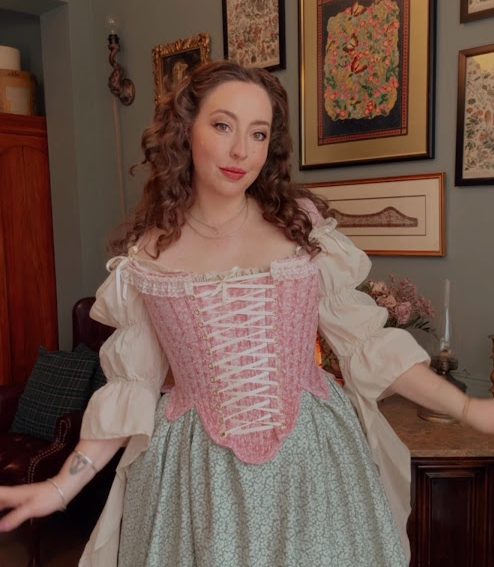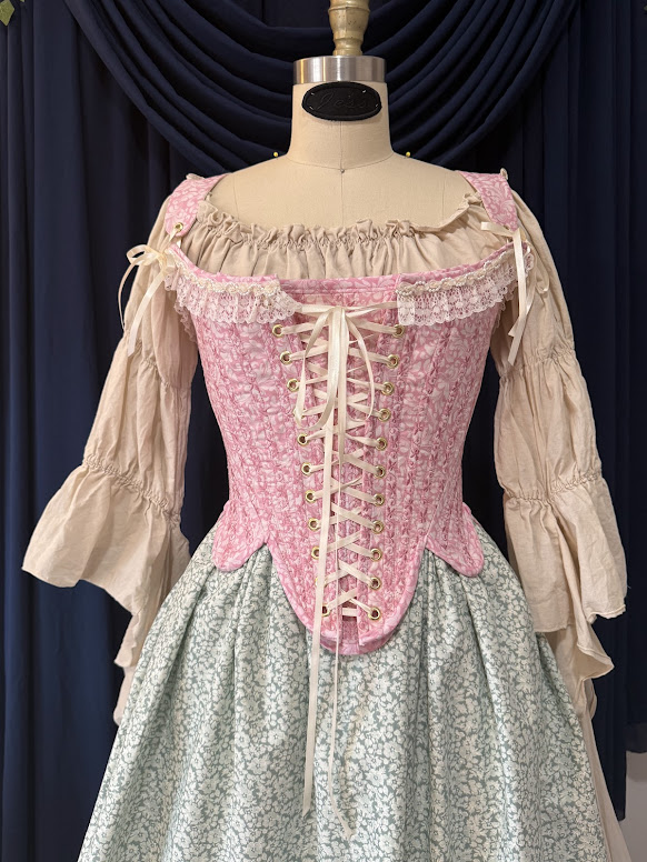 Every now and then, I make something that I’m completely enamored with, and right now, it is this 18th-century pair of stays I made using the Lovely Scrolls Light Pink from Benartex.