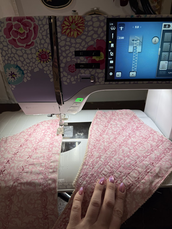 For this project, I used the Isacord Thread in color 2153 Dusty Mauve, which just elevated this project even more. The color worked nicely with the pink tone of the Benartex Fabric. I used decorative stitch motif 107 on my BERNINA machine–it is one of the stitches that the machine comes with, and I think it really turned out lovely, complementing the scroll work motif of the Benartex fabric well. I love to add decorative stitching to my corsets, and whenever I am sewing these out on the machine, I can’t help thinking, “Thank goodness I have this BERNINA or this would be taking FOREVER!” Decorative stitching is a really fun detail I encourage you all to try in your own projects! I constantly find myself thinking, do I add decorative stitching to this project all the time now.