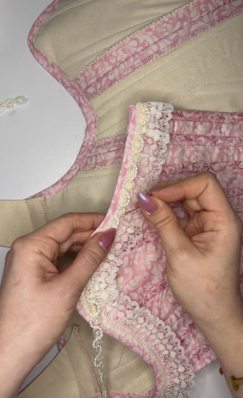 I wanted to make this corset even more playful and sweet, so I went ahead and added some lace trim and beaded pearl rose trim to the top line of the stays. It’s little details like these that bring me so much joy!