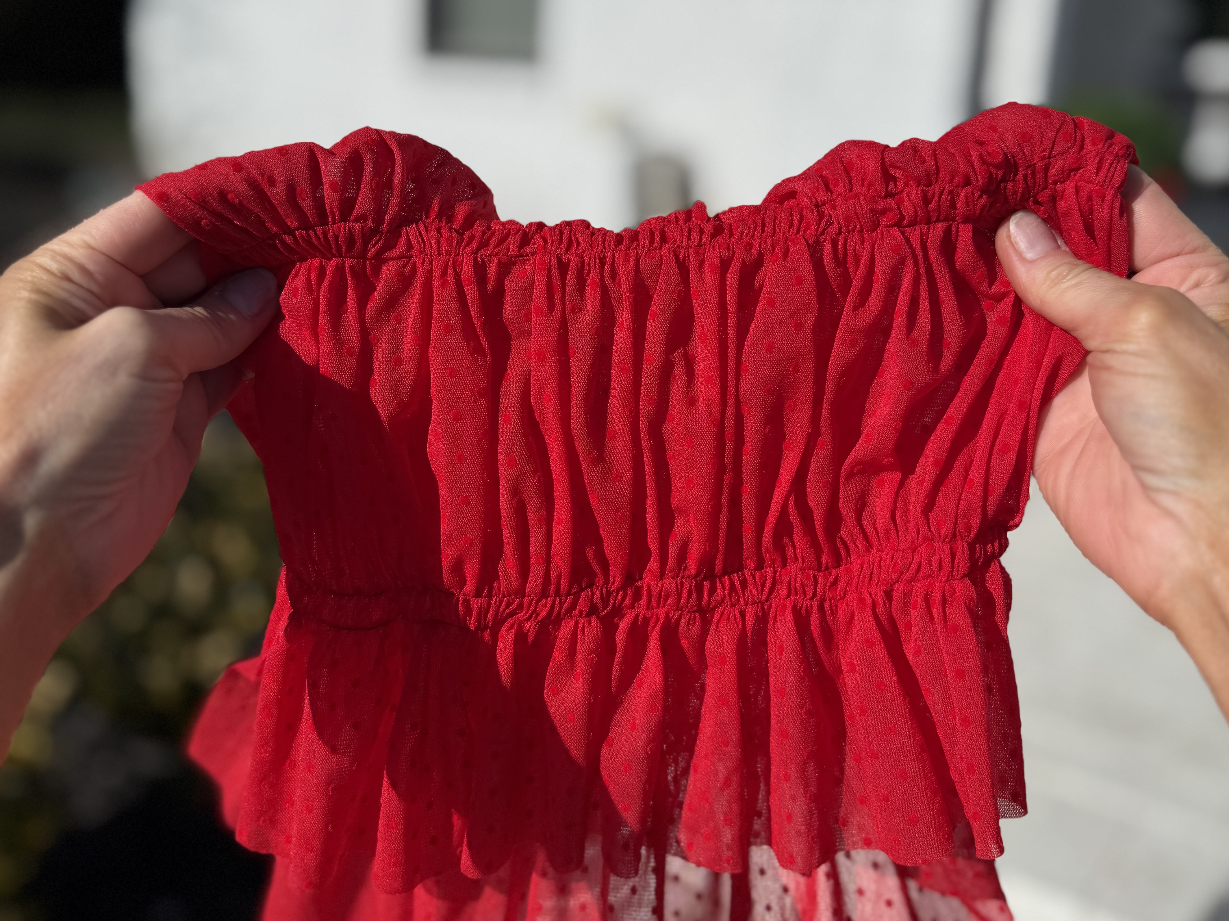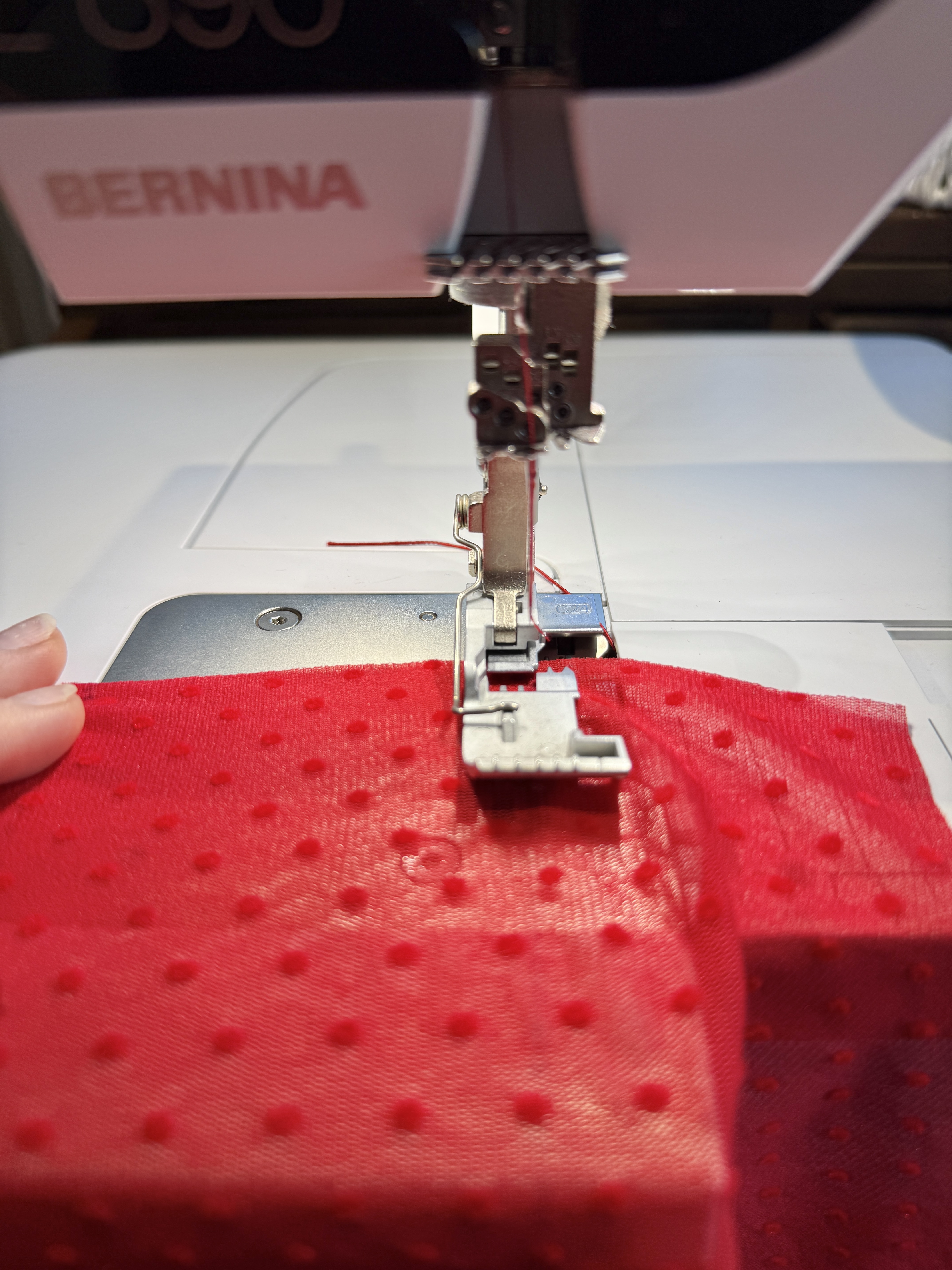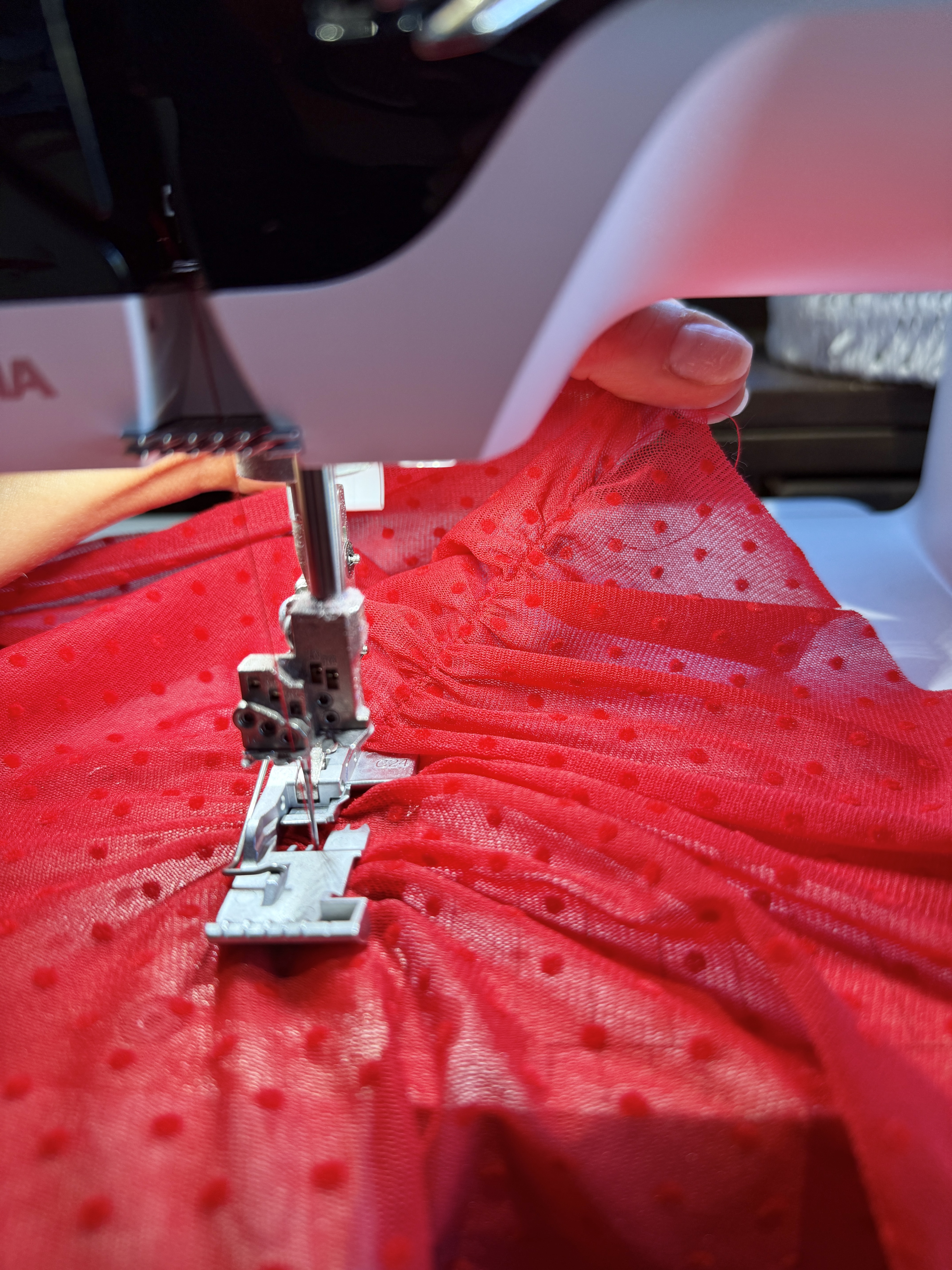 For the fabric, I am using a thin sheer mesh fabric featuring small polka dots. My plan is to create a sheer top to wear over a red tank for Valentine’s Day!