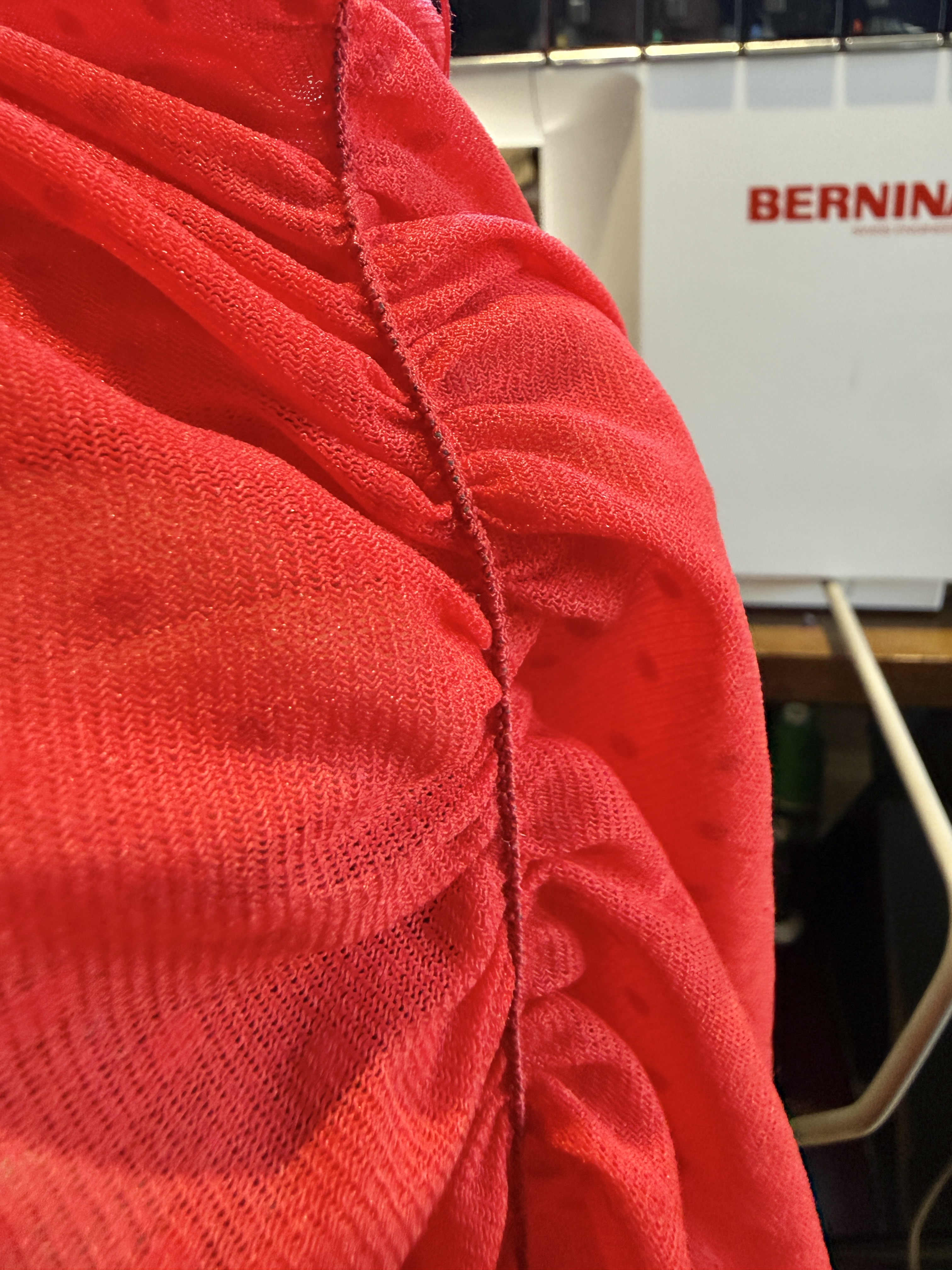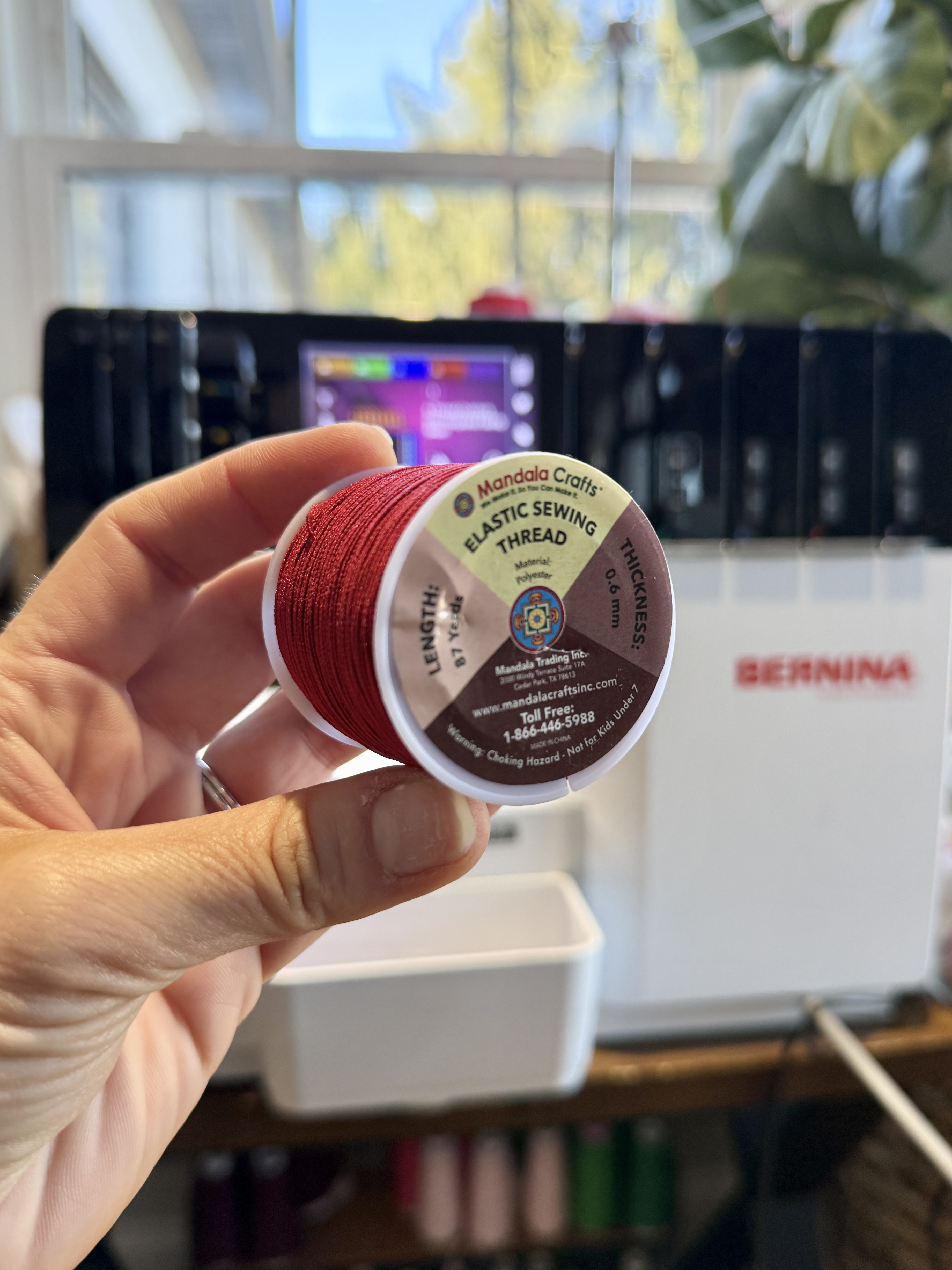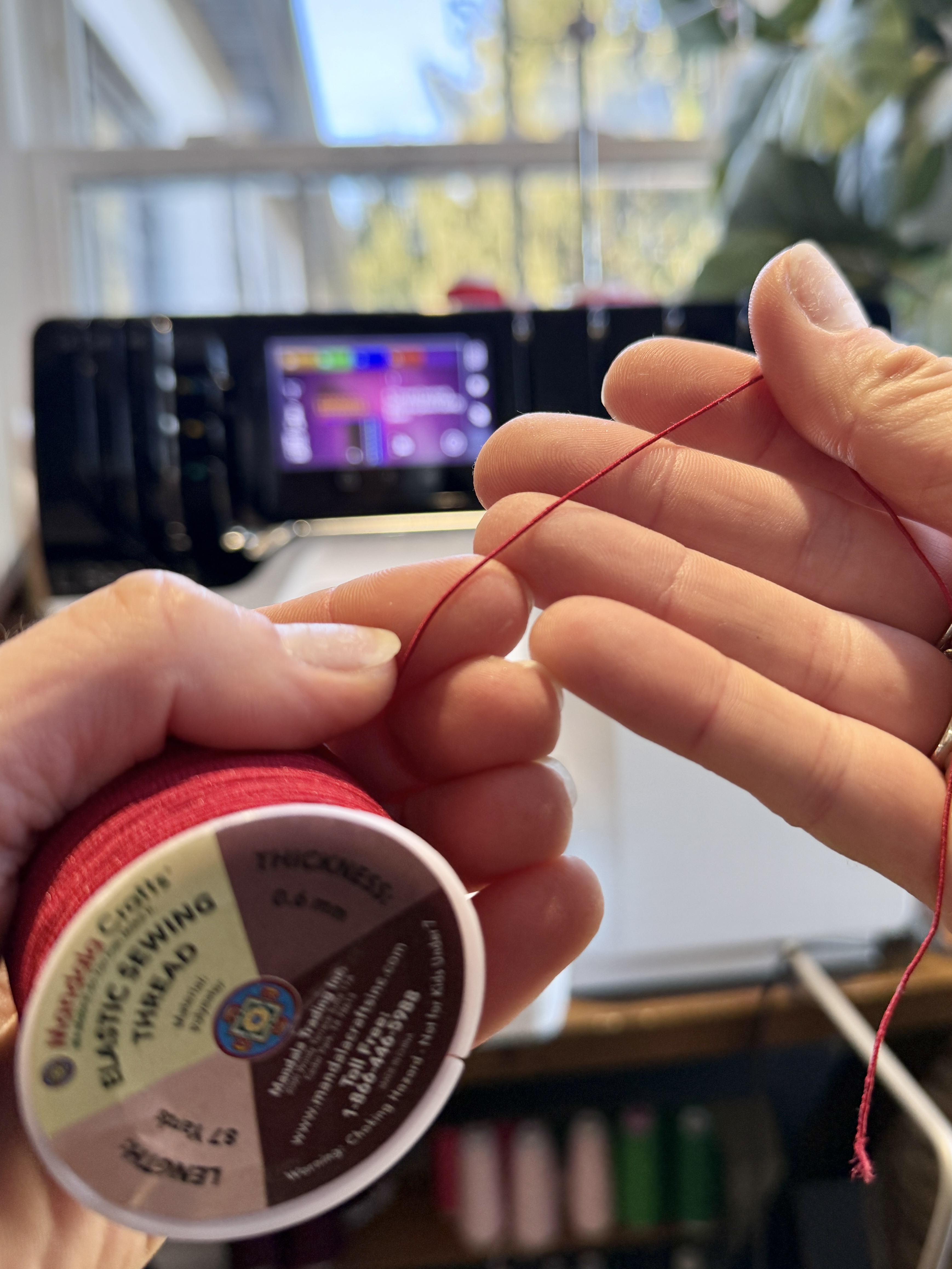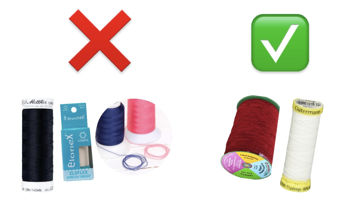 For this technique, you will need to purchase Elastic Thread. Unlike flexible thread (like Eloflex, Seraflex, or Wooly Nylon thread) that stretches slightly once sewn, elastic thread is a speciality thread which allows seams to stretch significantly without breaking. It essentially is elastic wound together in a small thread form.