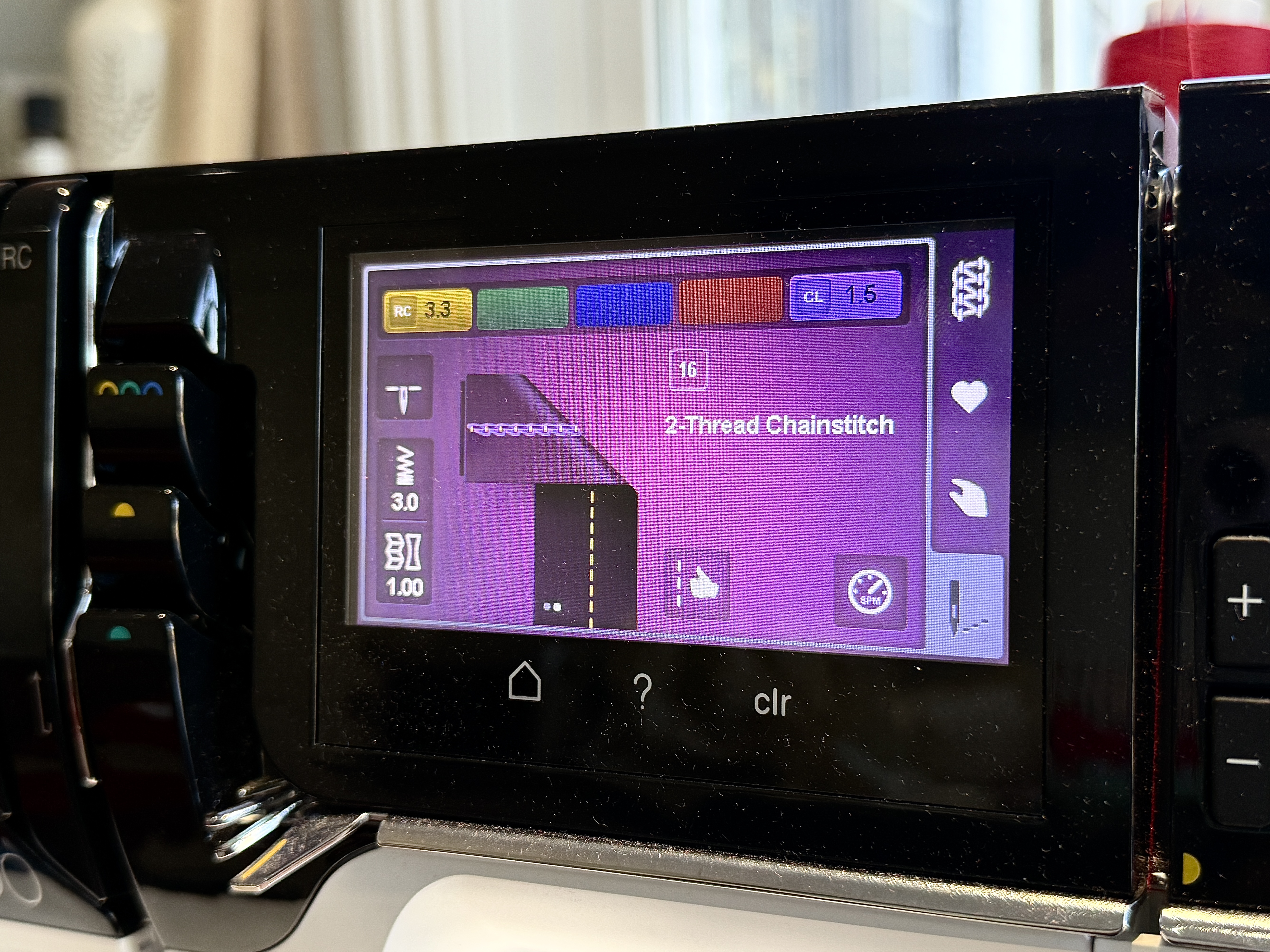 Select the chain stitch, and do not adjust any of the settings. (The settings would only be adjusted if not using elastic thread.) The elastic thread will be doing the gathering for us.