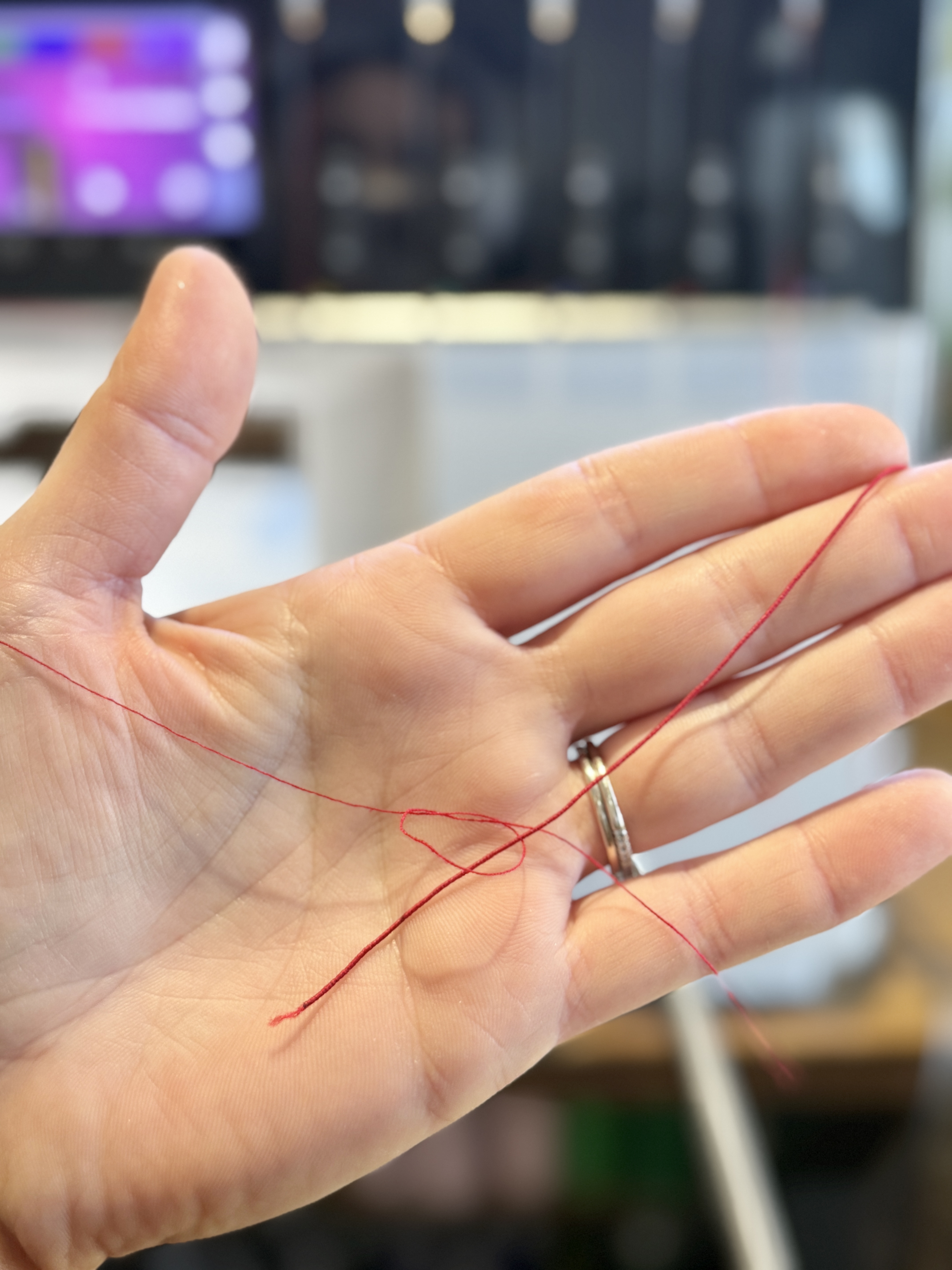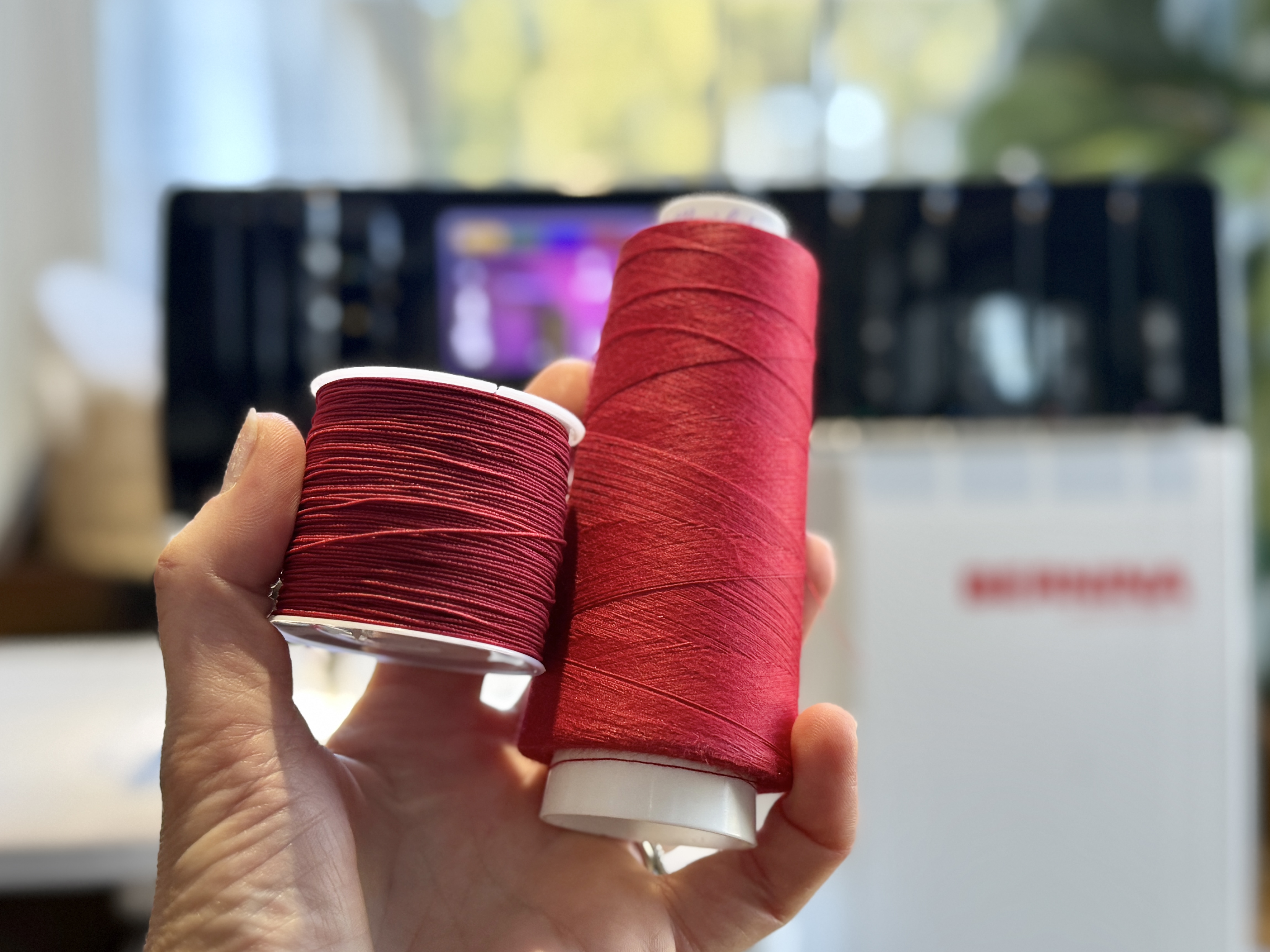 You will notice that elastic thread is much thicker than regular thread.