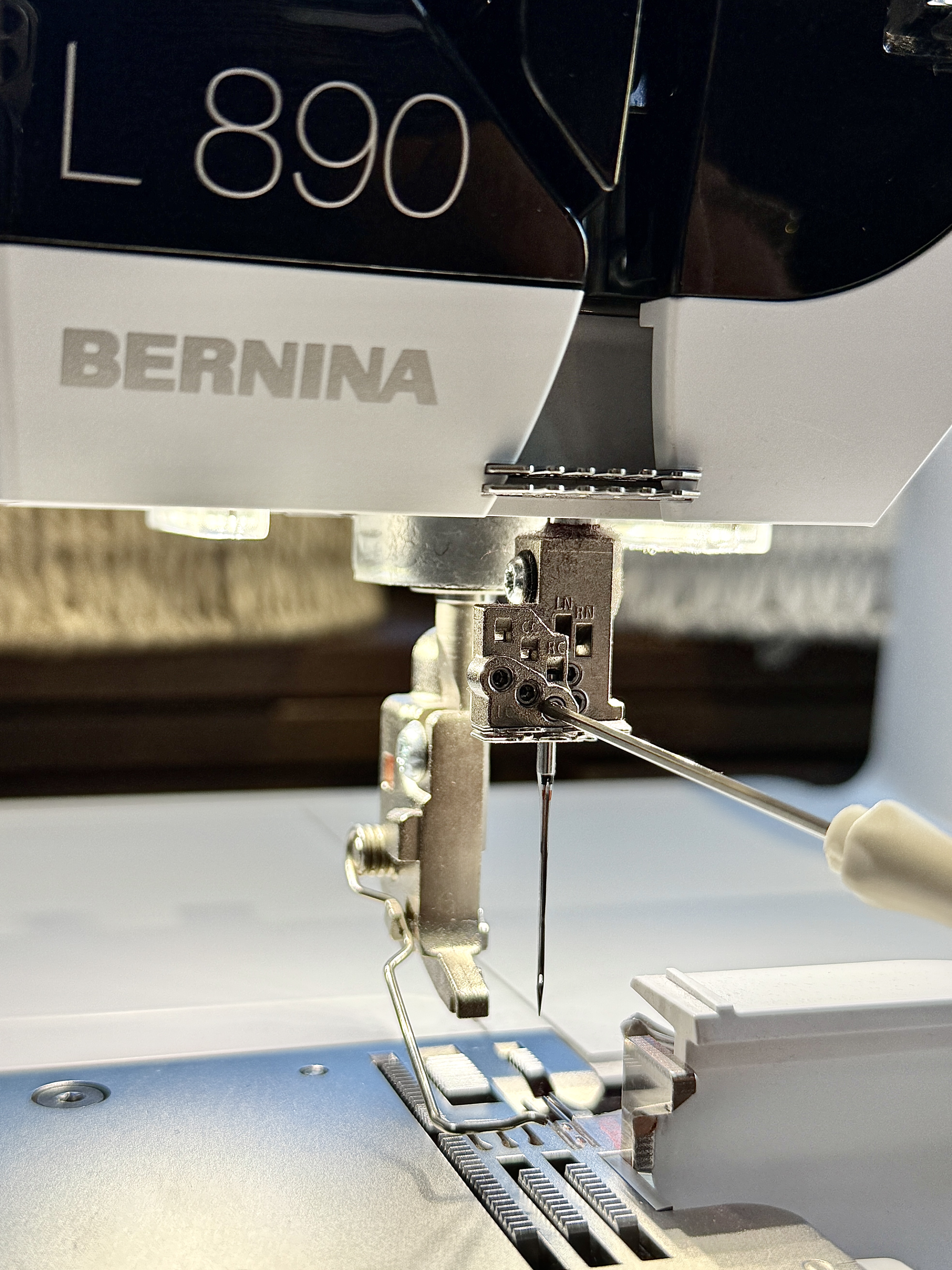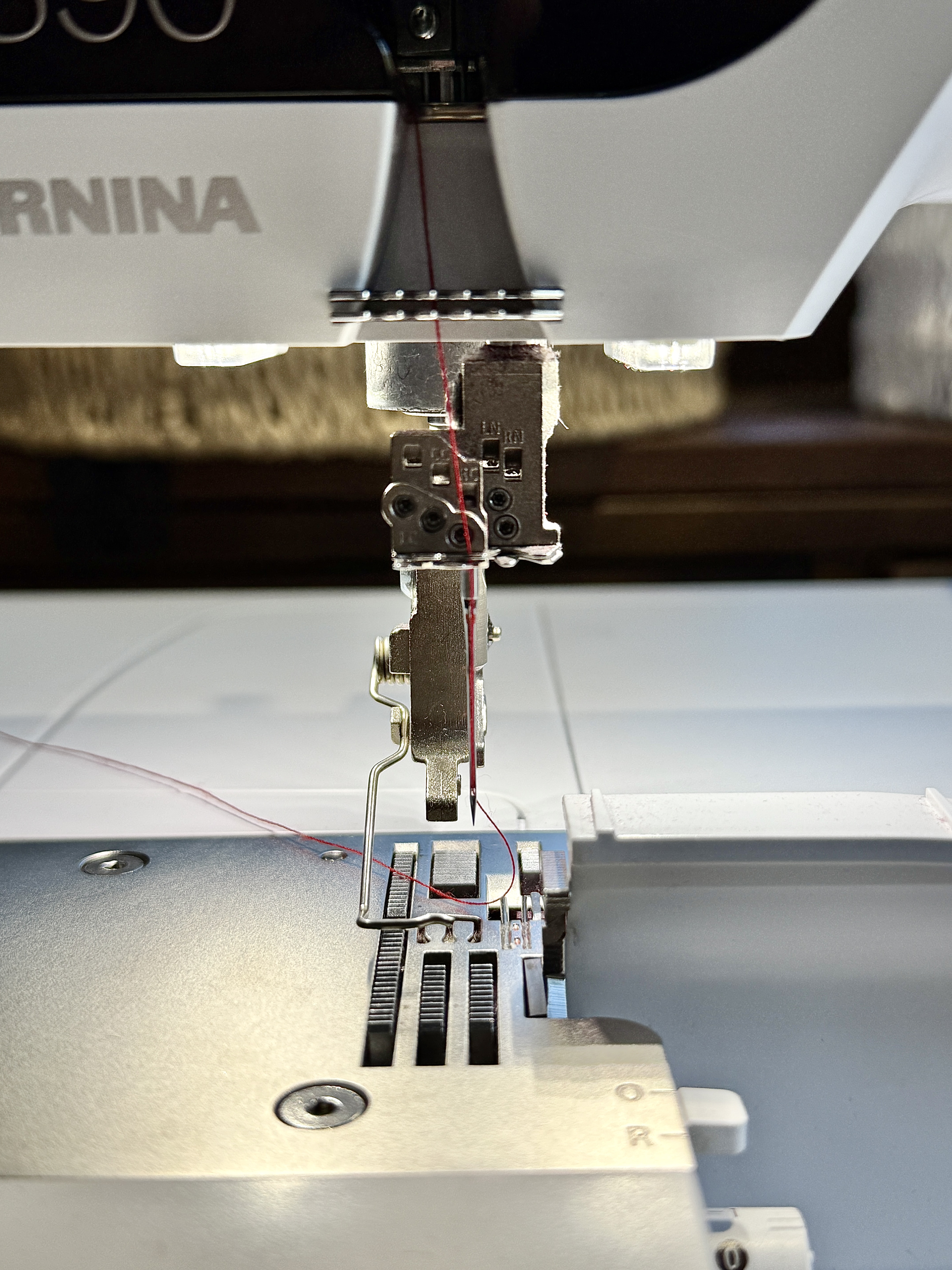 Now that the machine is threaded, attach the Shirring Foot.