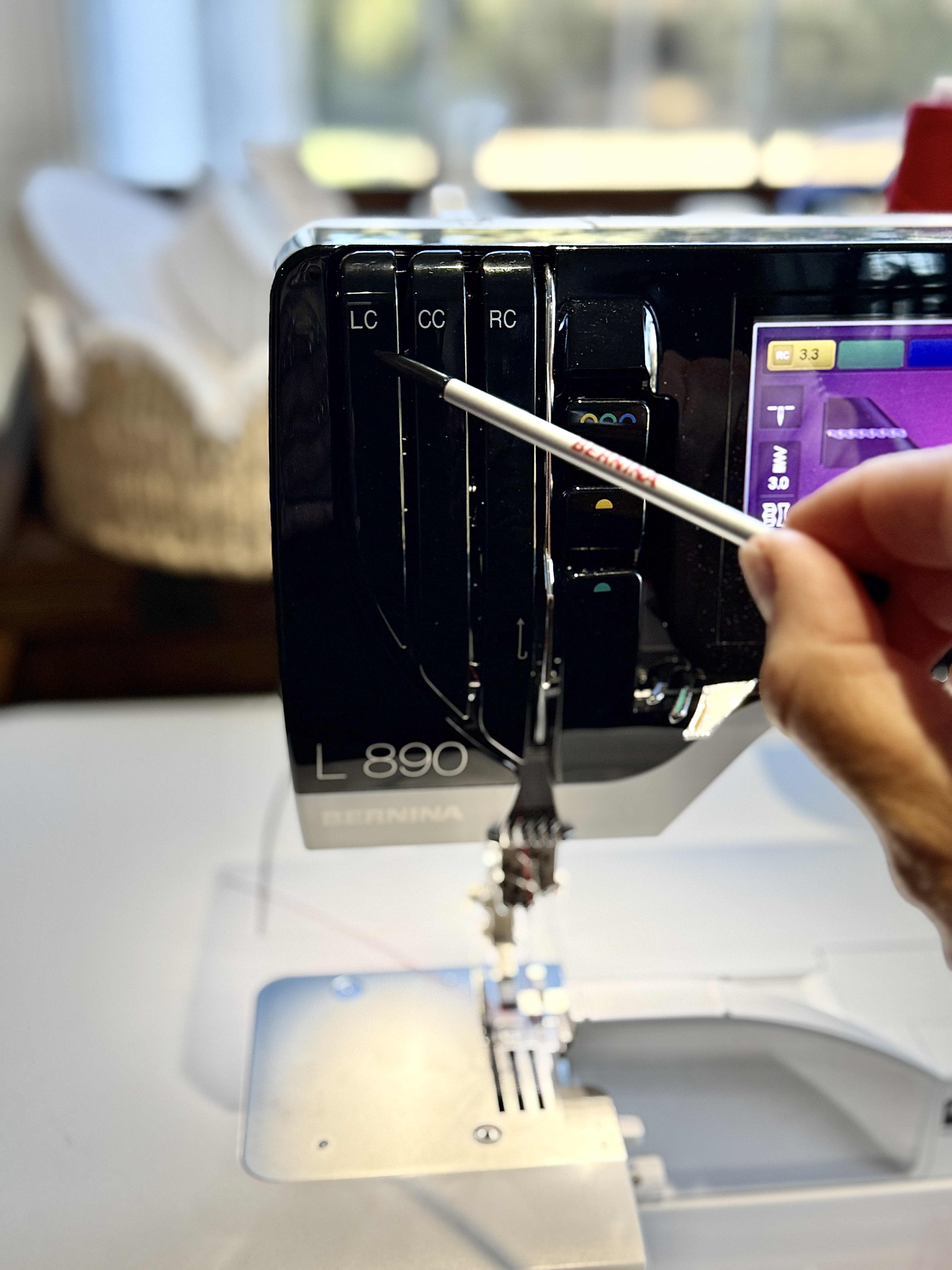 But we will remove it from the tension discs. This allows the fabric to glide easily through the hook without stretching.