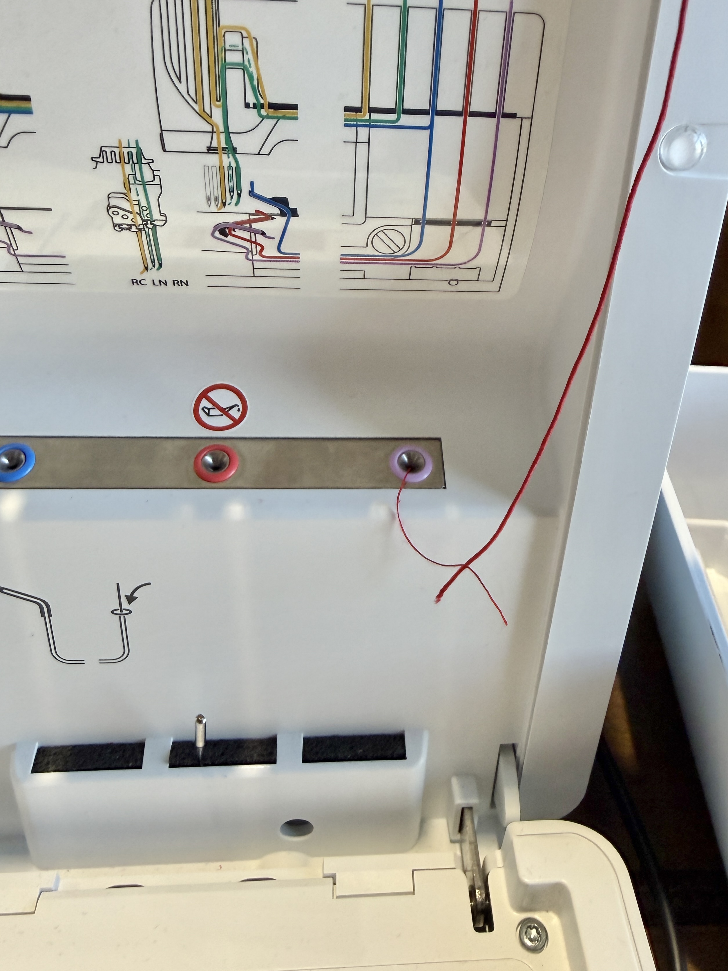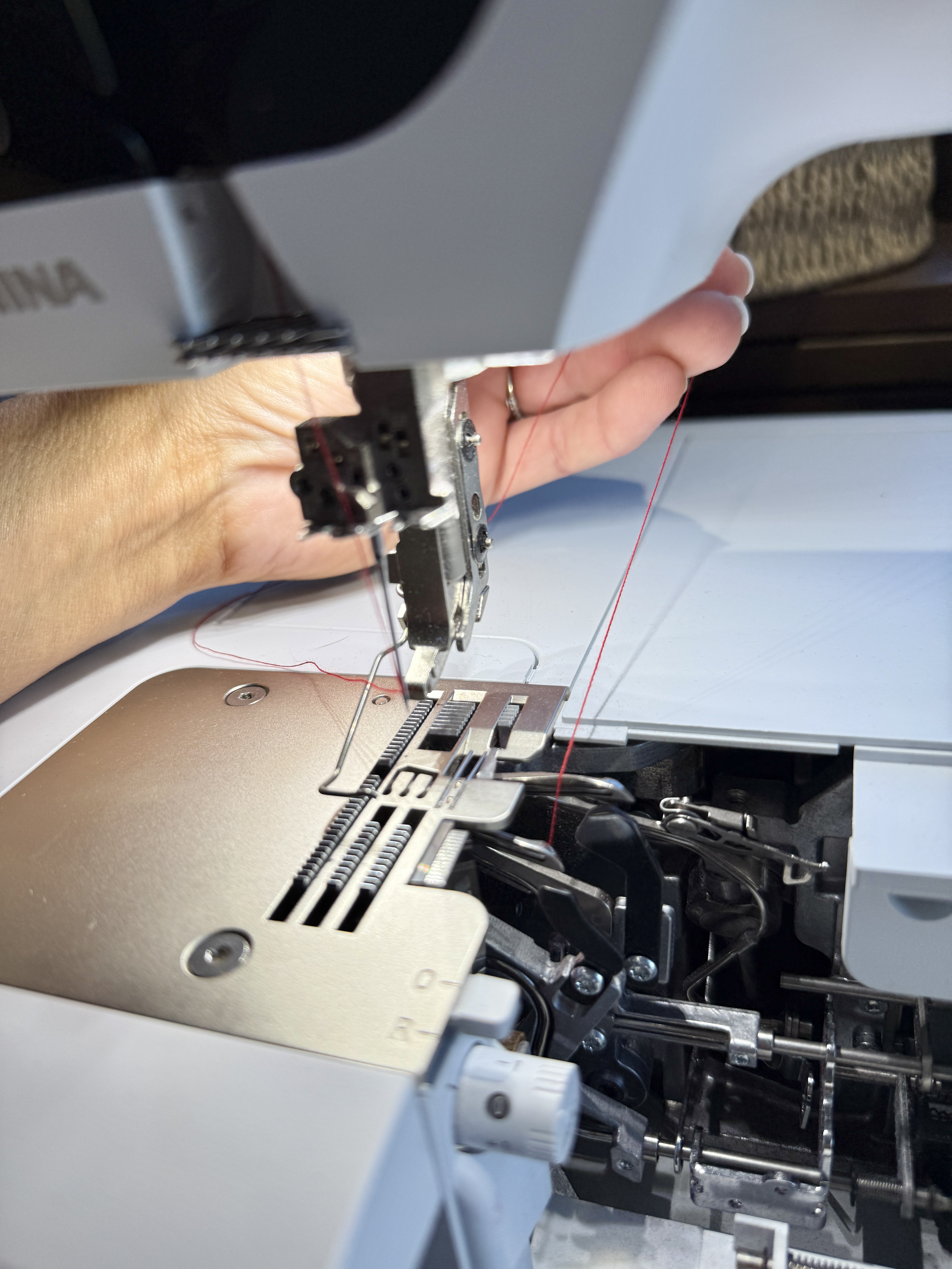 Now feed the regular thread through the lower looper using the air threading function until the thread spits out on the other side.