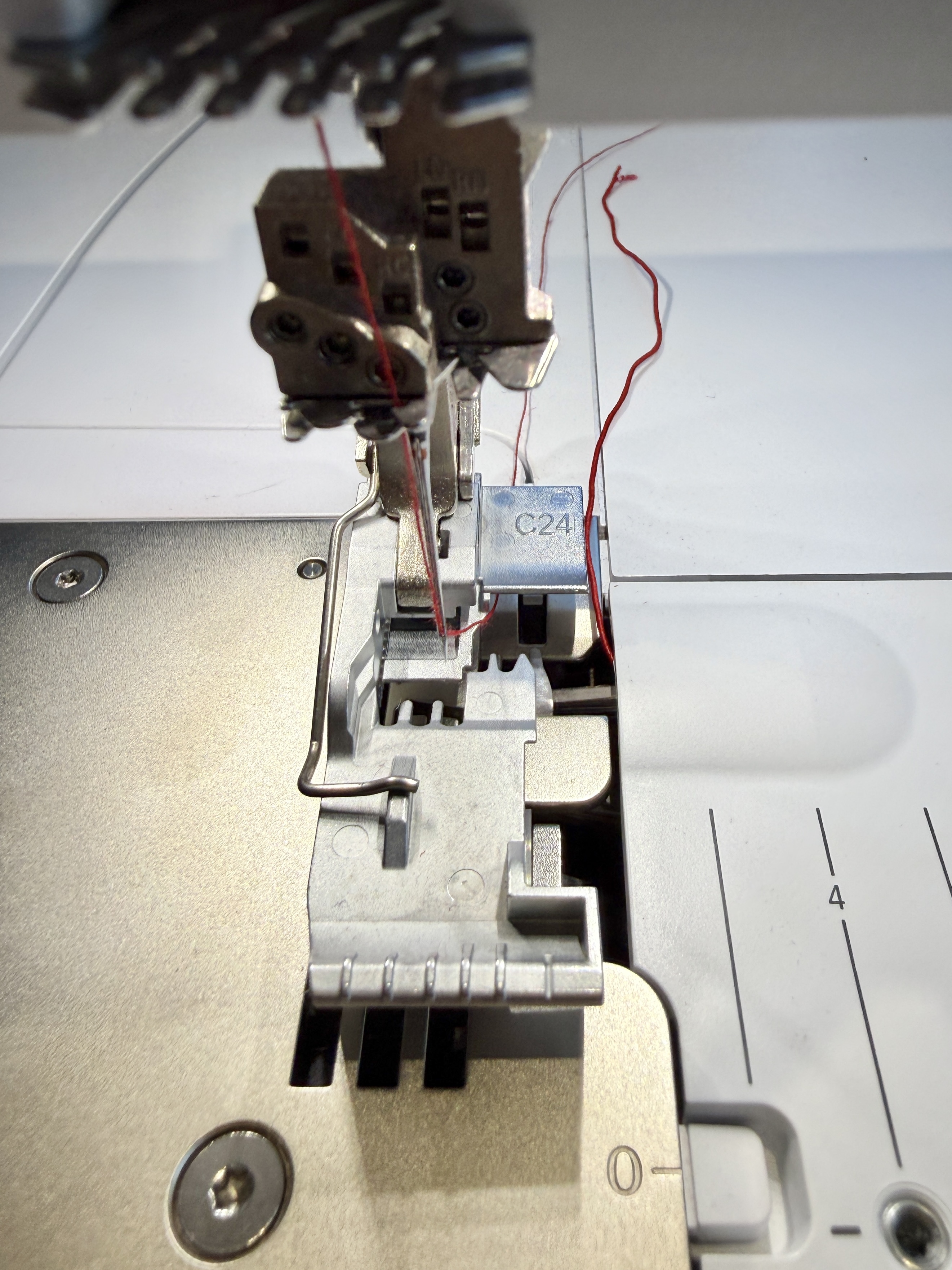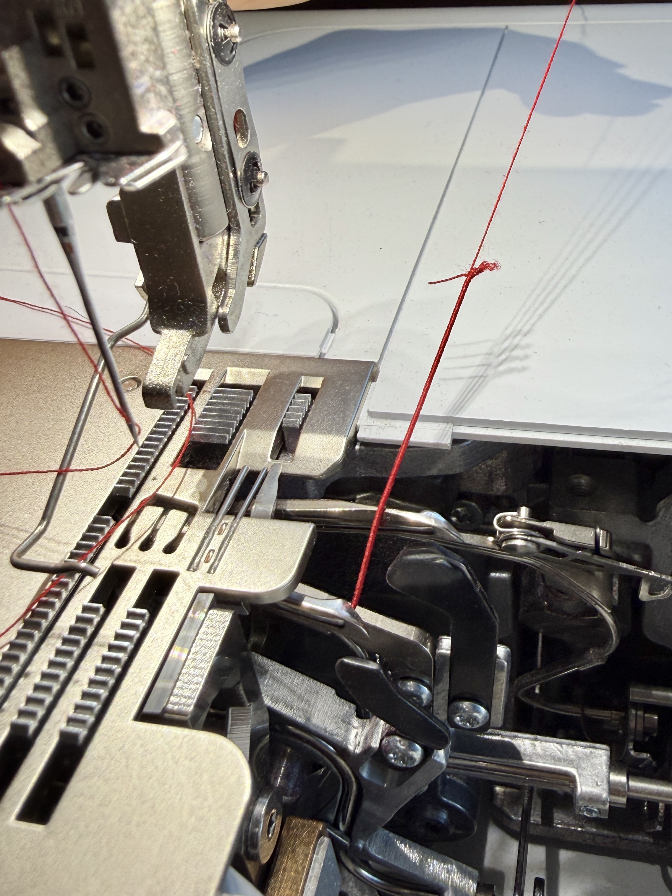 Grab the thread and continue pulling through the lower looper until the elastic thread reaches the other side. Cut the regular thread off and guide the elastic under the needles.